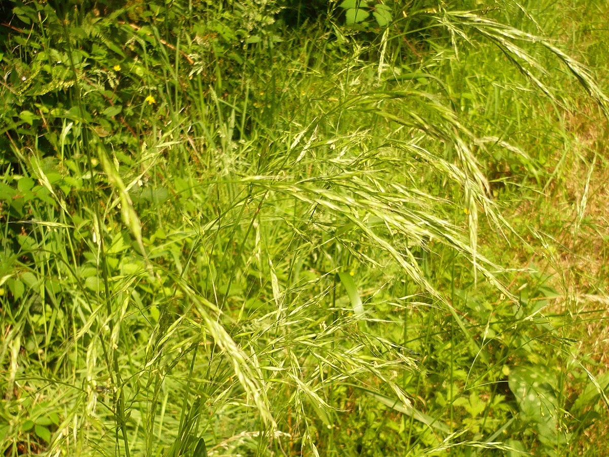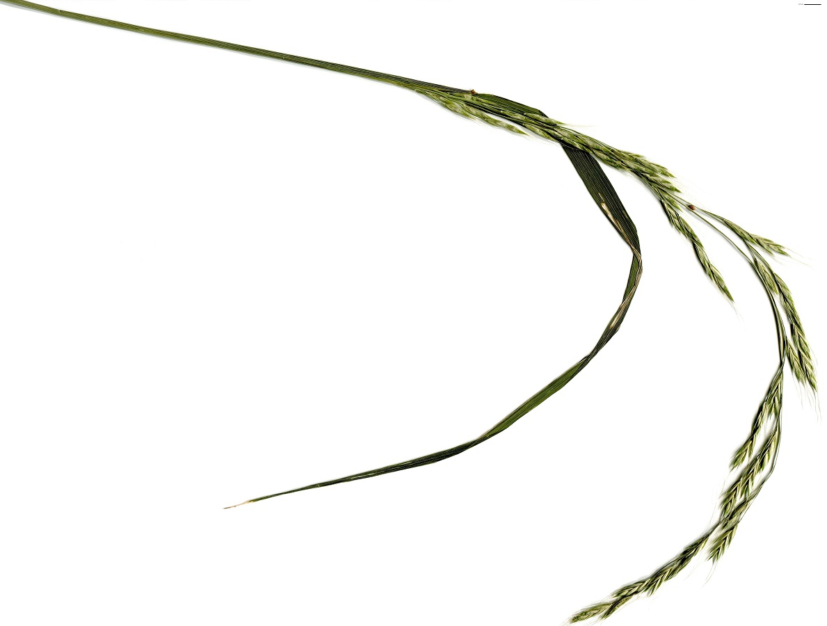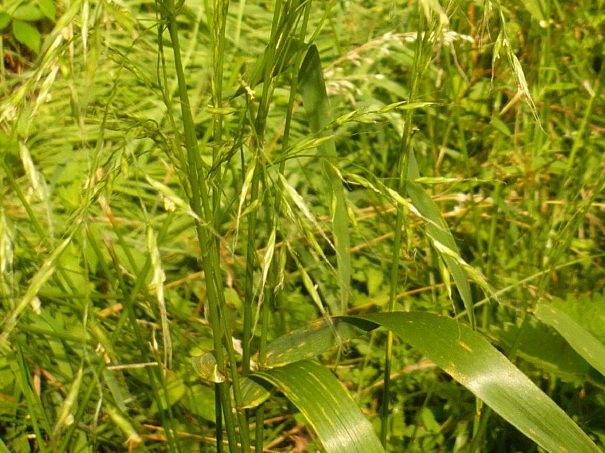 Hc – 8-20 dm – Feuilles planes larges, souples, glabres, les > à oreillettes embrassantes – Panicule ample pendante vert pâle, lemme scabre à longue arête flexueuse