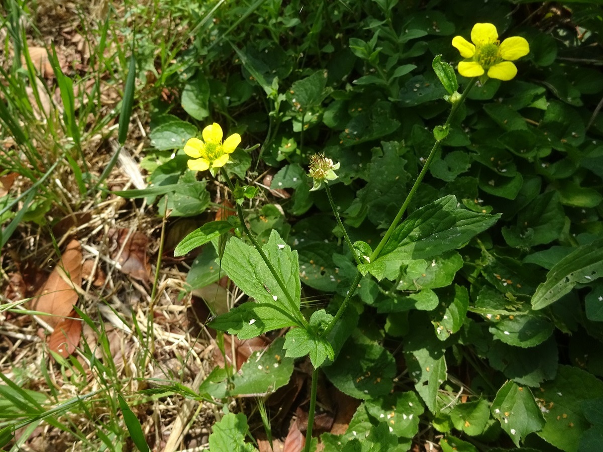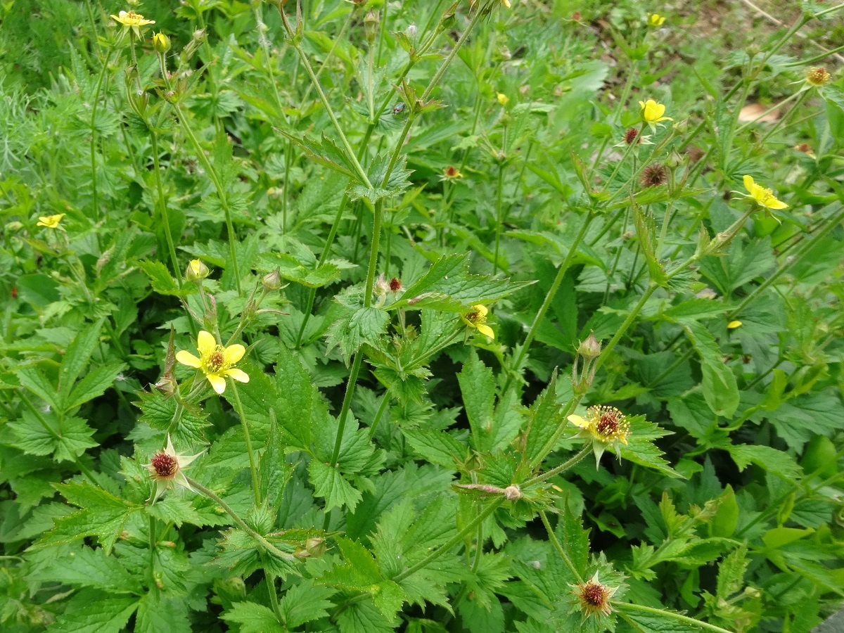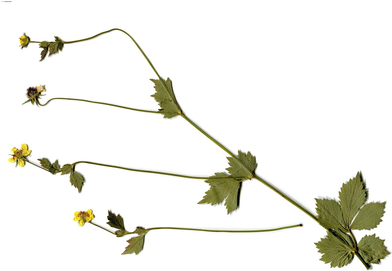 Hc – 3-6 dm – Tige ± ramifiée, feuilles à 5-7 segments en losange dentés, les terminaux + grands – Petites fleurs de Ø ≃ 1 cm jaunes – Akènes en tête sessile dense, arête rougeâtre