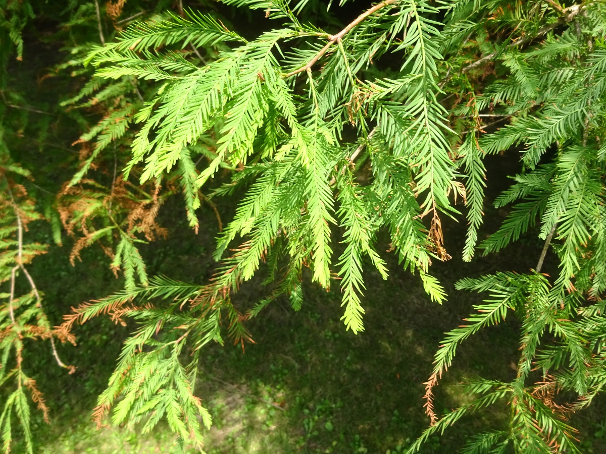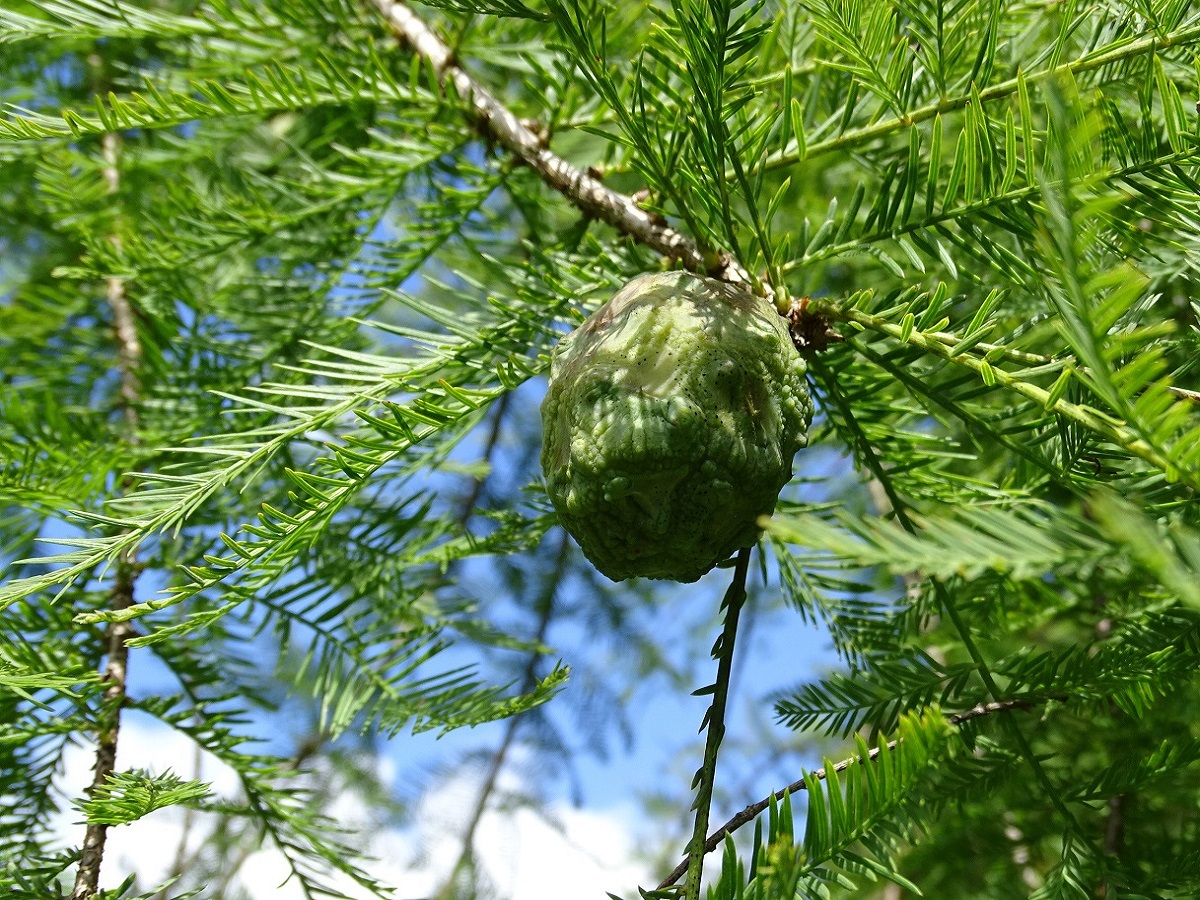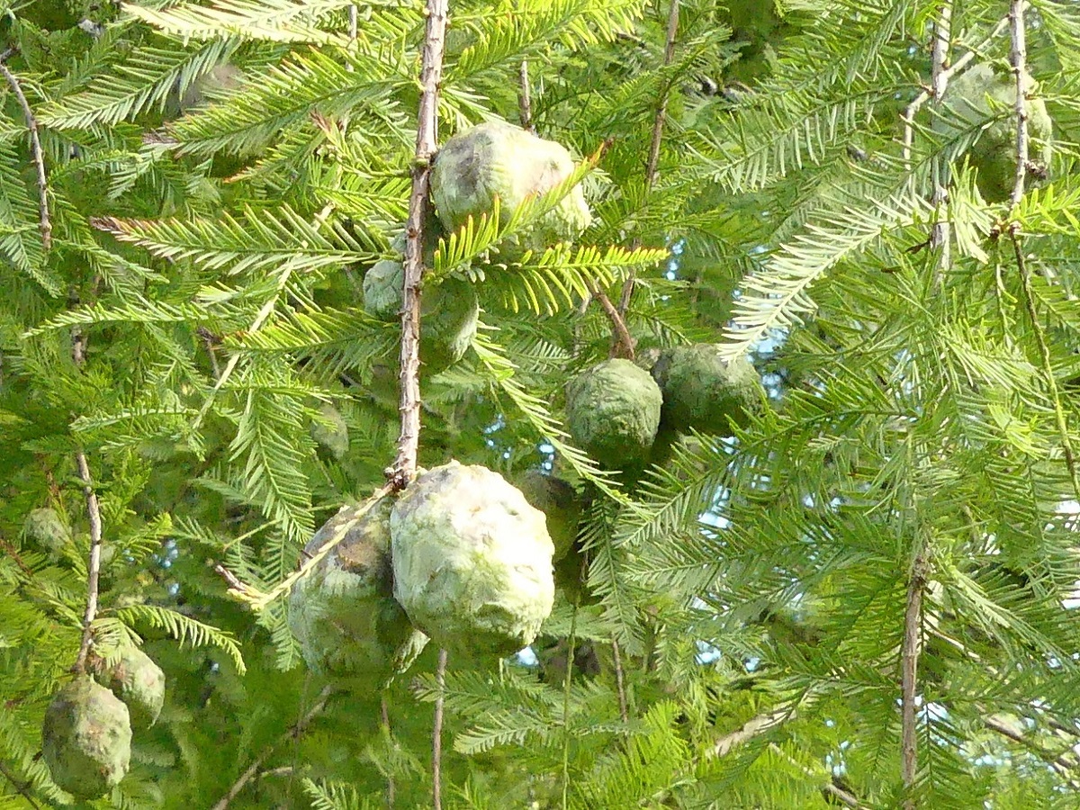 Ph – 10-30 m – Écorce brun rougeâtre s’exfoliant, feuillage caduc vert puis fauve, à aiguilles linéaires courtes, souples, alternes – Cônes ♀ globuleux de Ø 2-3 cm, restant sur l’arbre