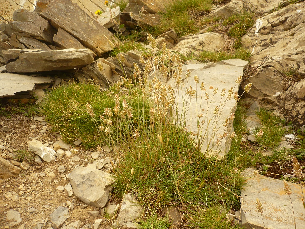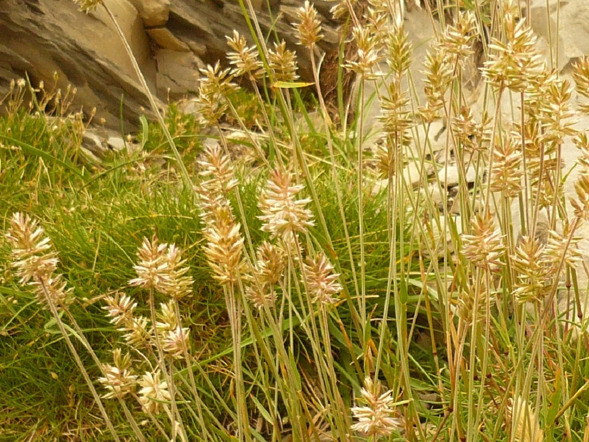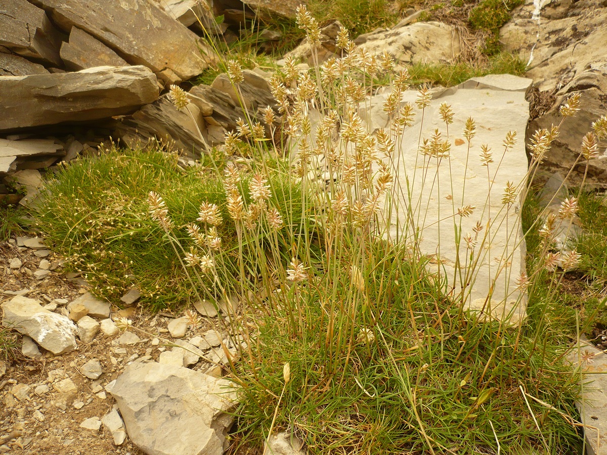 Hc – 1-2 dm – Feuilles basales convolutées à enroulées en gazon dense, ligule courte – Panicule dressée courte ± ovoïde aplatie, épillets sur 2 rangs opposés, lemme velue, arête ~ nulle