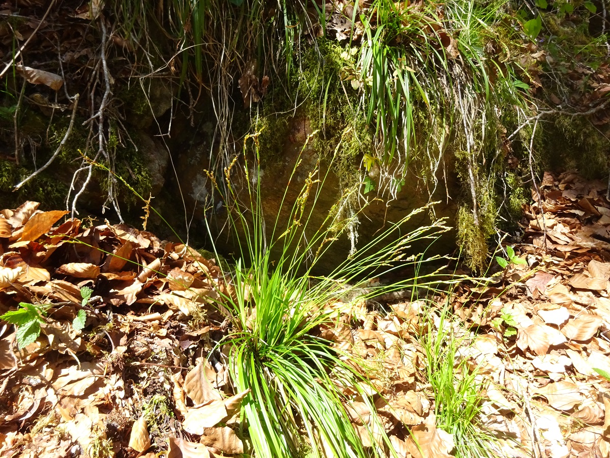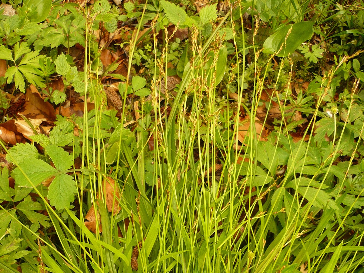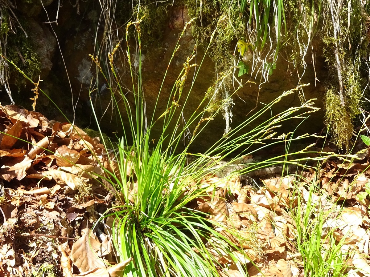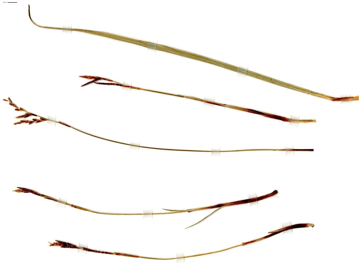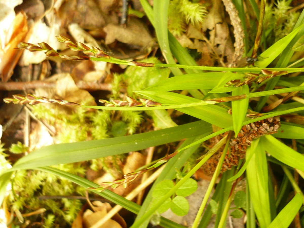 Hc – 1-3 dm – Feuilles à gaine basale rouge – 1 Épi ♂ ± >, 2-3 épis < ♀ L de 1-2,5 cm lâches écartés, l’< pédonculé, écailles longues, 3 stigmates – Utricules de L ≃ 4 mm velus, à bec court