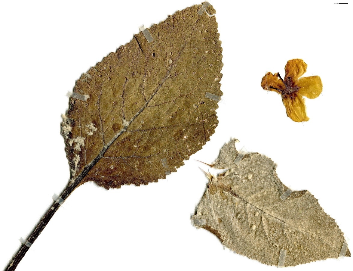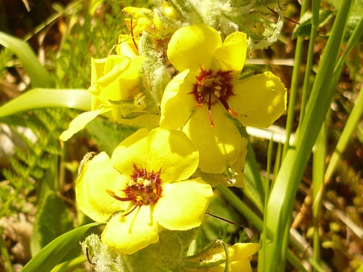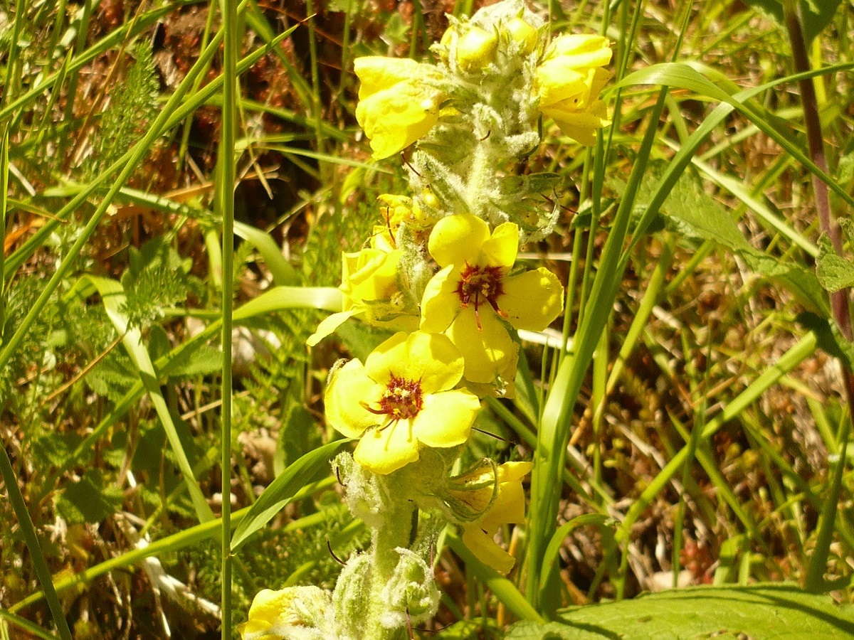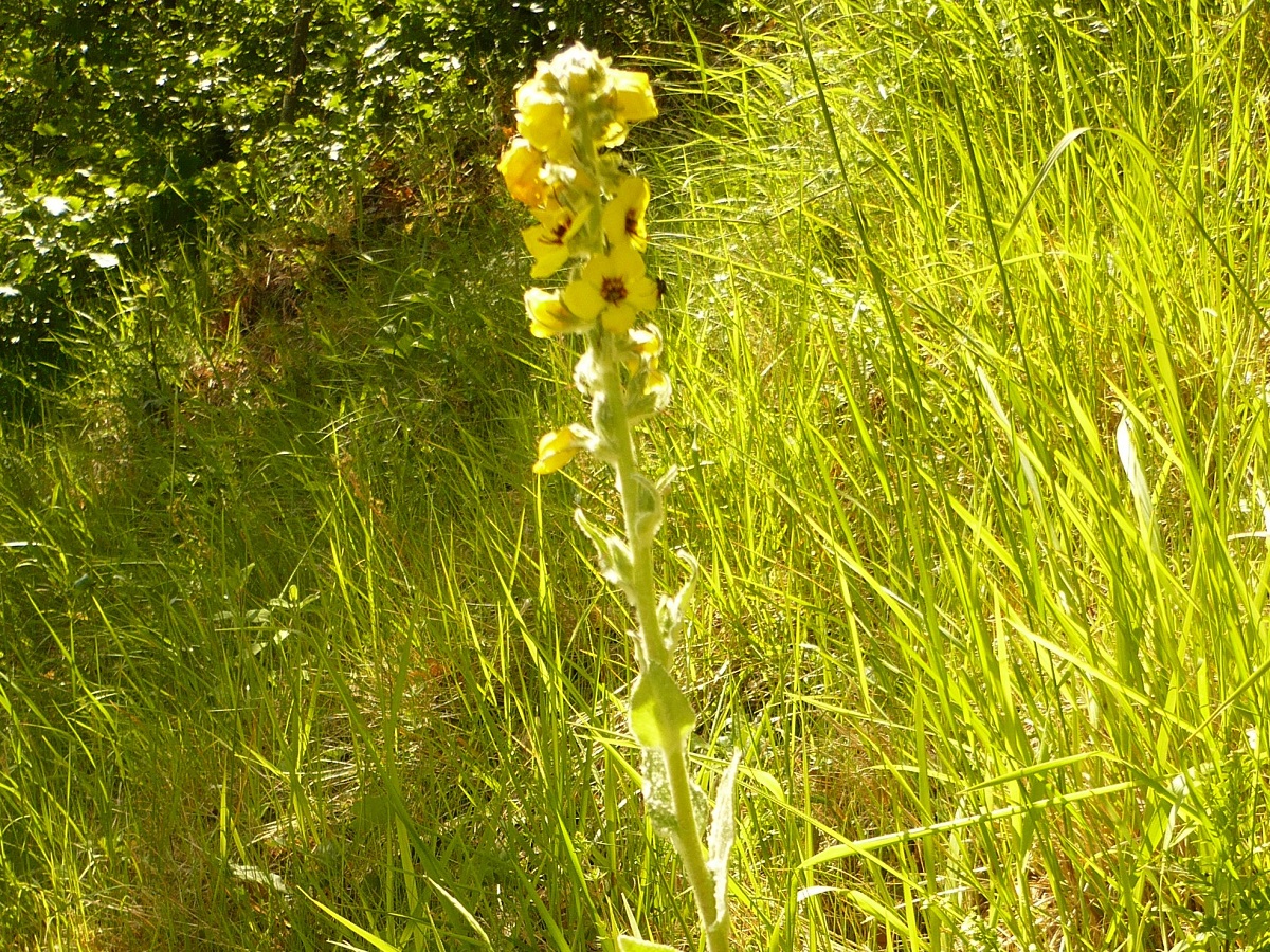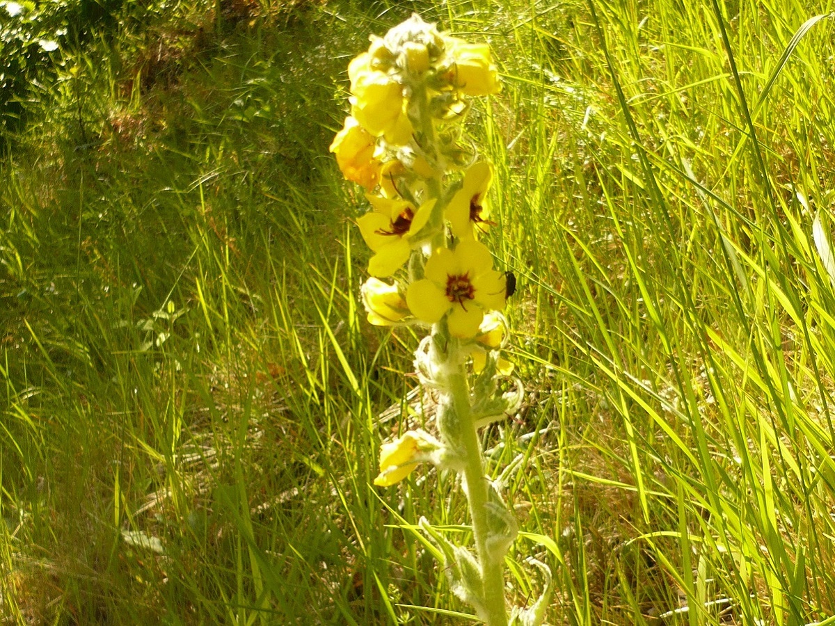 Hc – 4-12 dm – Feuilles ovales crénelées velues floconneuses, pétiolées – Fleurs jaunes de Ø 2-3 cm à pédicelle < calice, étamines à poils violets – Capsule ovoïde L de 6-10 mm
