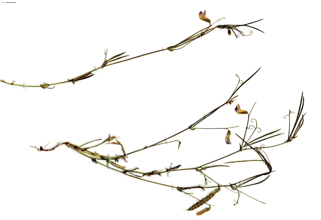 Th – 2-5 dm – Tige anguleuse, feuilles à 2 folioles L de 2-6 cm linéaires, avec vrille – Fleur solitaire à pédoncule long à pointe courte, corolle L de 6-13 mm rouge bleuâtre – Gousse glabre