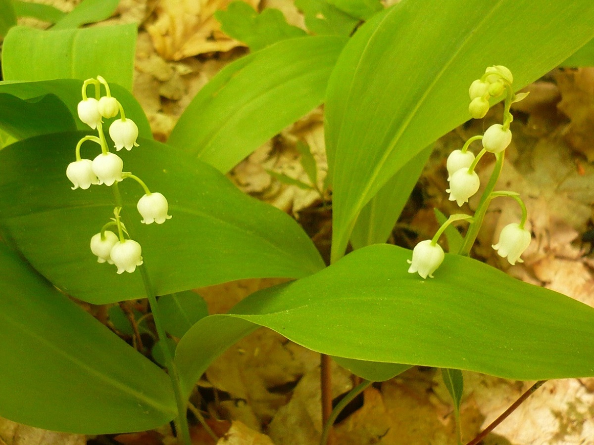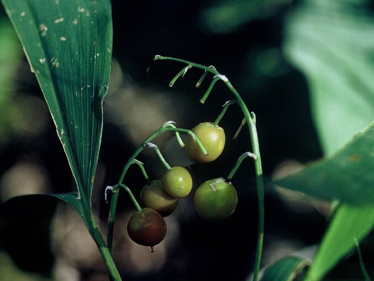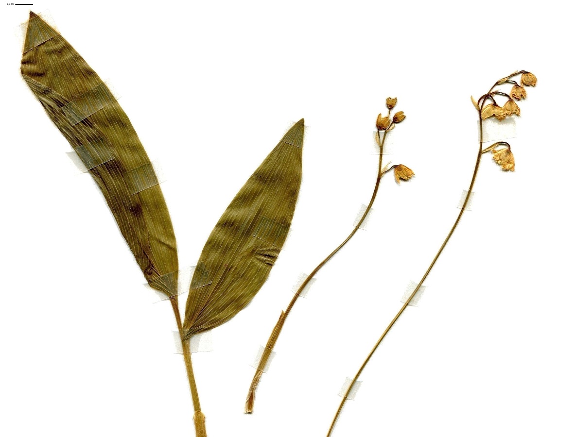 G à rhizome – 1,5-2,5 dm – Feuilles larges, ovales-aiguës, réunies par deux – Grappe unilatérale de fleurs pendantes blanches en clochette parfumée – Baie globuleuse rouge