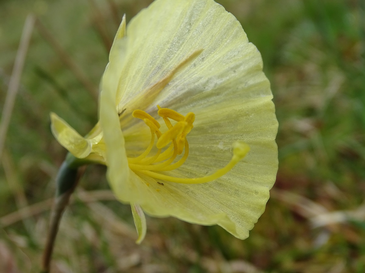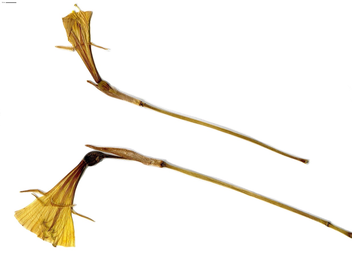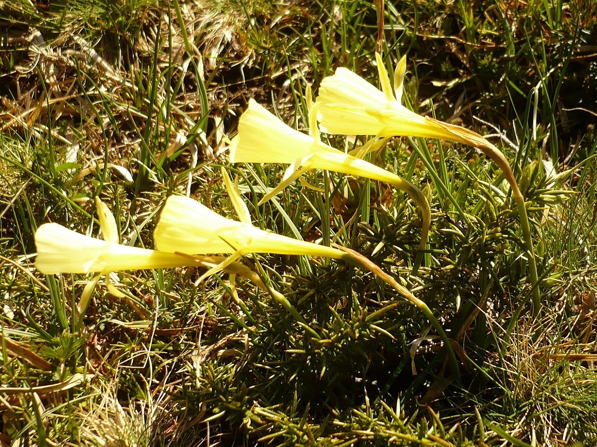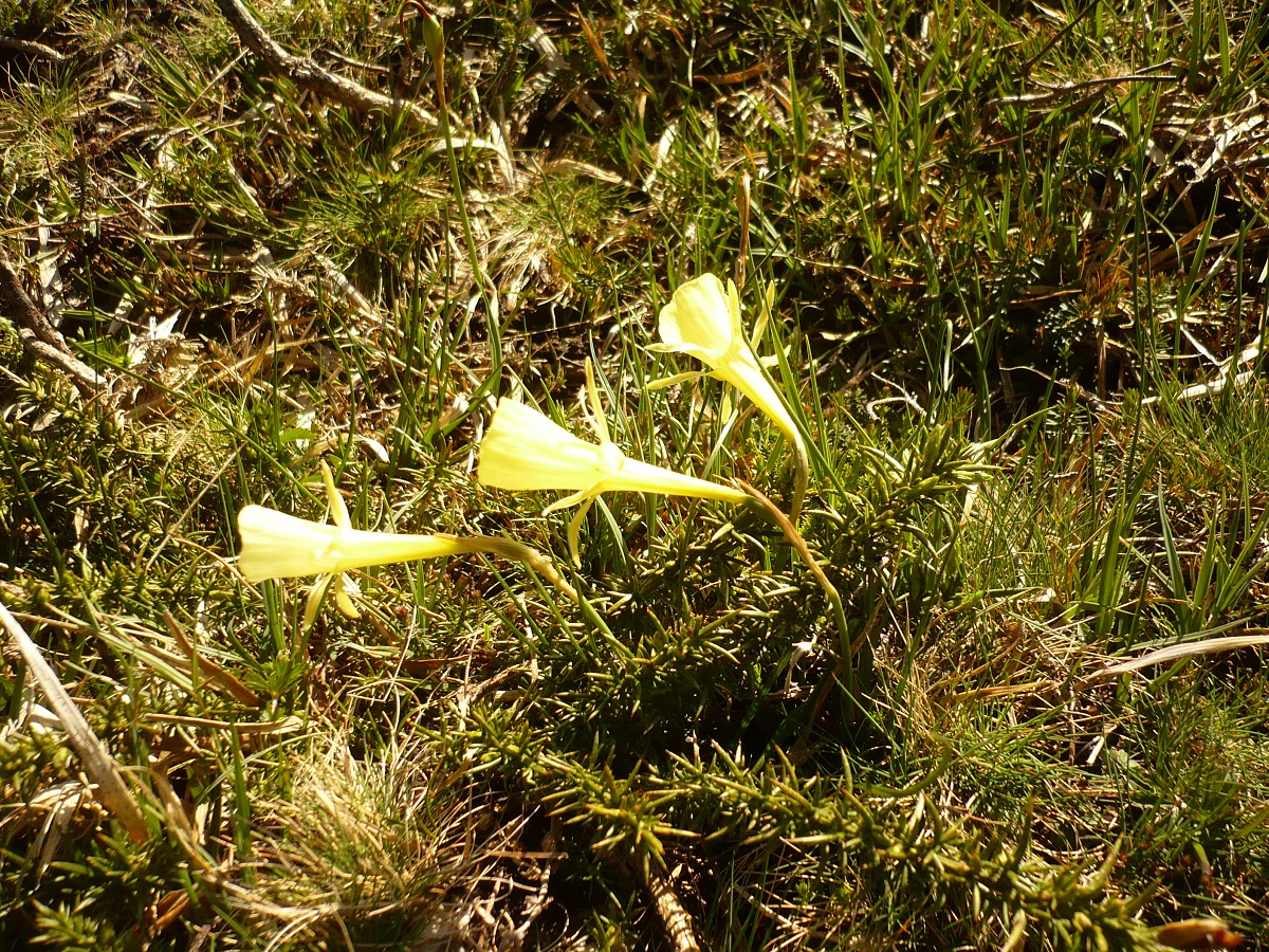 G à bulbe – 1-3 dm – Feuilles étroites de l ≃ 2 mm, hémicylindriques – Fleur de L ≃ 4 cm jaune citrin, solitaire, à couronne en entonnoir, à tépales filiformes – Capsule ovoïde