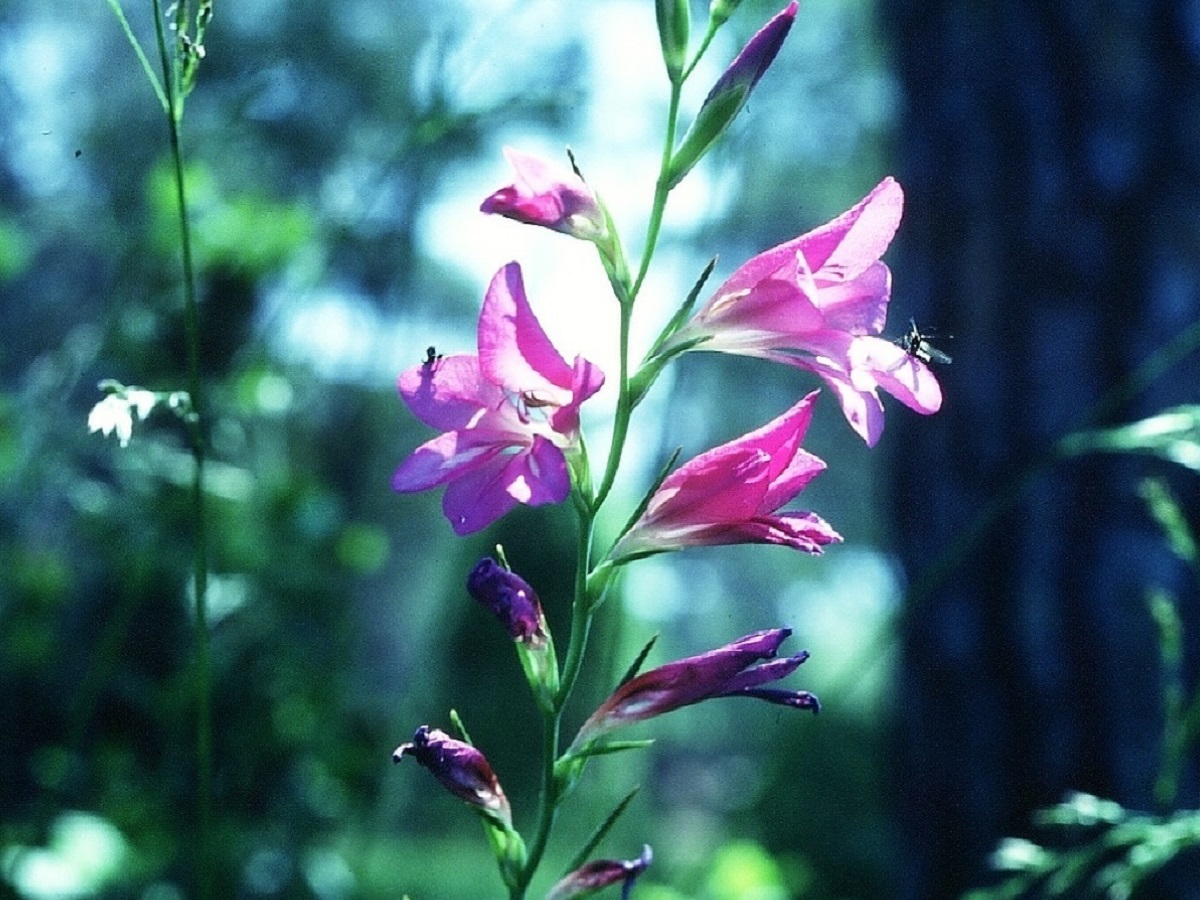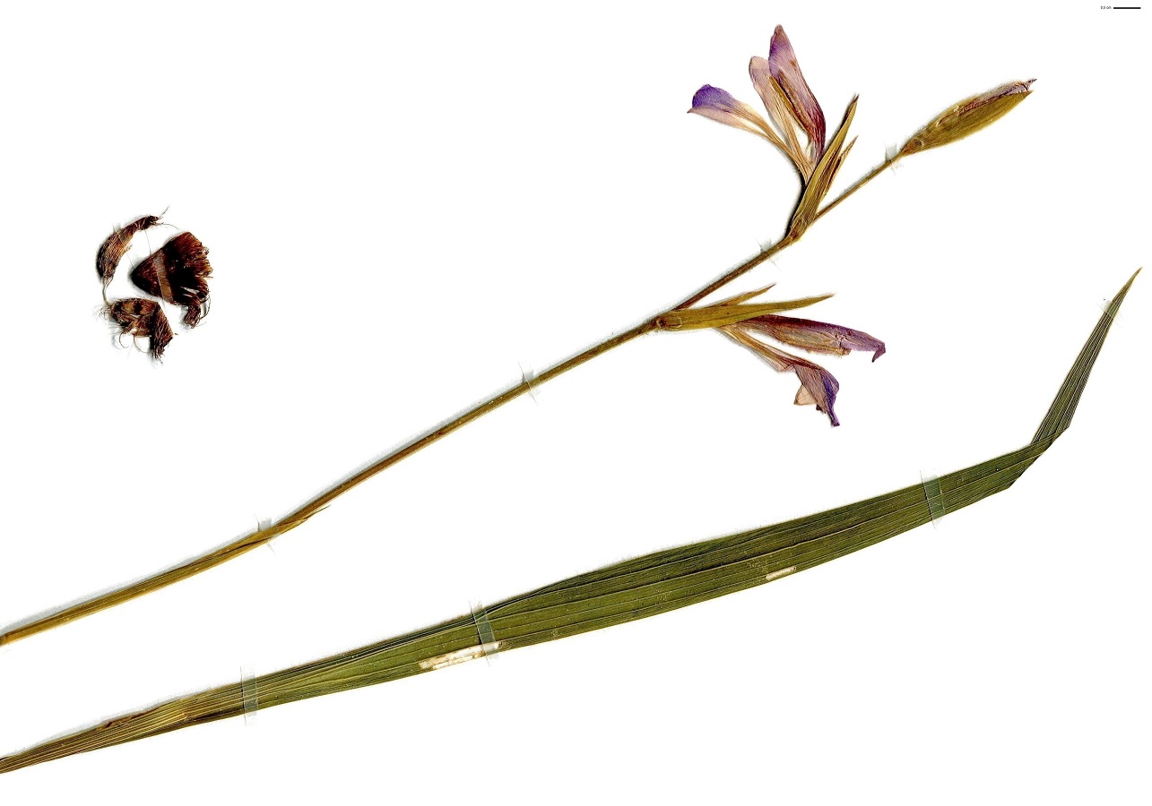 G à corme – 4-8 dm – 4 Feuilles ensiformes – Inflorescence lâche de 5-12 fleurs de L 3-4 cm rose-violacé, à 6 tépales, le > plus grand, anthère > au filet – Graines presque non ailées