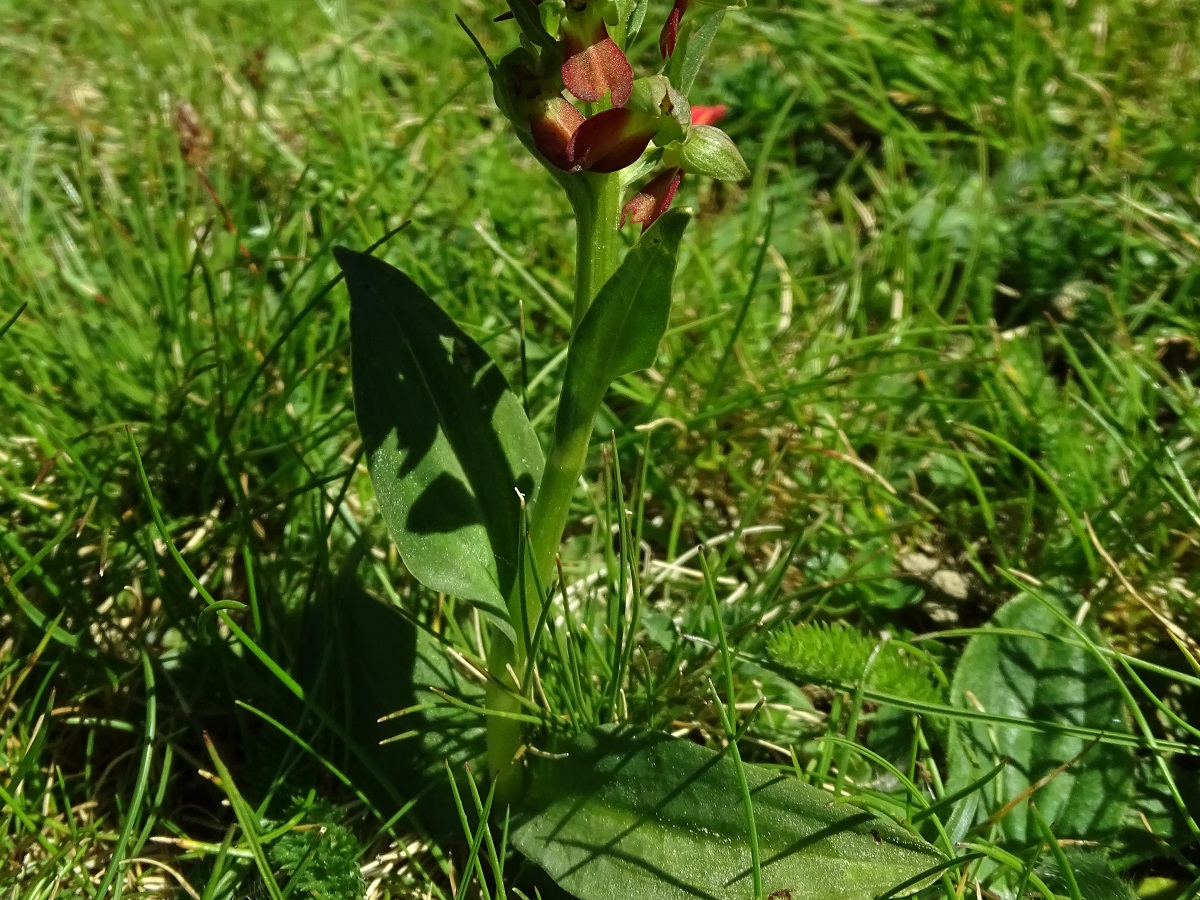 G à tubercule – 1-3 dm – Feuilles basales oblongues – Fleurs verdâtres, labelle L de 6-8 mm pendant, tridenté, teinté de rouge ou de jaune, éperon court, tépales en casque