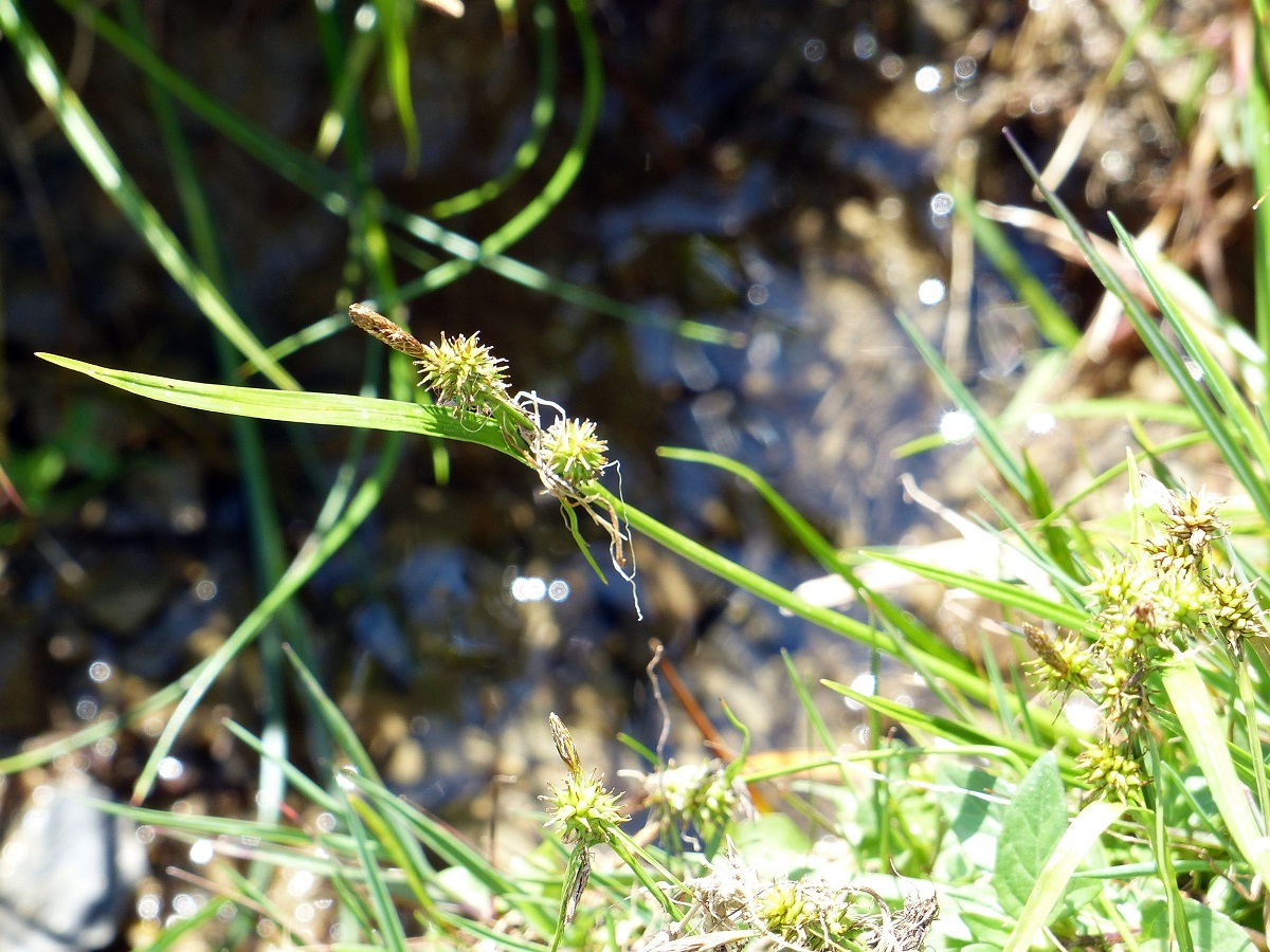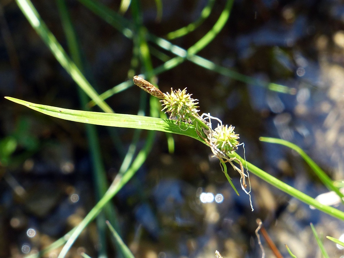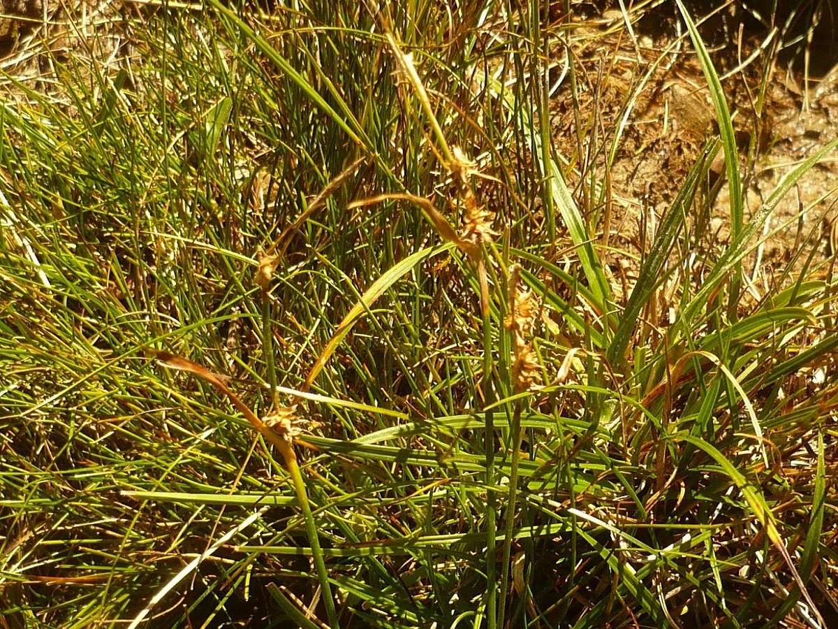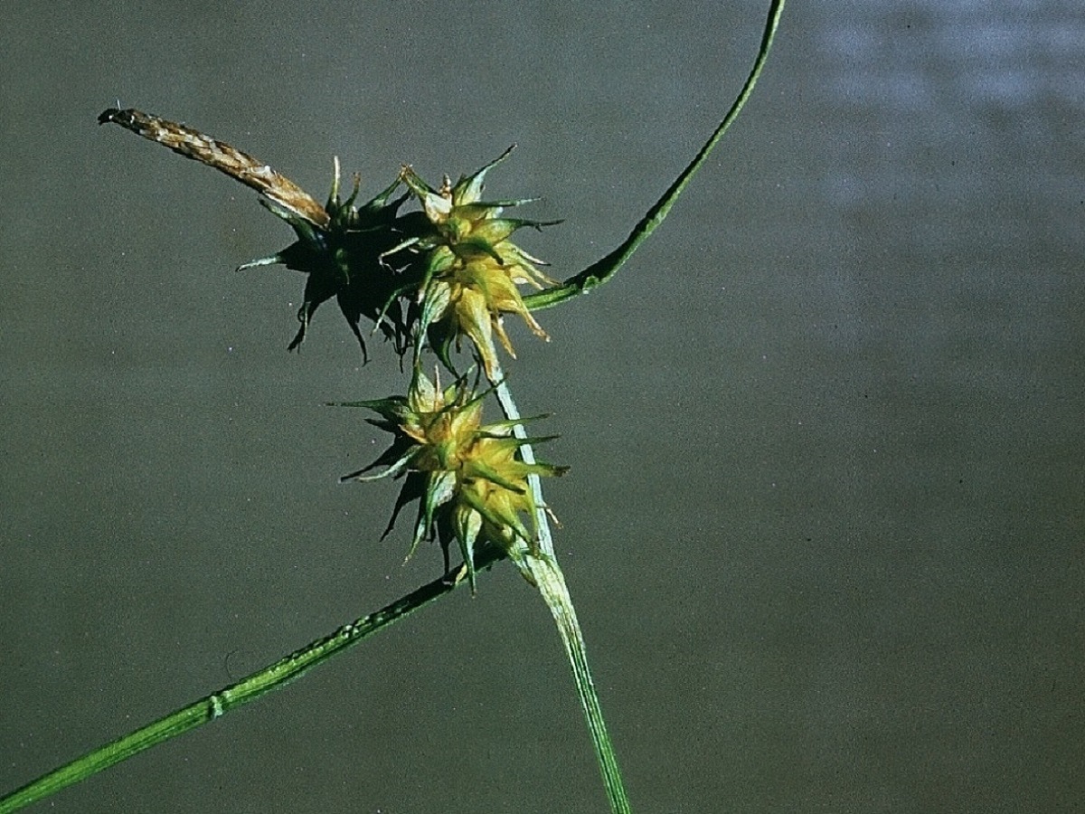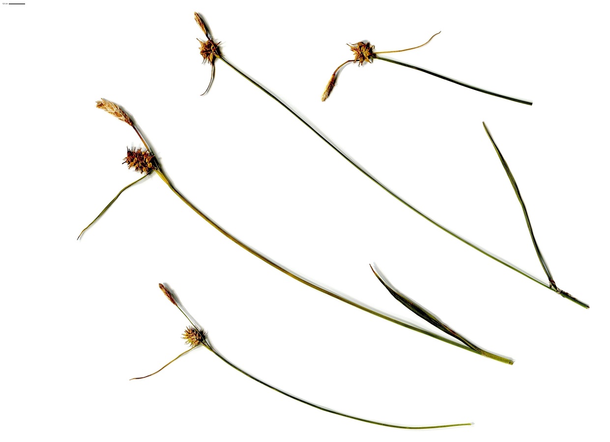 Hc – 1-4 dm – Feuilles larges de 2-3 mm – 1 Épi > ♂ jaune cylindrique menu, à pédoncule déjeté, 1-3 épis < ♀ ovoïdes ± accolés, 3 stigmates – Utricules L de 3-5 mm, à bec long rétrorse