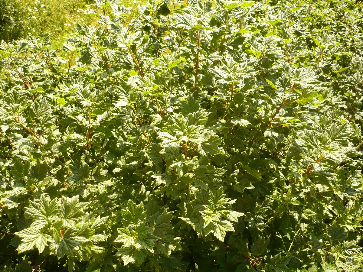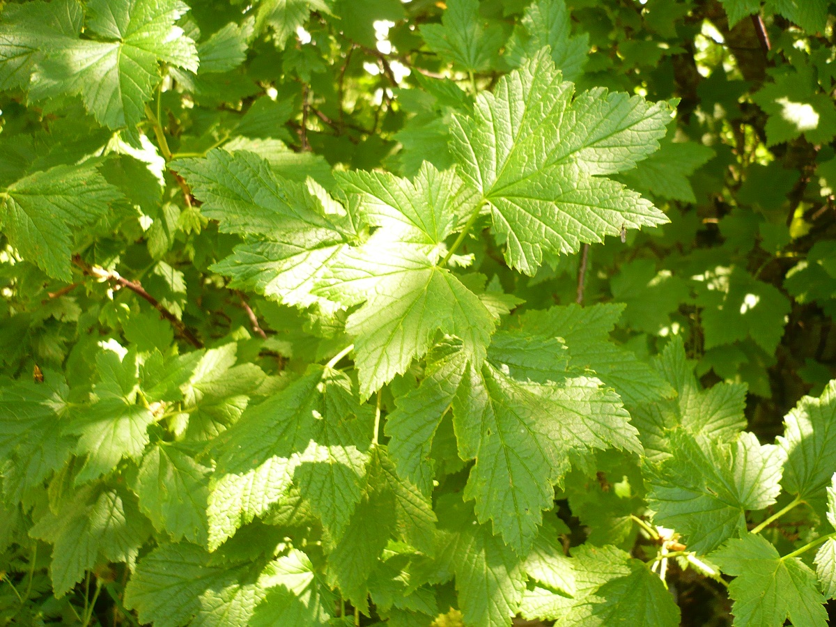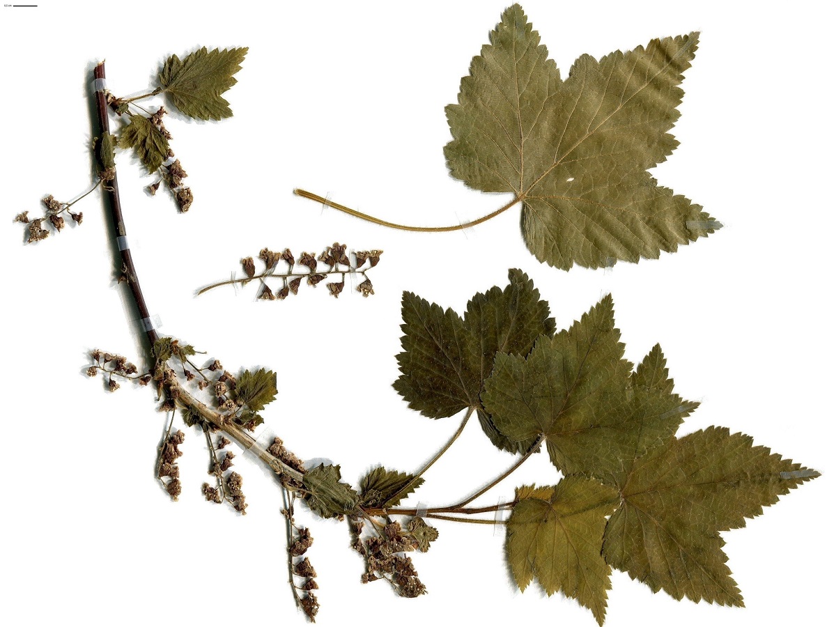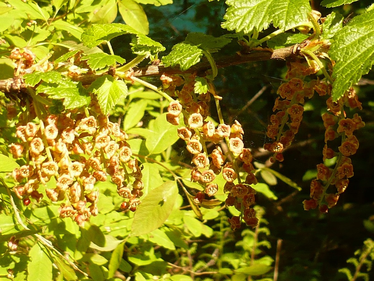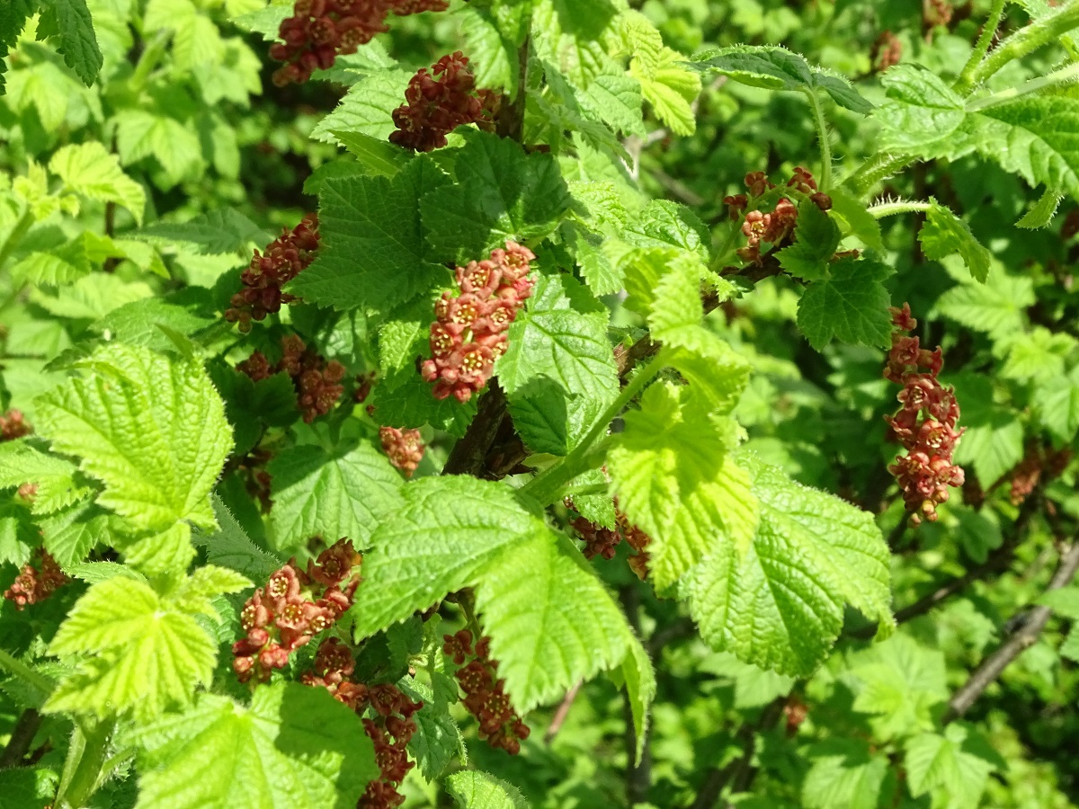 NPh – 1-2,5 m – Feuilles moyennes 3-5-palmatilobées, à dents aiguës – Grappes ± pendantes de fleurs à 5 pétales rougeâtres, à calice cilié en cloche – Baies en grappes rouge foncé