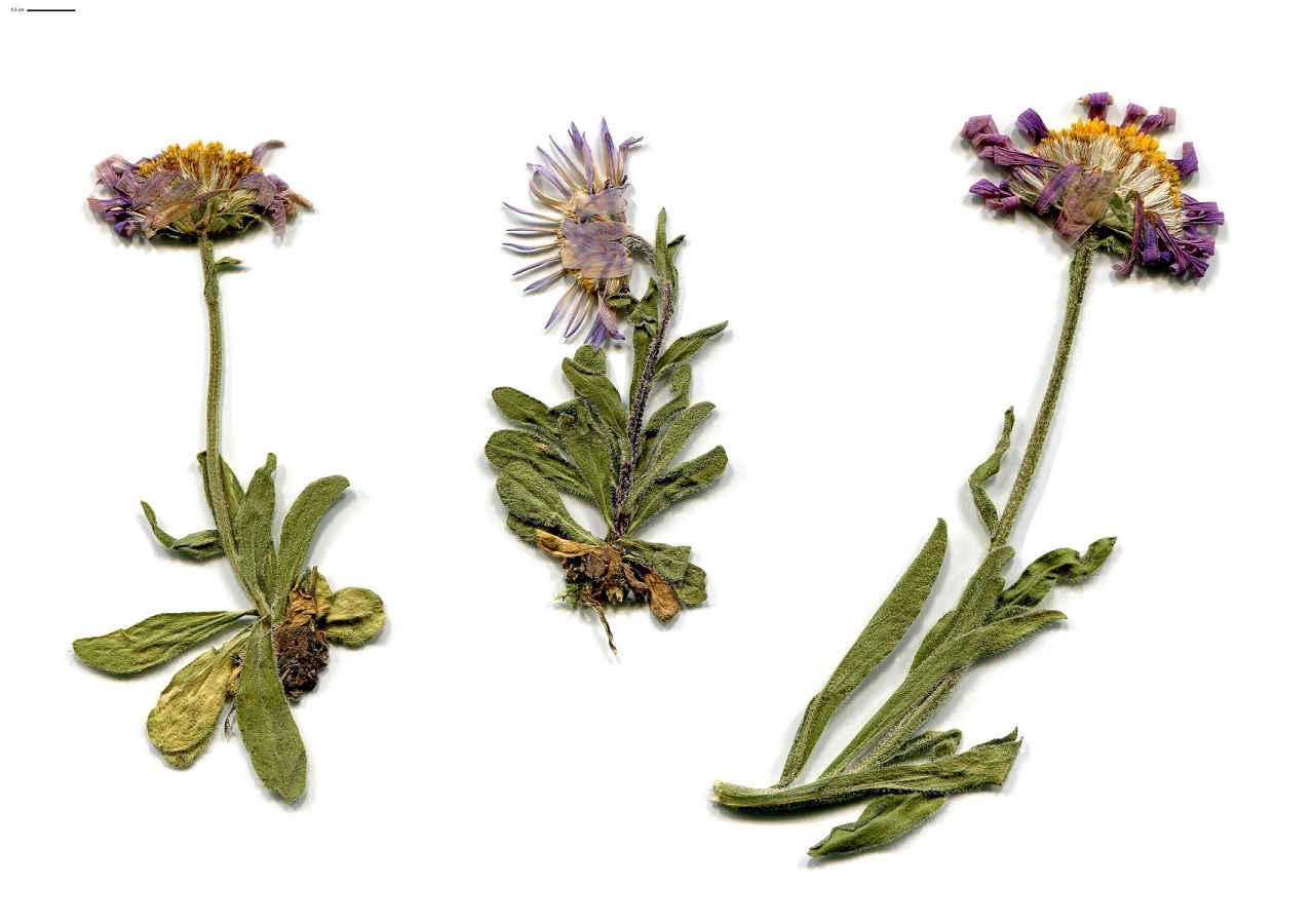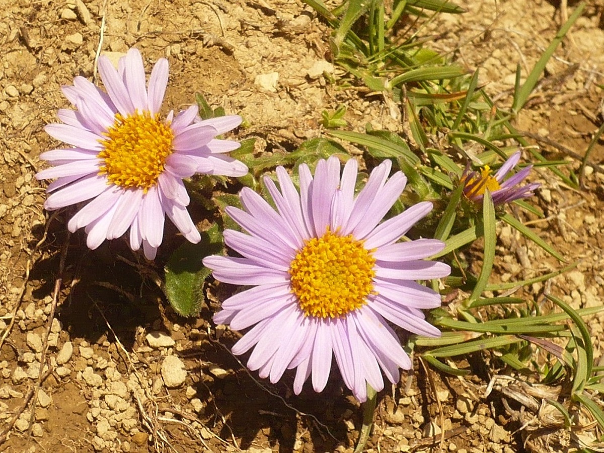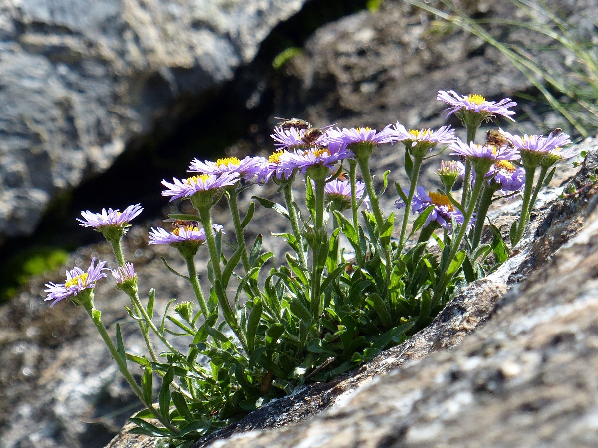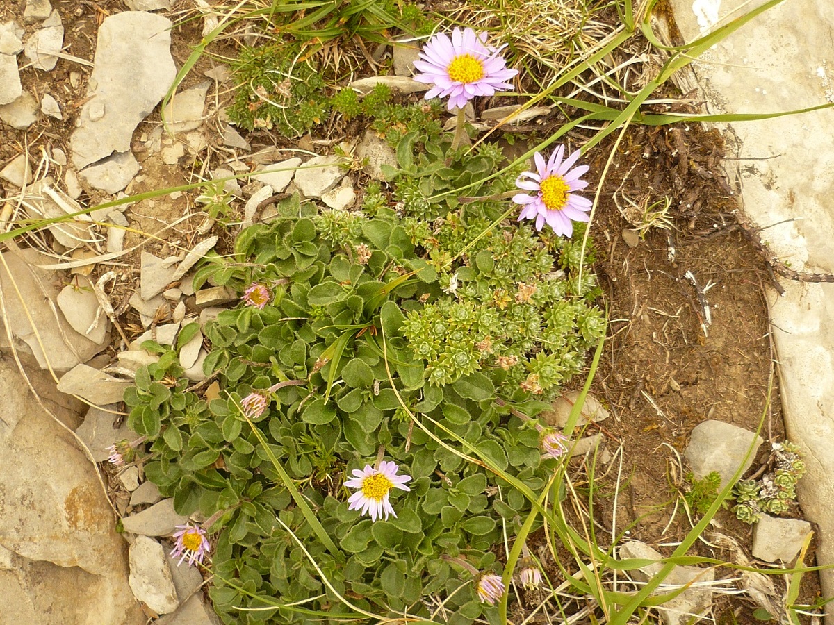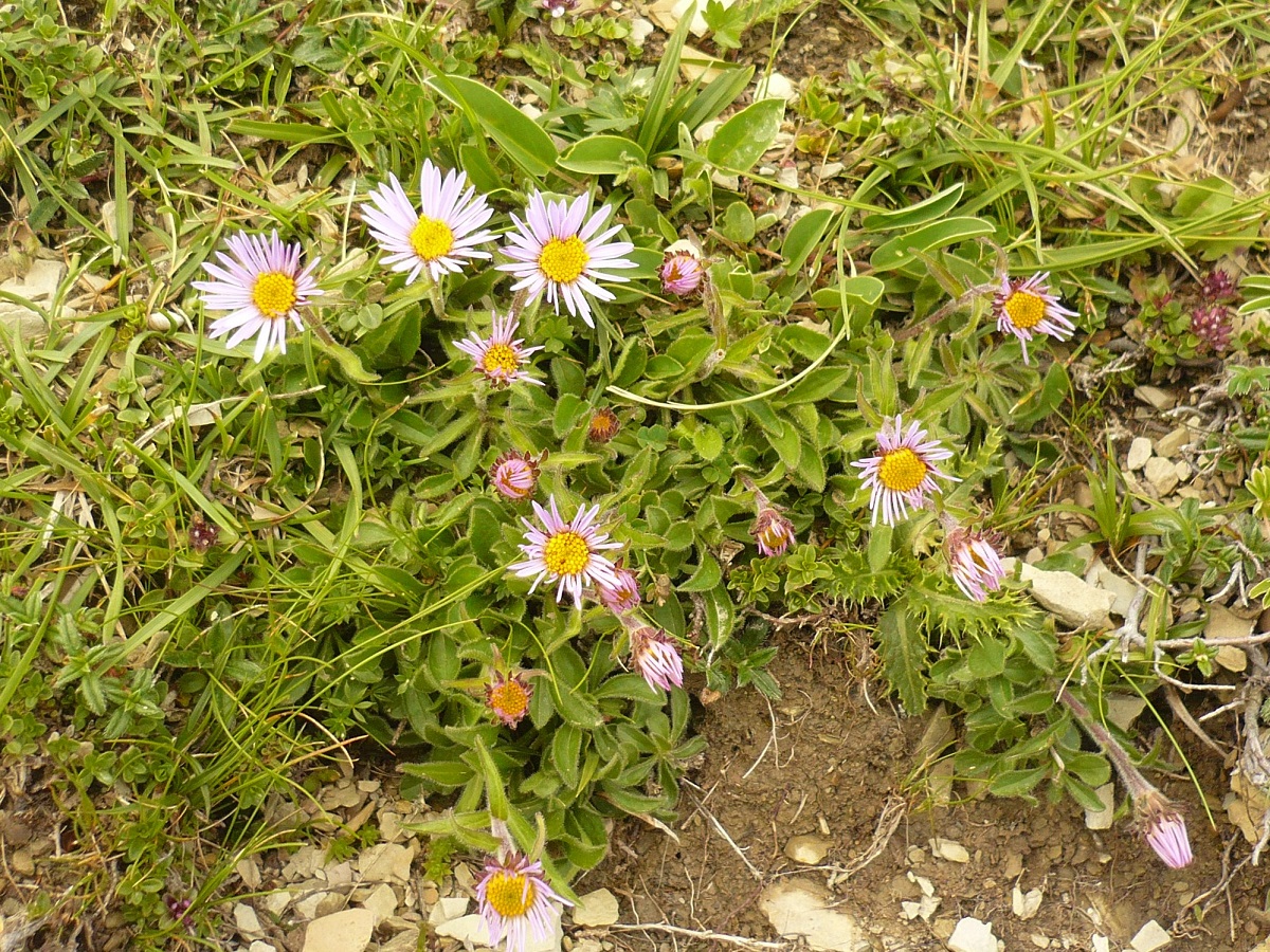 Hc – 0,5-2 dm – Feuilles spatulées en rosette, les caulinaires lancéolées – 1 Capitule de Ø 3,5-4,5 cm, ½-ligules violettes, fleurons jaunes, bractées de l’involucre presque égales obtuses