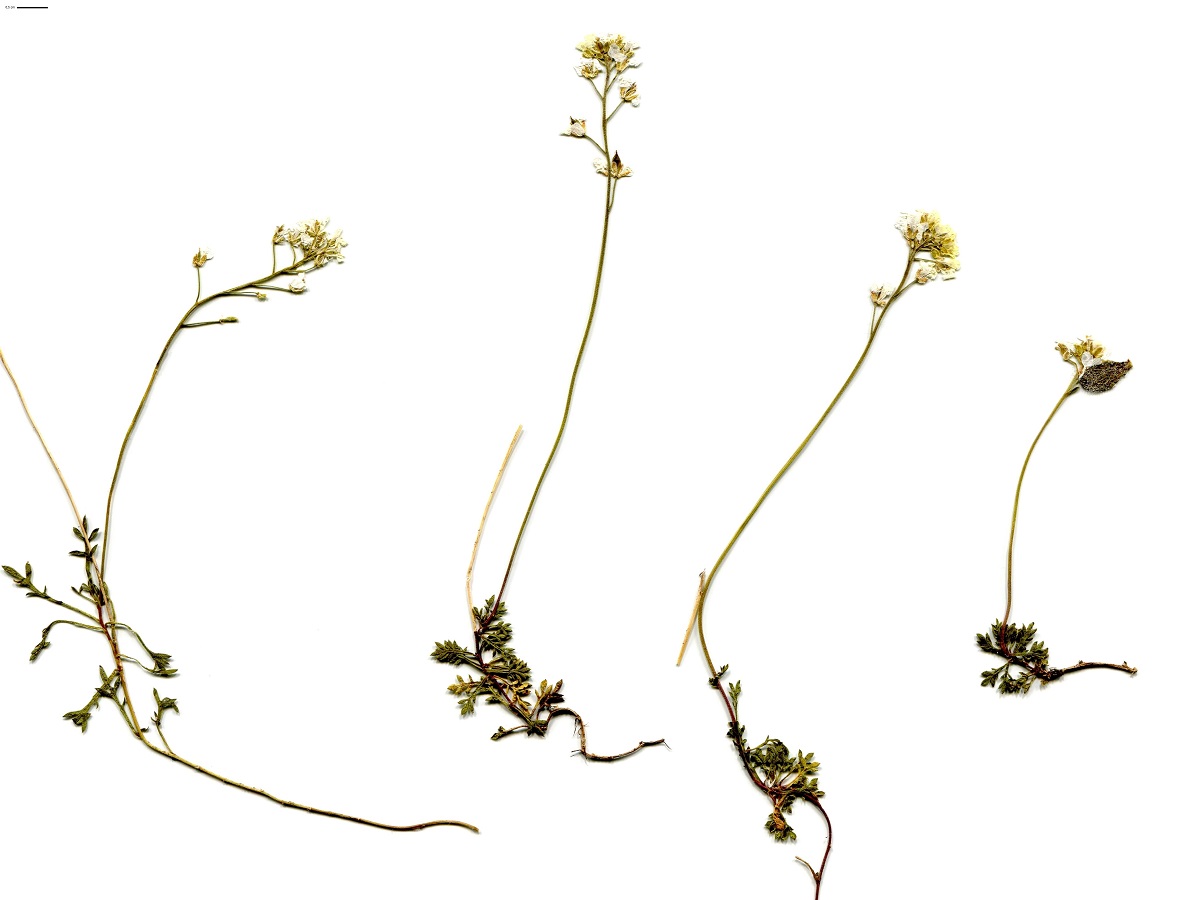 Hc/Ch – 0,5-1,5 dm – Petites feuilles < pennatiséquées à 3-7 segments étroits – Grappe pauciflore de petites fleurs à 4 pétales blancs – Petites silicules ovoïdes aplaties, style de L ≥ 0,2 mm