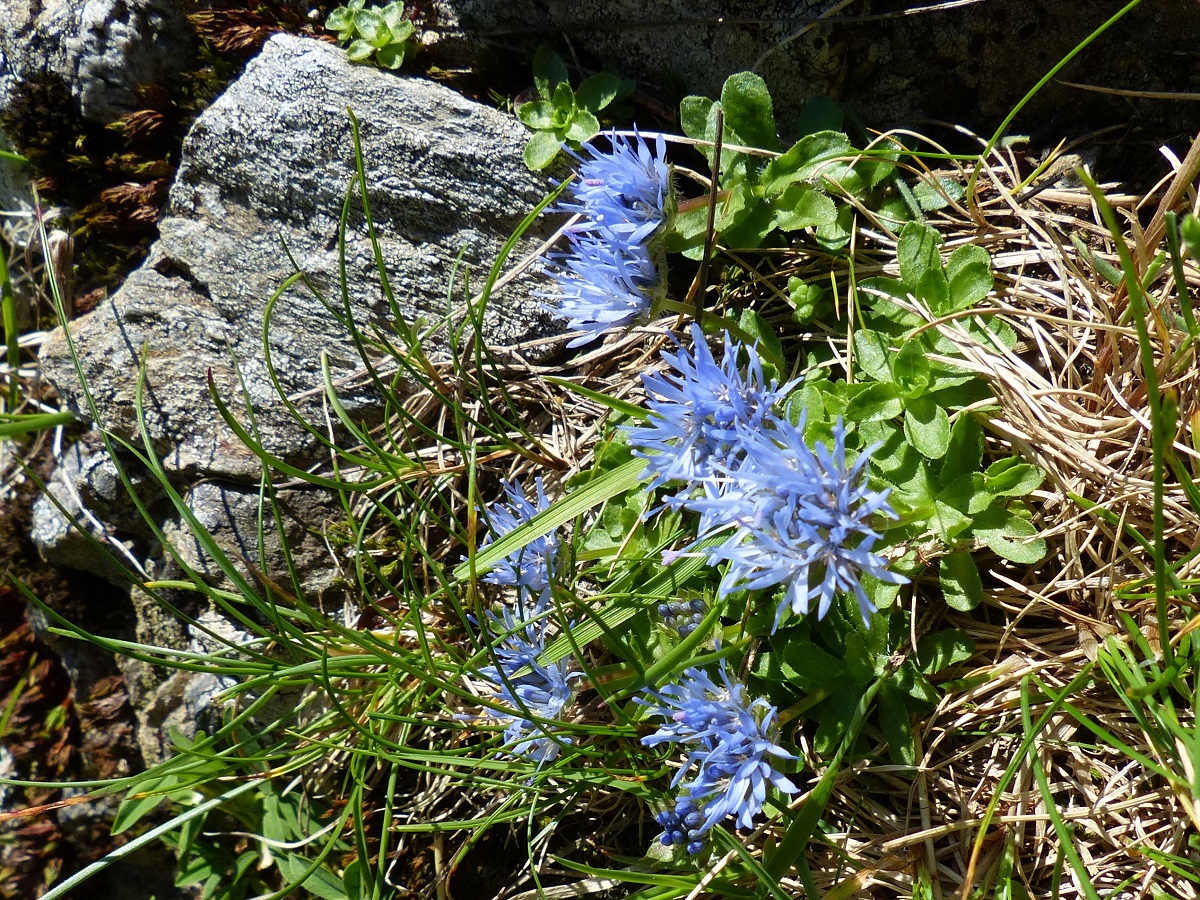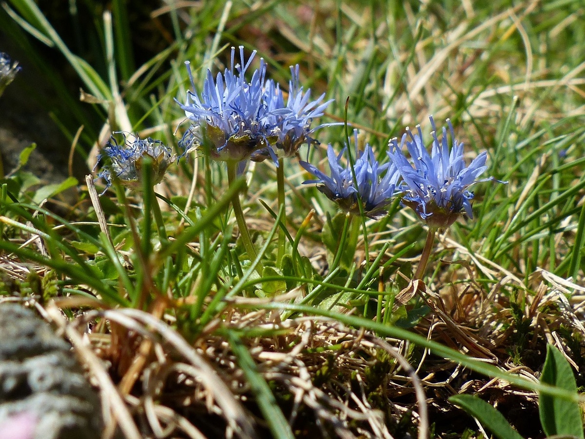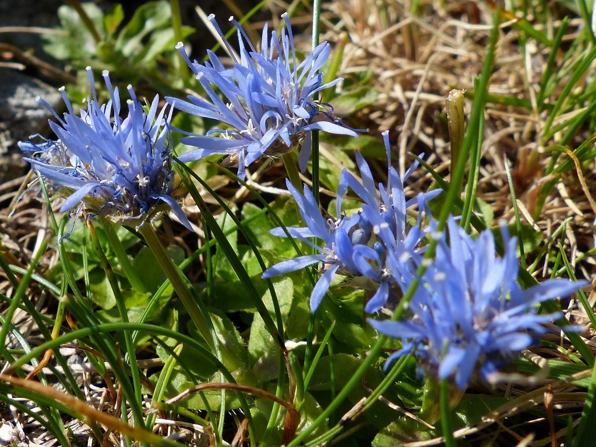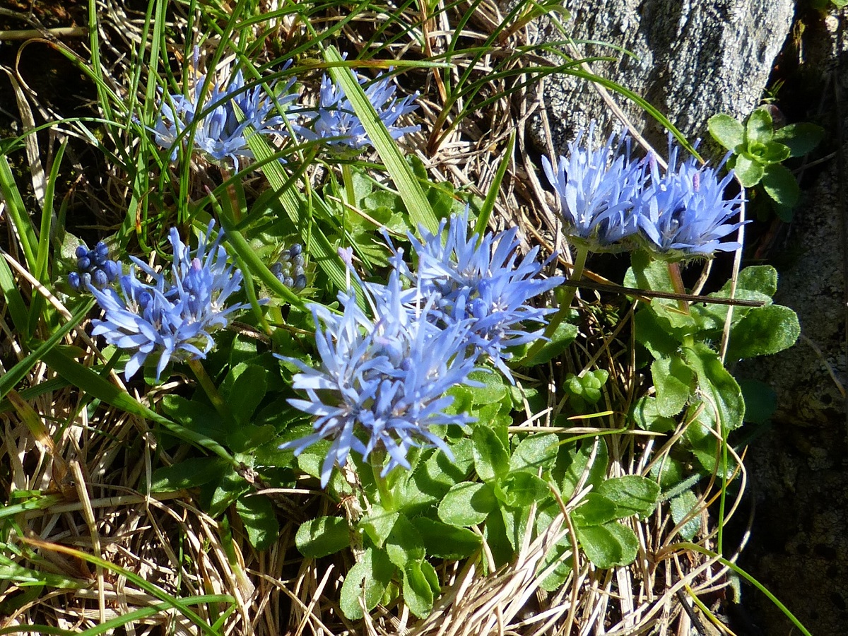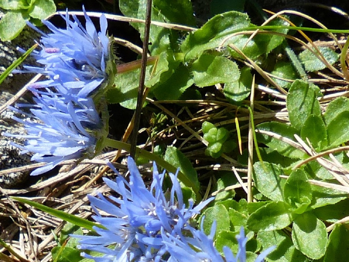 Hc – 0,5-1 dm – Des rejets, feuilles obovales, les inférieures larges en rosette, les supérieures, plus étroites, éparses – Inflorescence globuleuse de Ø 1,5-2 cm, corolle bleue, bractées vertes