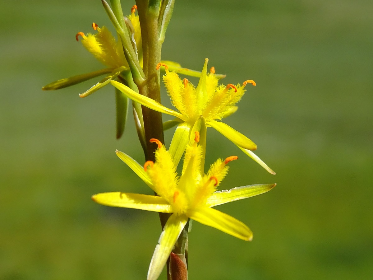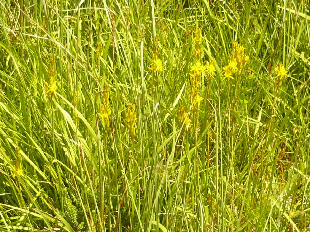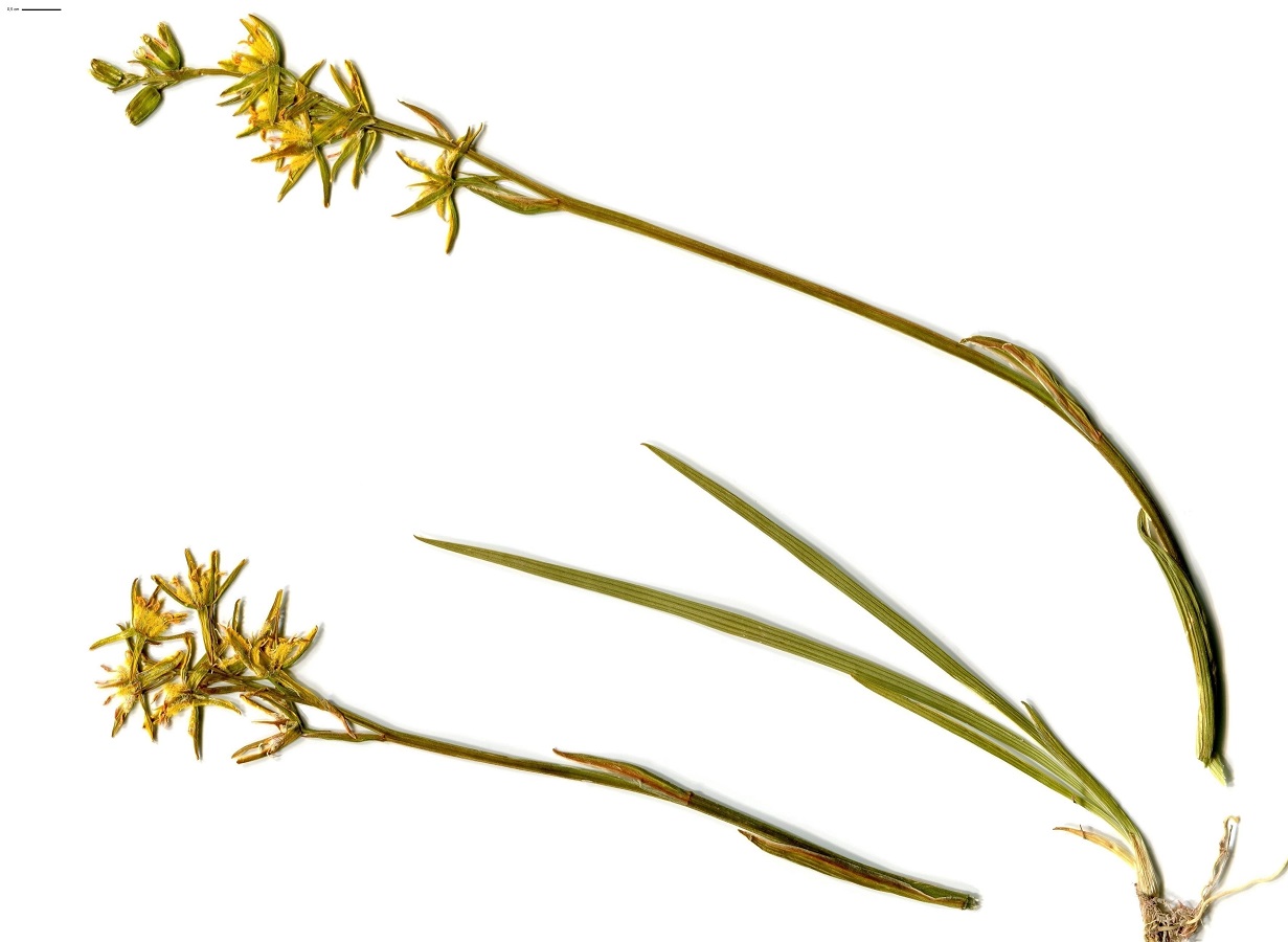 G à rhizome/Hc – 1,5-3 dm – Tige dressée, feuilles ensiformes, les < courtes – Grappe ± dense de fleurs jaune et vert, à 6 tépales étalés, étamines velues – Capsule longue, aiguë