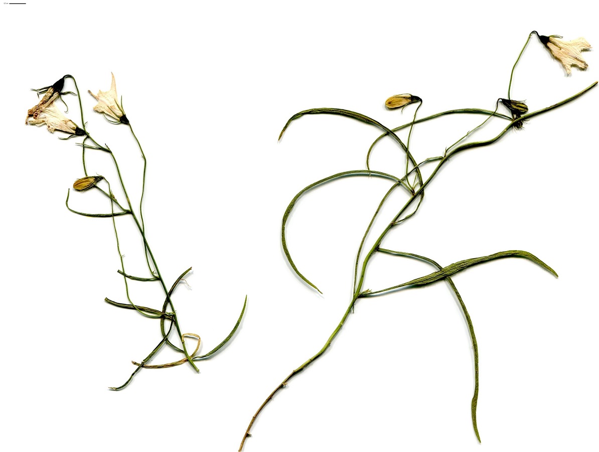 Hc – 1-3 dm – Feuilles ± serrées, les > longues linéaires ± falciformes, les < ovales à cordées, crénelées, fugaces – Boutons penchés, 1-5 fleurs L de 1,8-2,4 cm en cloche bleu violet foncé