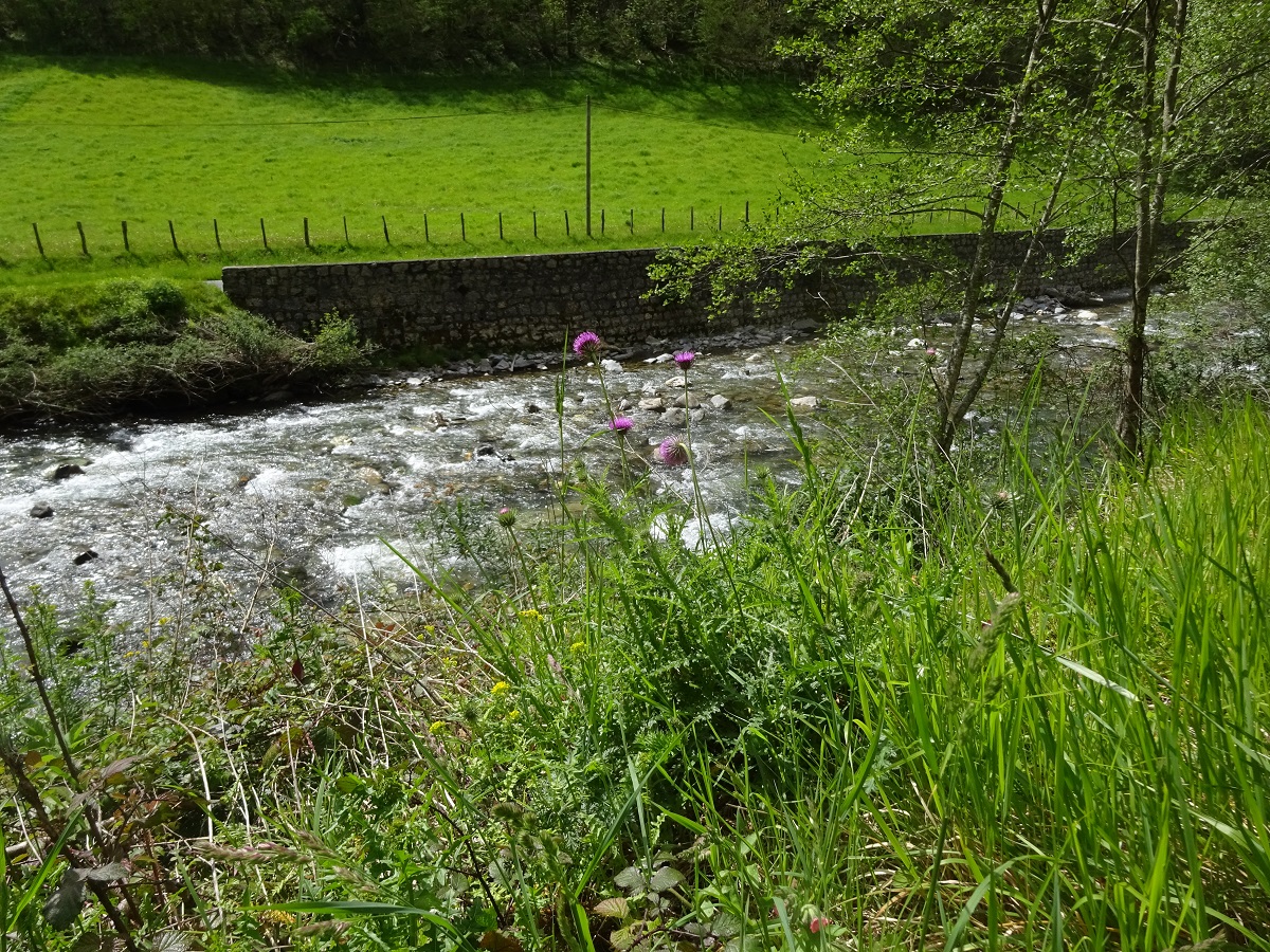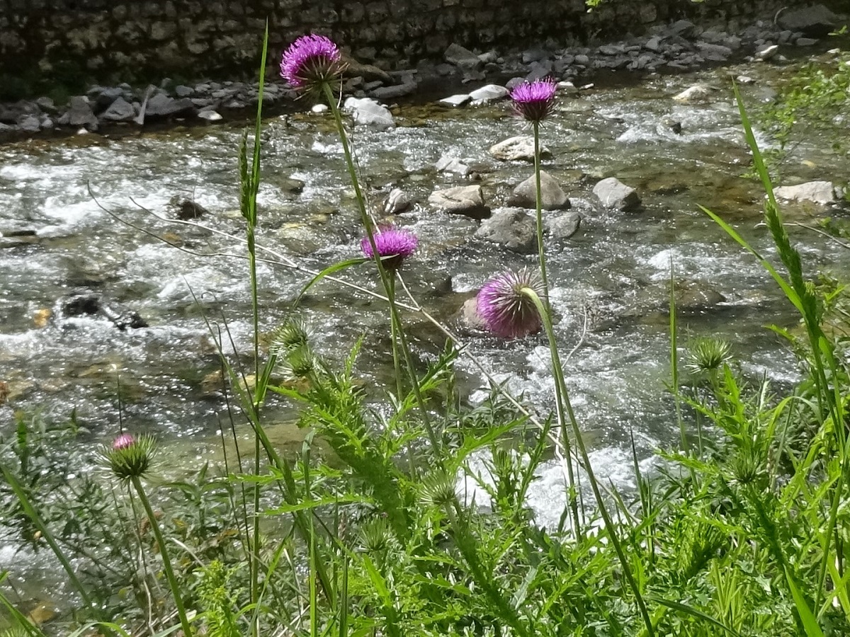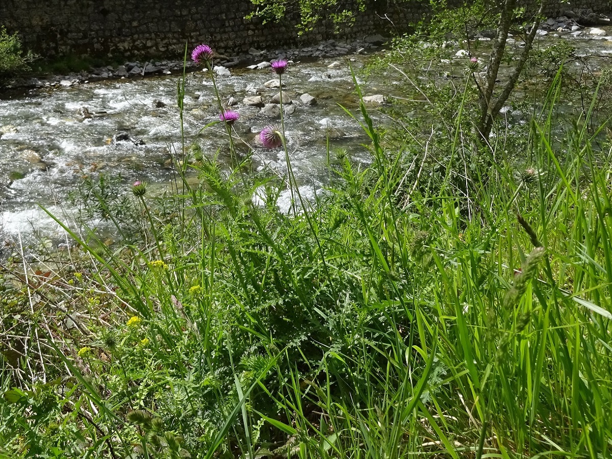 Hc – 5-10 dm – Tige longue peu ailée et feuilles molles à lobes en triangle peu épineuses – Capitule de Ø 2-3 cm penché, fleurons pourprés, bractées arquées appliquées, pédoncule long