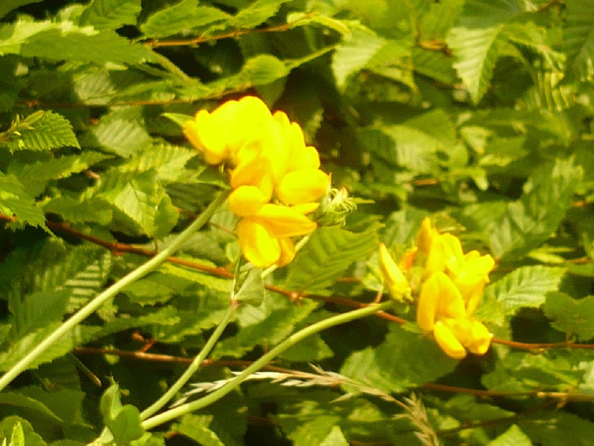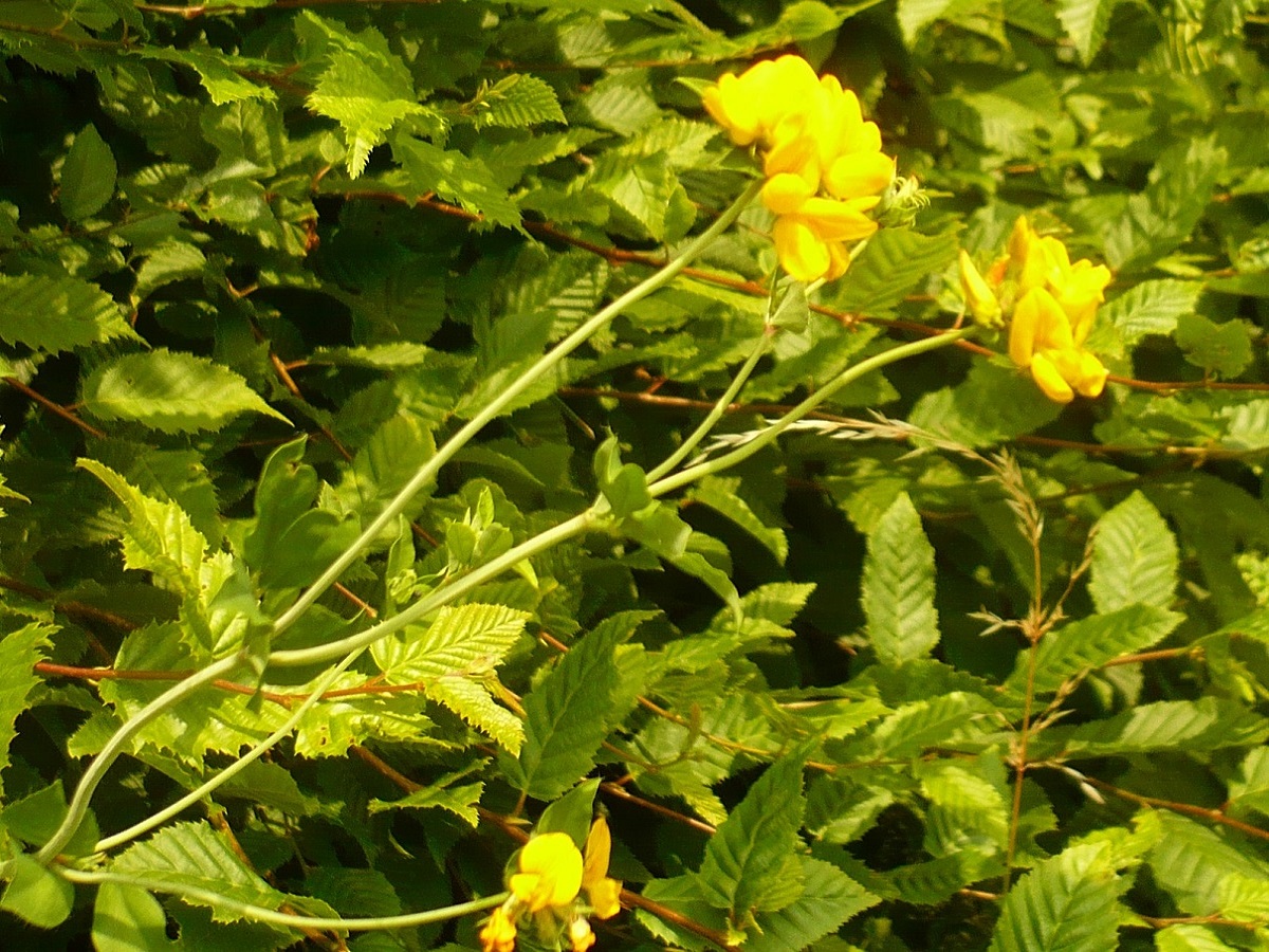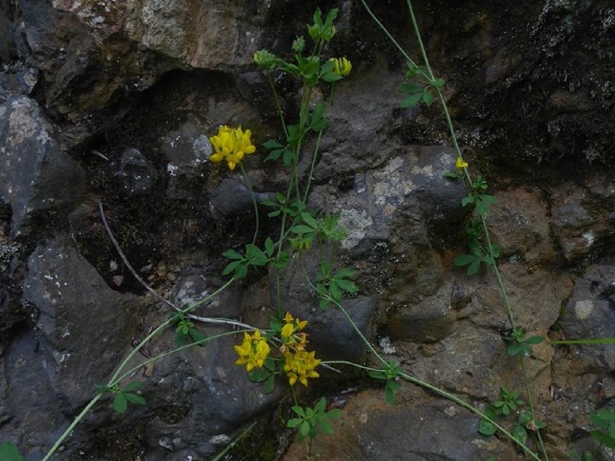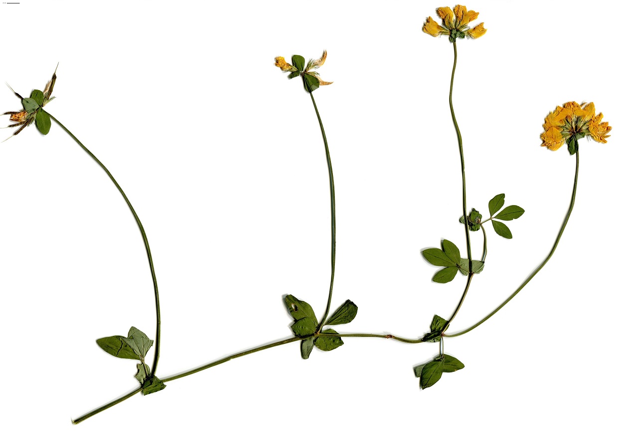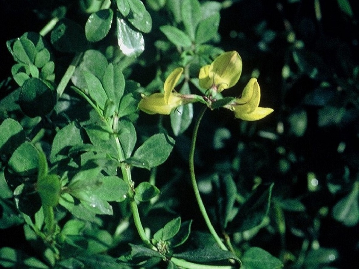 Hc – 4-8 dm – Tige creuse, 3(+2) folioles L de 10-25 mm obovales glauques – Fleurs en tête par 5-12, corolle jaune d’or L de 10-18 mm, calice à dents < au tube – Gousse L de 1,5-3,5 cm droite
