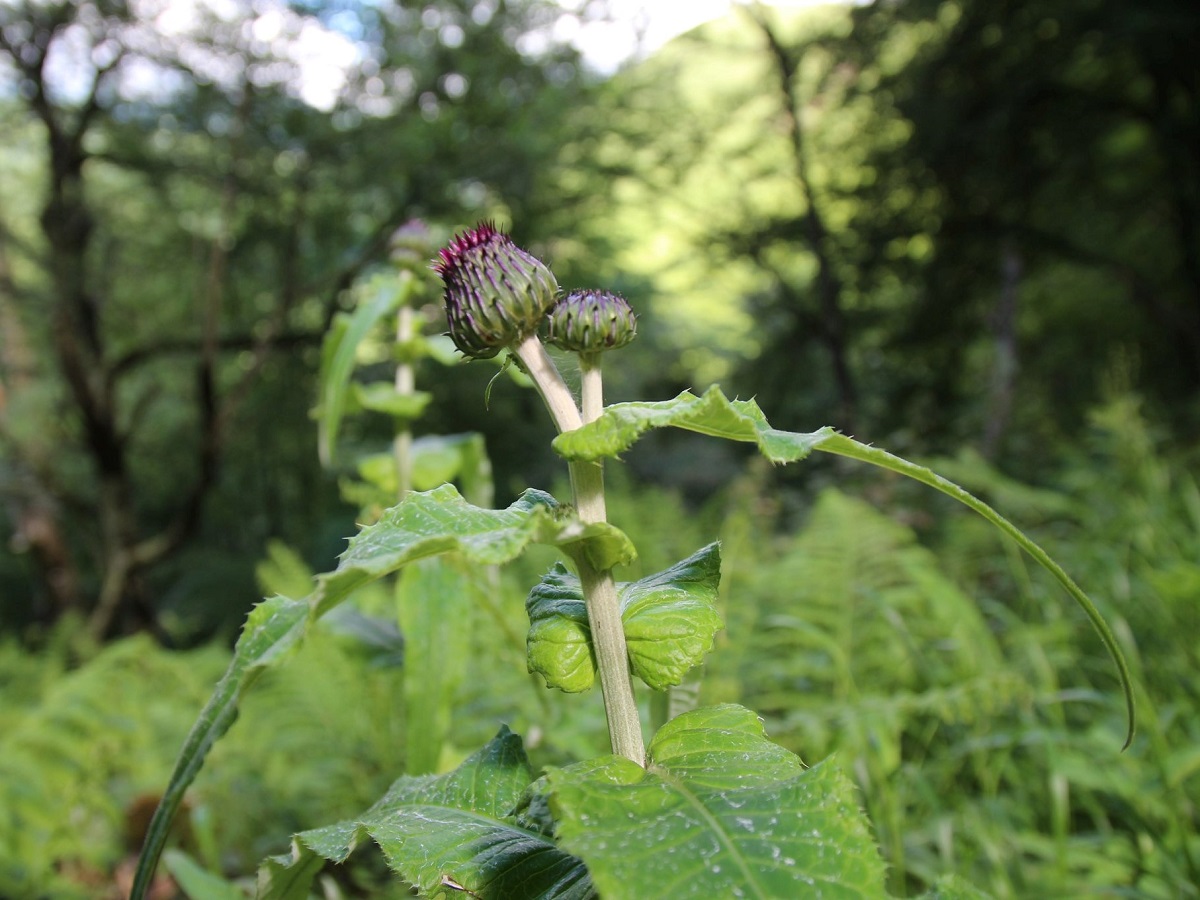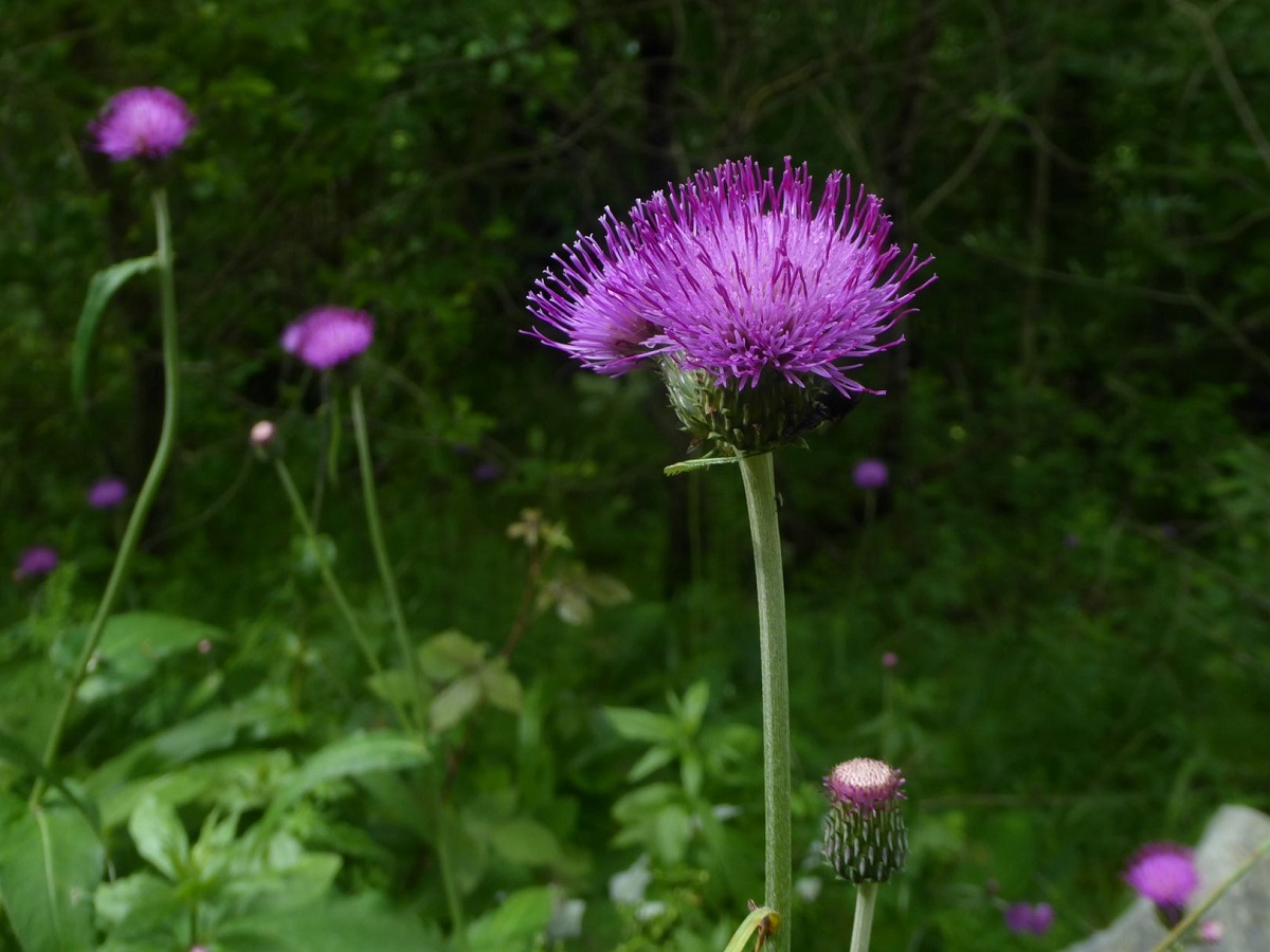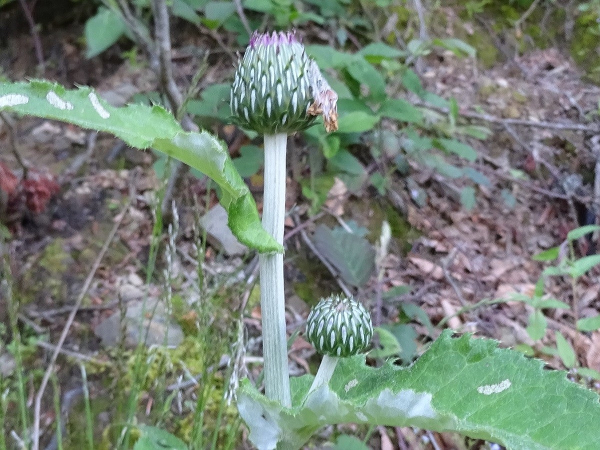 Hc – 5-10 dm – Feuilles planes lancéolées peu épineuses, à revers argenté, les > auriculées – Capitule de Ø 3,5-5 cm pédonculé, fleurons pourpres, bractées à faible spinule