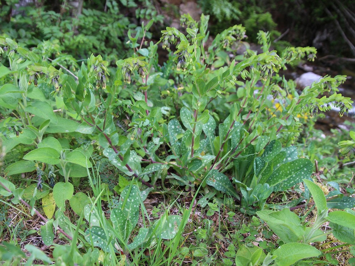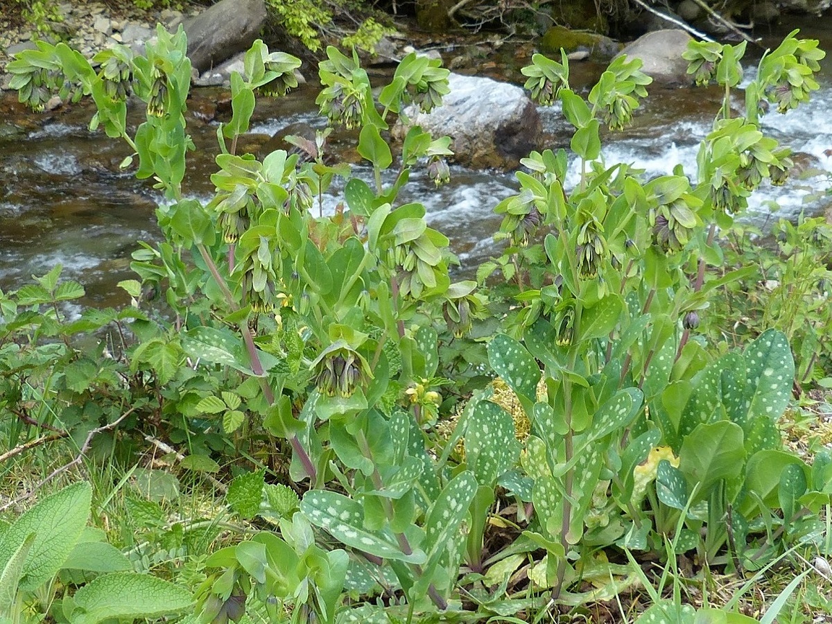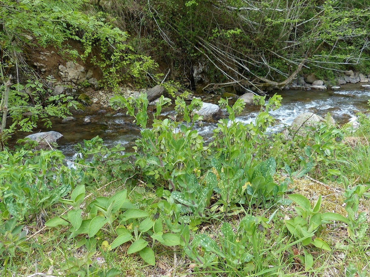 Hc – 2-4 dm – Feuilles glauques, les > serrées ovales auriculées, < en rosette maculées de blanc – Corolle en tube L de 1-1,5 cm jaune à anneau brun-rouge, à 5 dents recourbées, style exsert