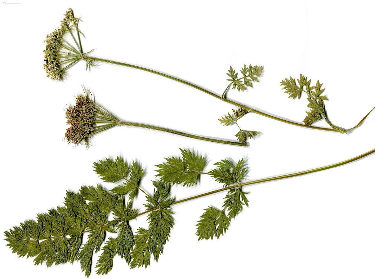 Hc – 4-8 dm – Feuilles < triangulaires 2- à 3-pennées à segments lancéolés aigus – 20-60 Rayons, fleurs blanches (ou rosées), bractées persistantes – Fruit L de 3-4 mm ovoïde ± velu