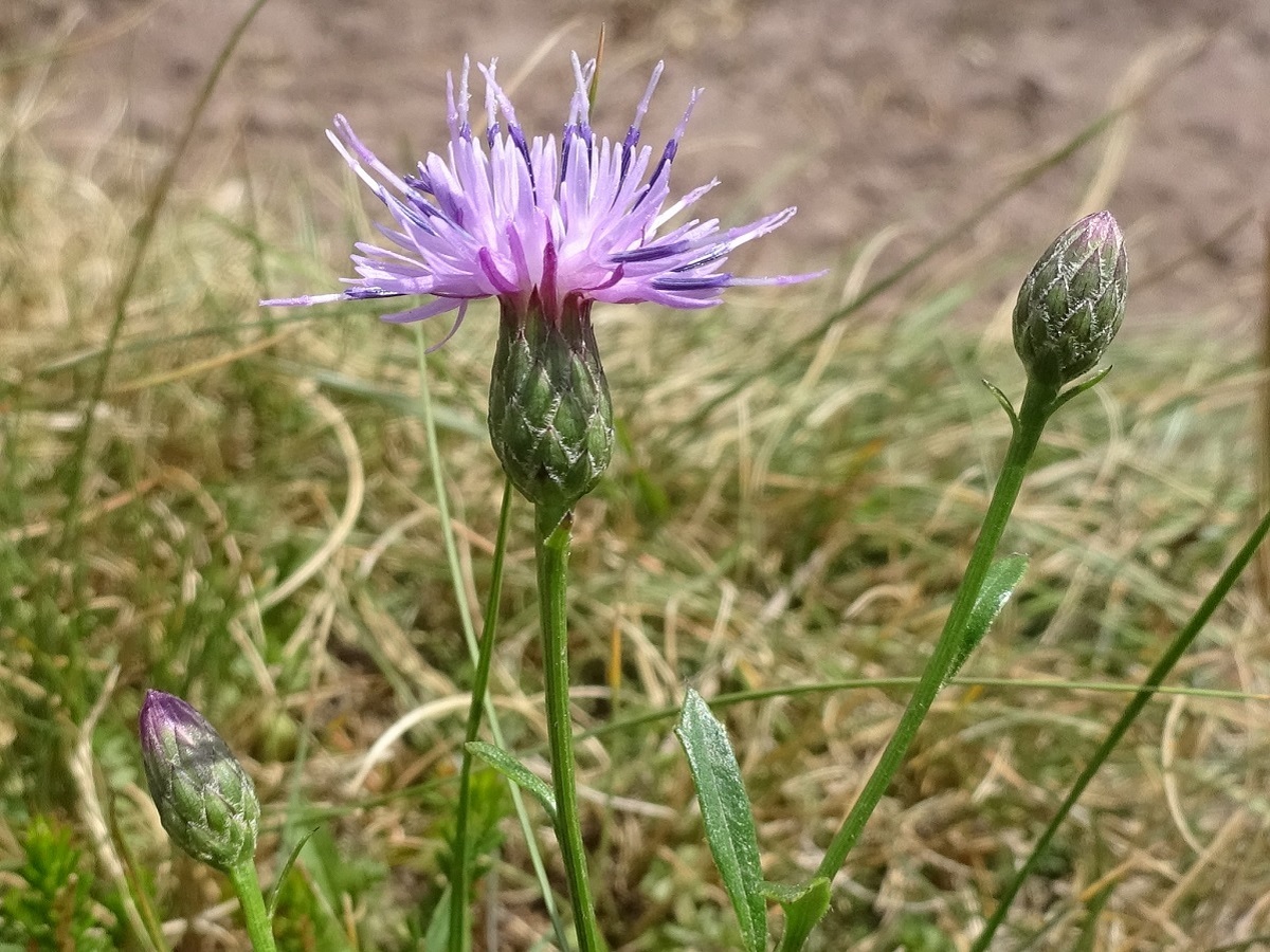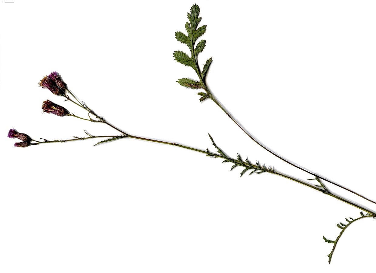 Hc – 2-4 dm – Tige ramifiée au sommet, feuilles pennées à lobes lancéolés étroits dentés – Capitules de Ø 1,5-2 cm, fleurons pourpres, involucre de Ø ≃ 6 mm, bractées ciliées ± pourpres