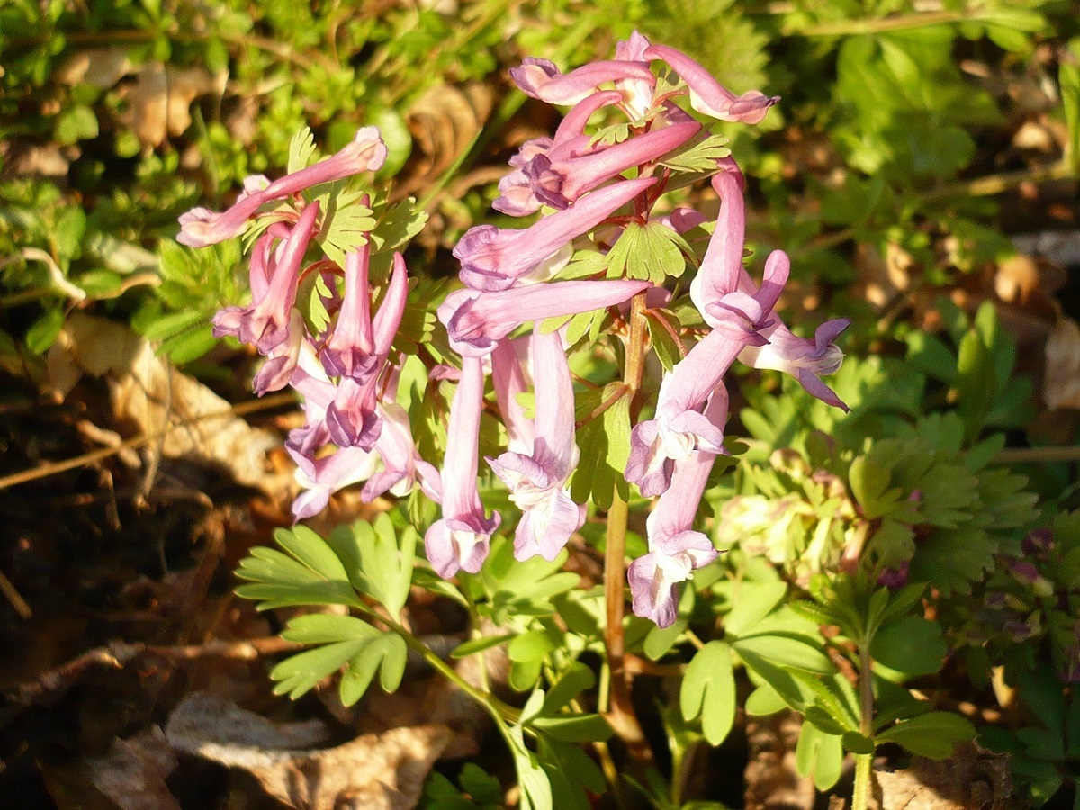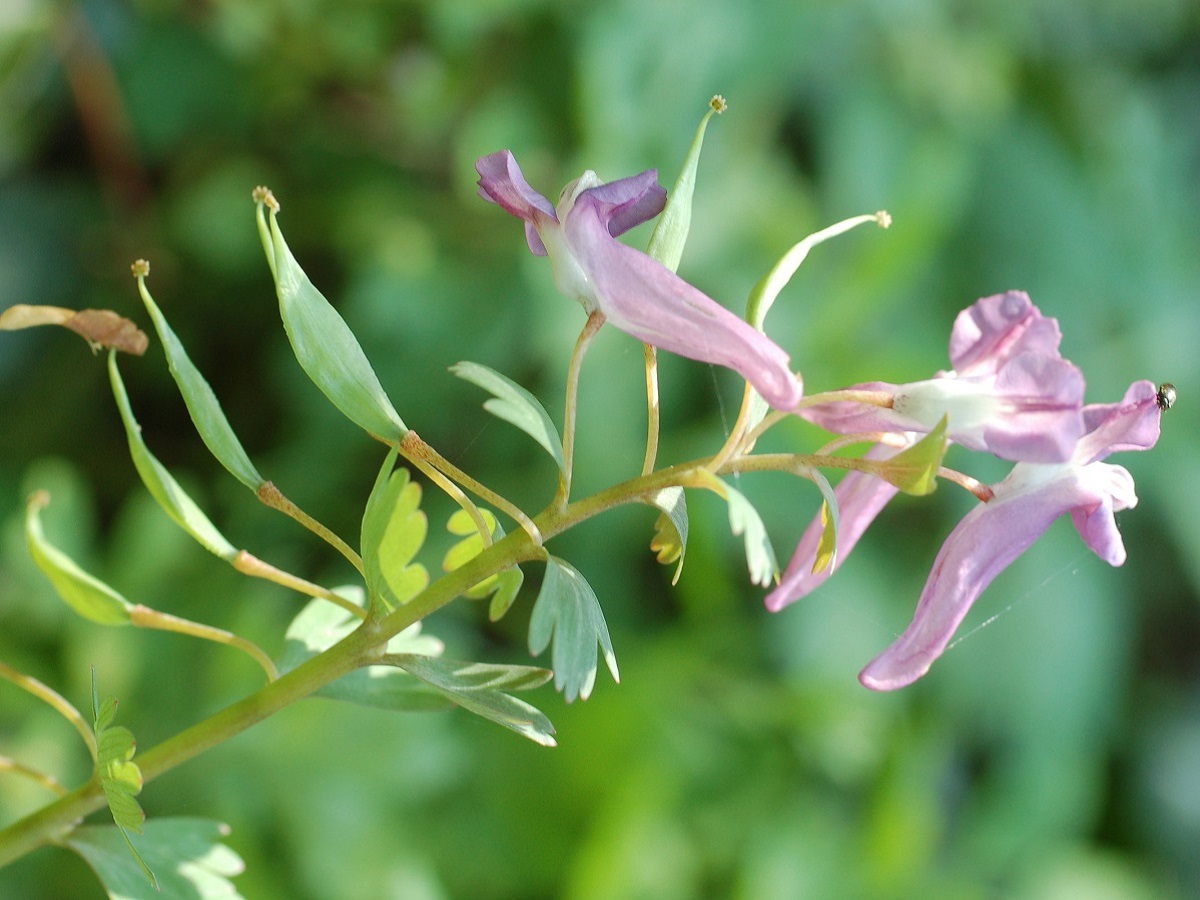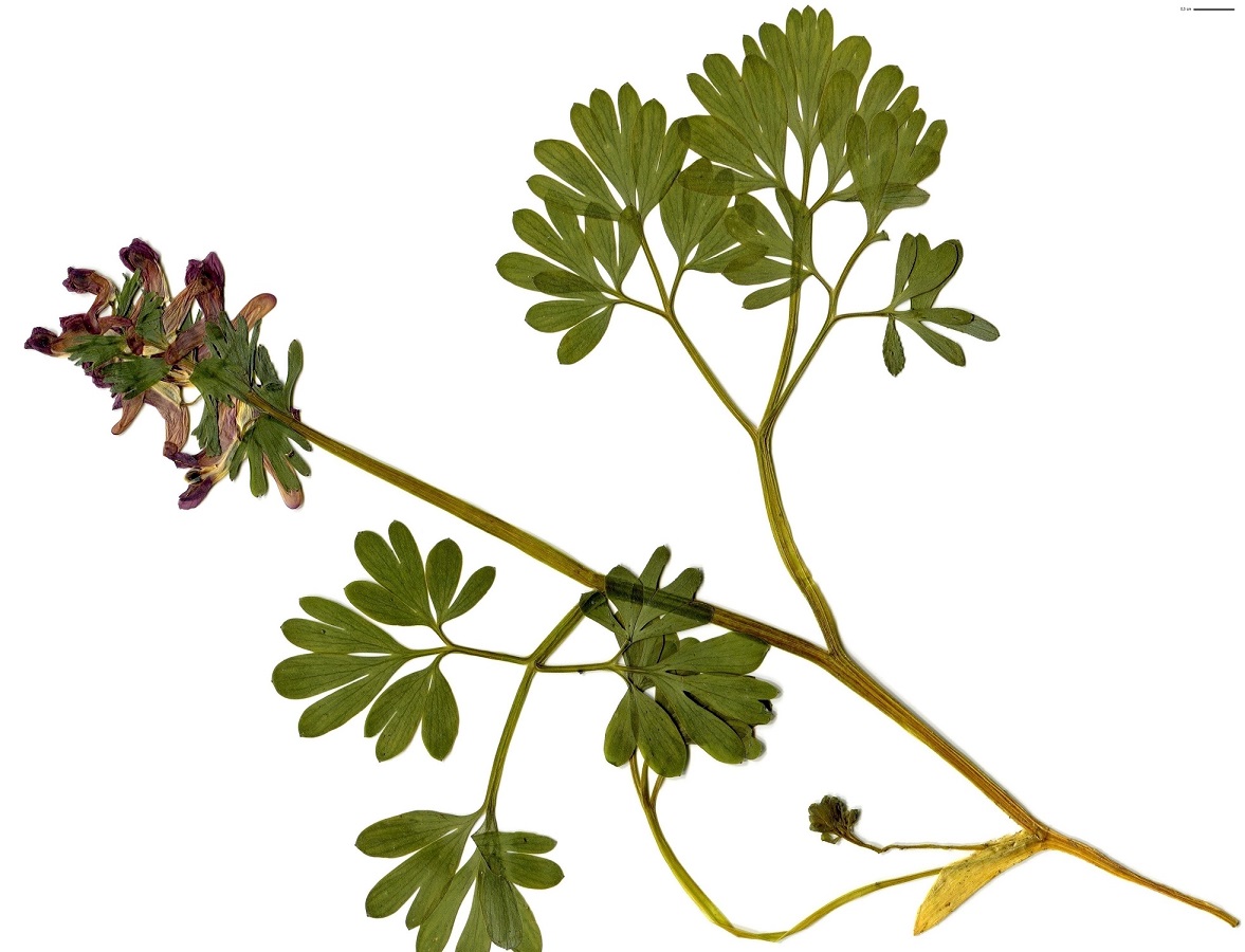 G à tubercule – 1-2 dm – Feuilles, découpées en segments incisés-lobés, à écaille basale – Grappe de fleurs pourprées à éperon long, bractées digitées – Fruit elliptique pendant