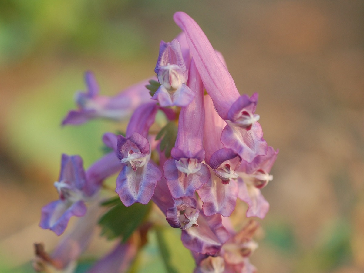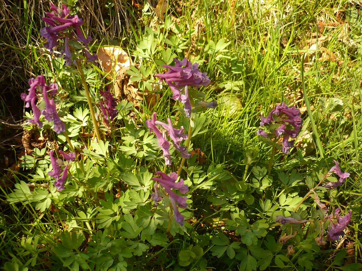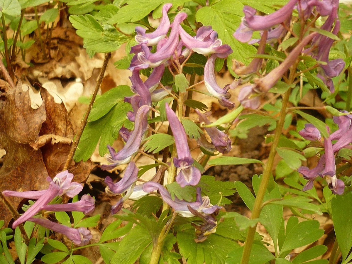 G à tubercule – 1-2 dm – Feuilles, découpées en segments incisés-lobés, à écaille basale – Grappe de fleurs pourprées à éperon long, bractées digitées – Fruit elliptique pendant
