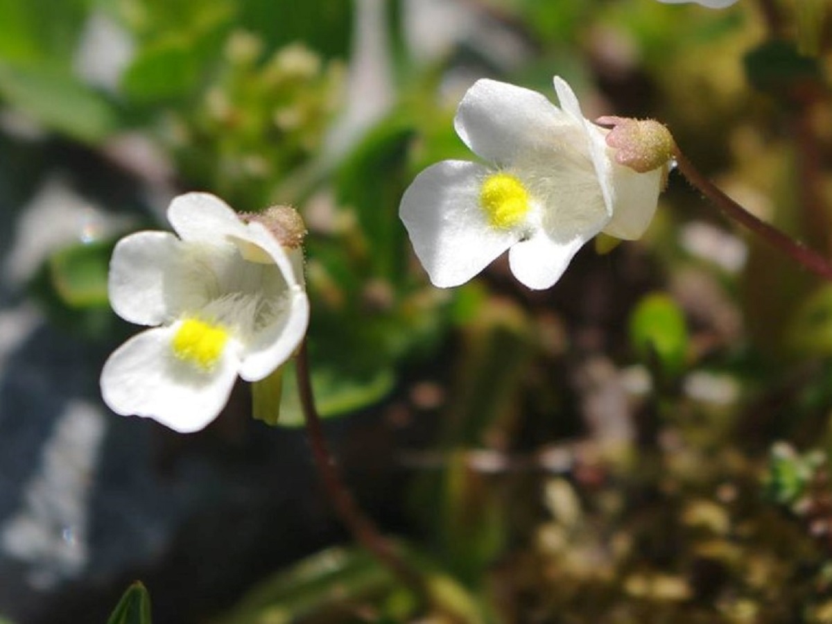 Hc – 0,5-1,5 dm – Feuilles visqueuses petites, elliptiques à marge involutée, en rosette – Fleurs pédicellées blanches de L ≃ 1 cm à gorge jaune, éperon court de 2-3 mm – Capsule ovoïde