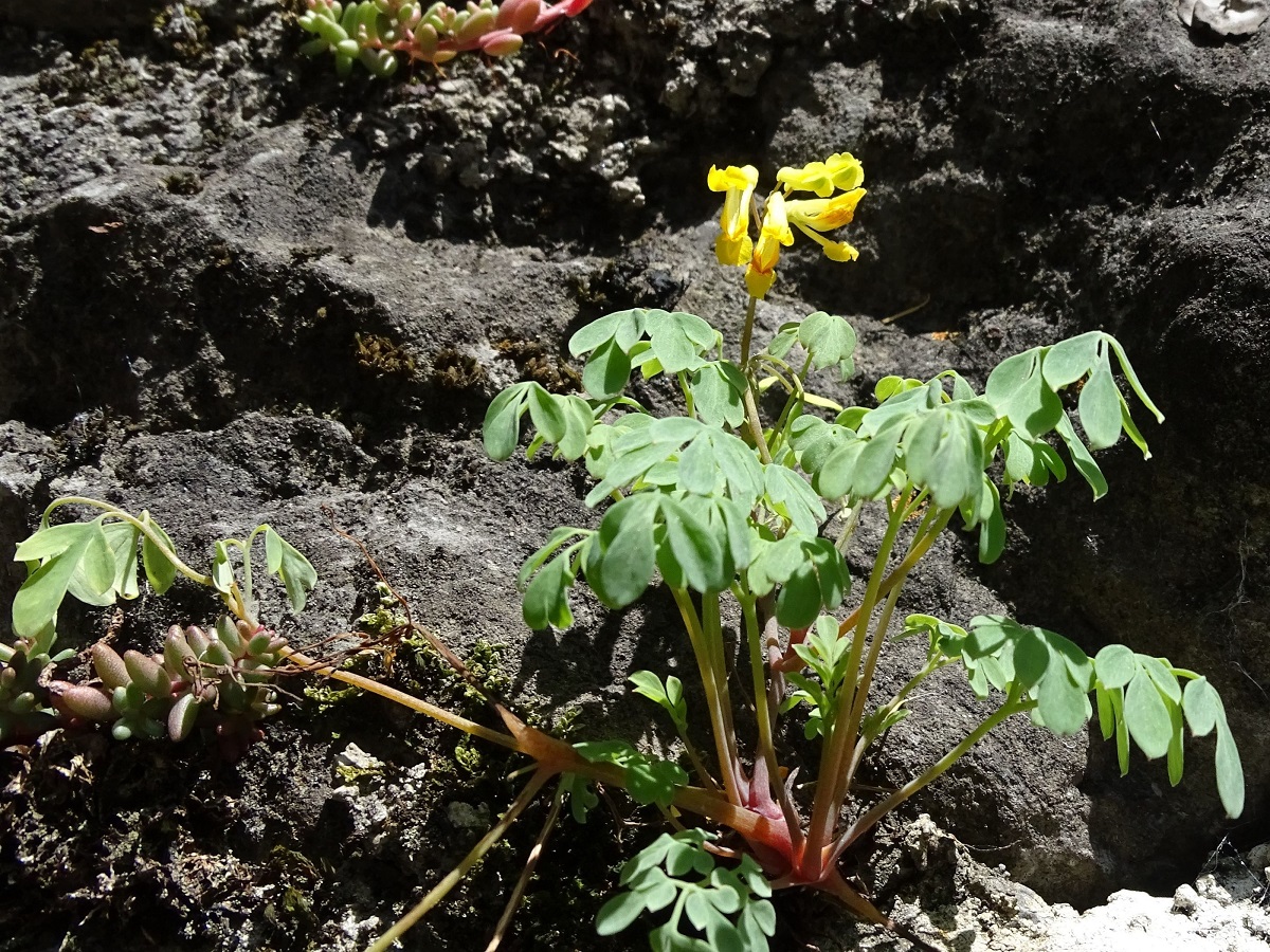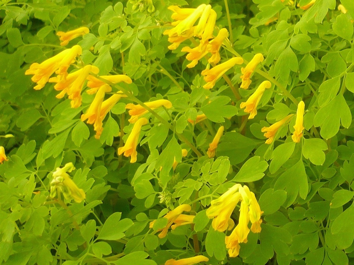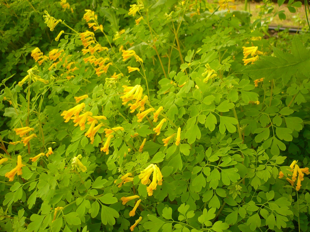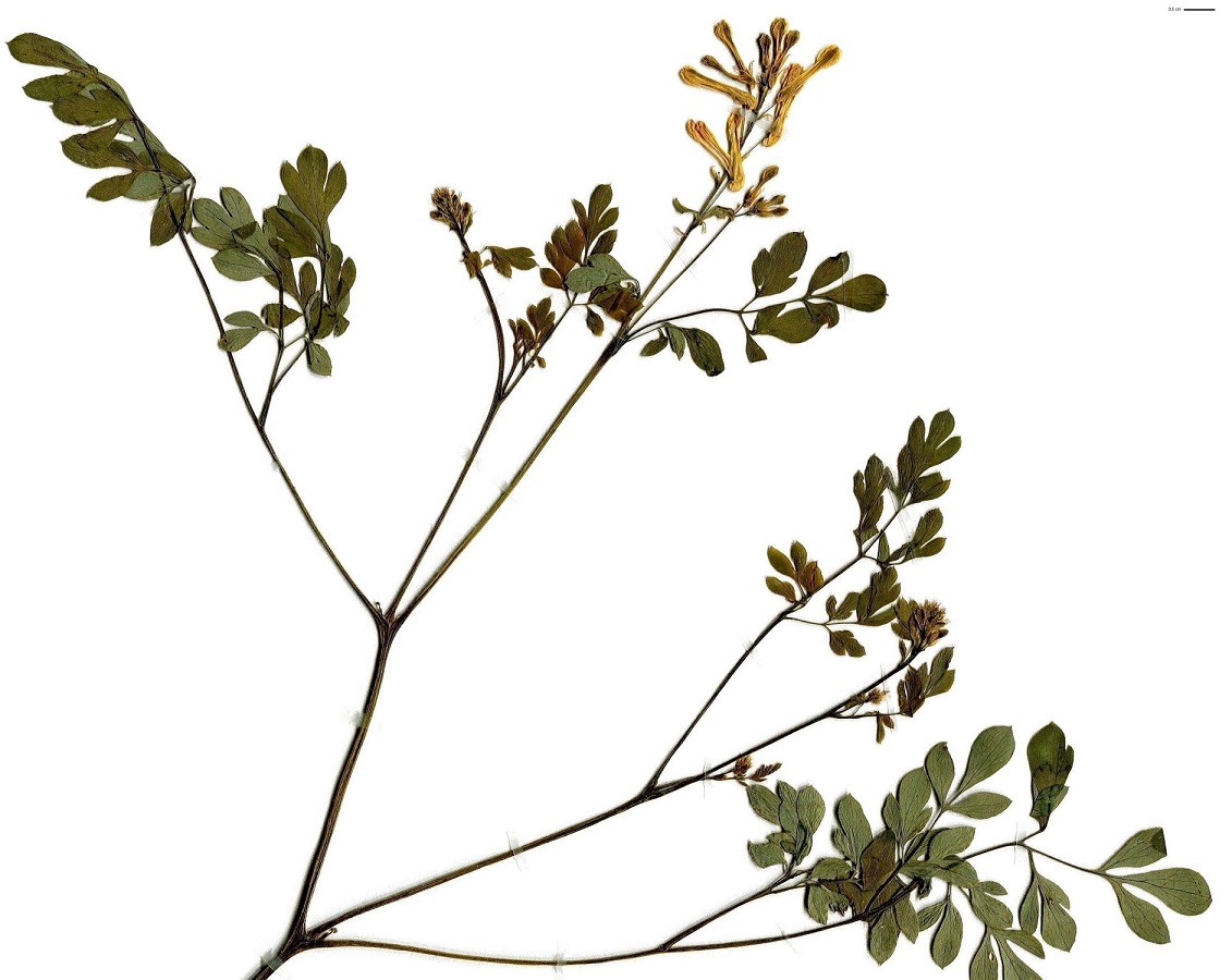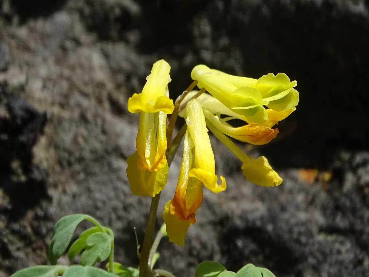 Hc – 2-4 dm – En touffes, feuilles découpées en segments obovales ± lobés, glauques dessous – Grappe de fleurs jaune doré à éperon courbé – Fruit pendant ovoïde aplati