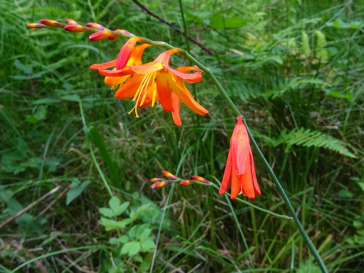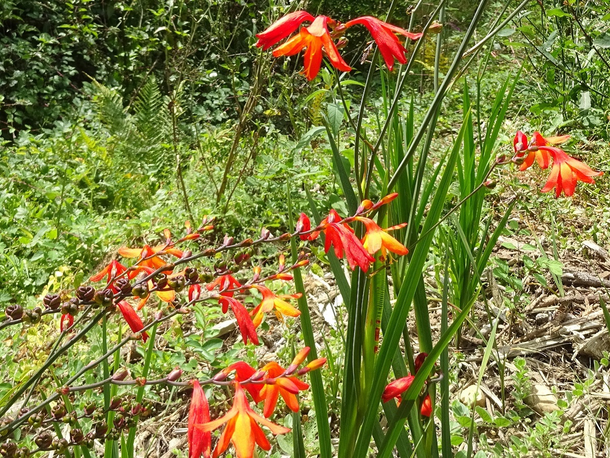 G à corme – 4-8 dm – Feuilles ensiformes étroites – 10-20 Fleurs pendantes, en épi arqué distique, à 6 divisions orangé vif oblongues, soudées en court tube évasé à la base