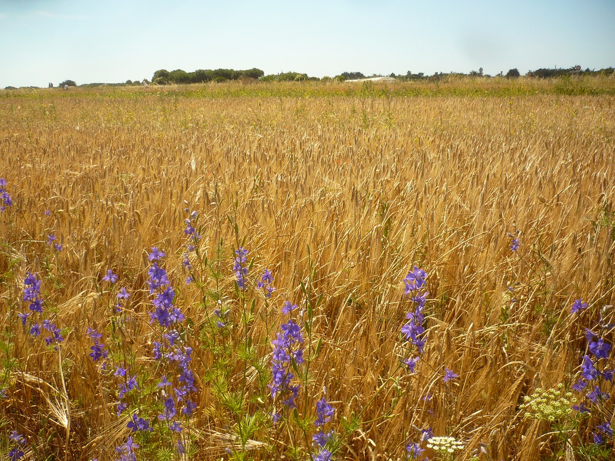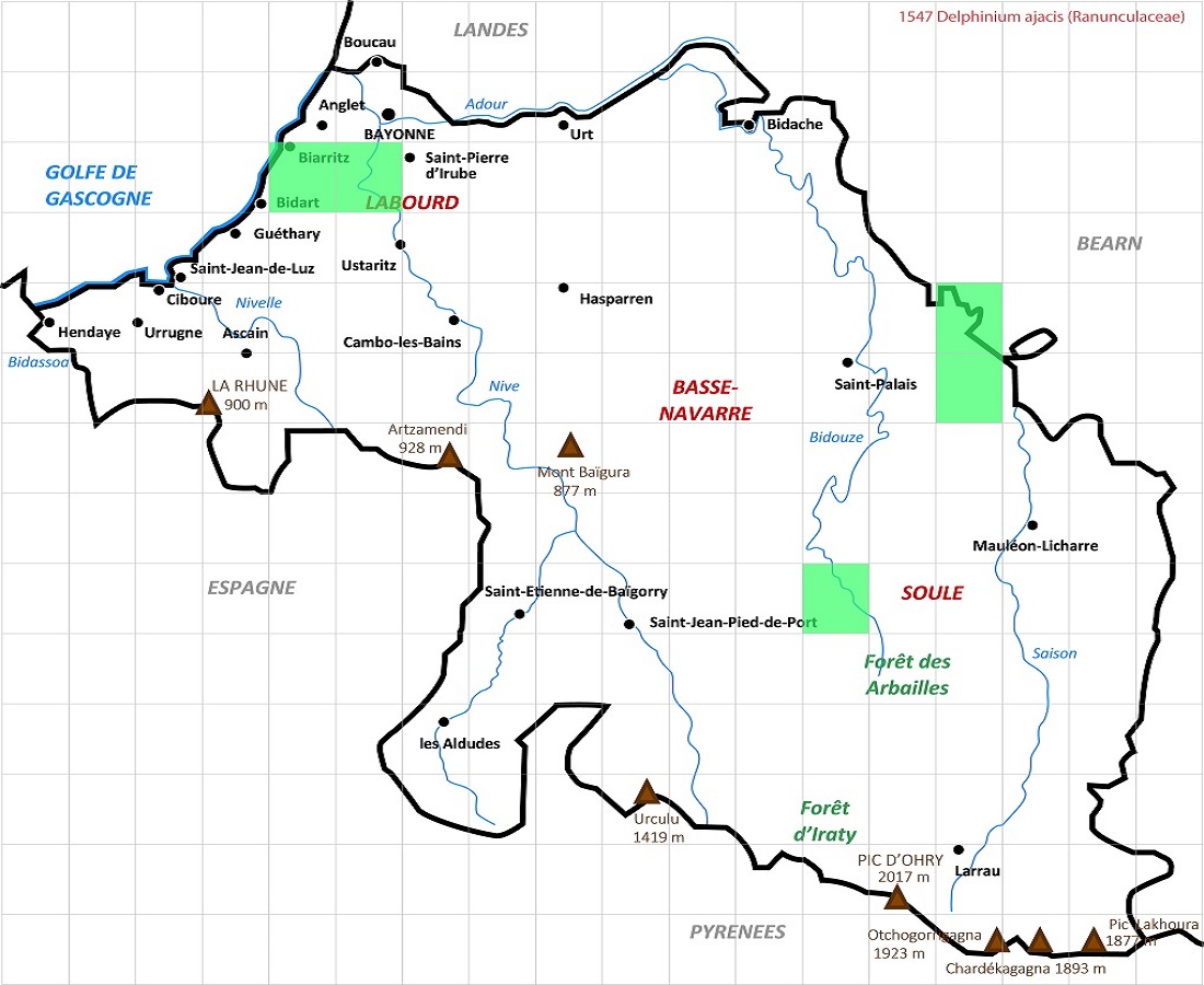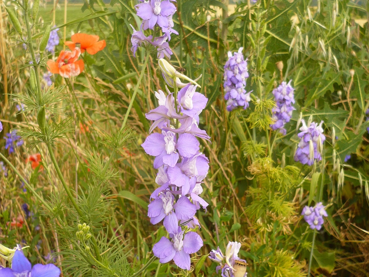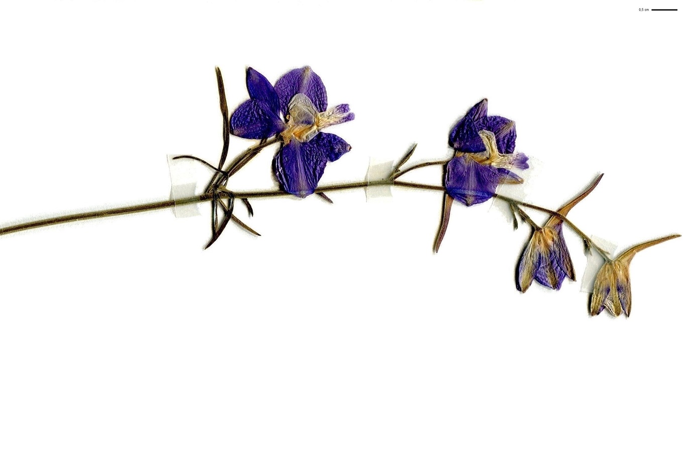 Th – 4-10 dm – Feuilles découpées en lanières filiformes – Grappe de fleurs bleues, roses ou blanches à 5 tépales elliptiques à long éperon courbé – Follicule fin et long, velu