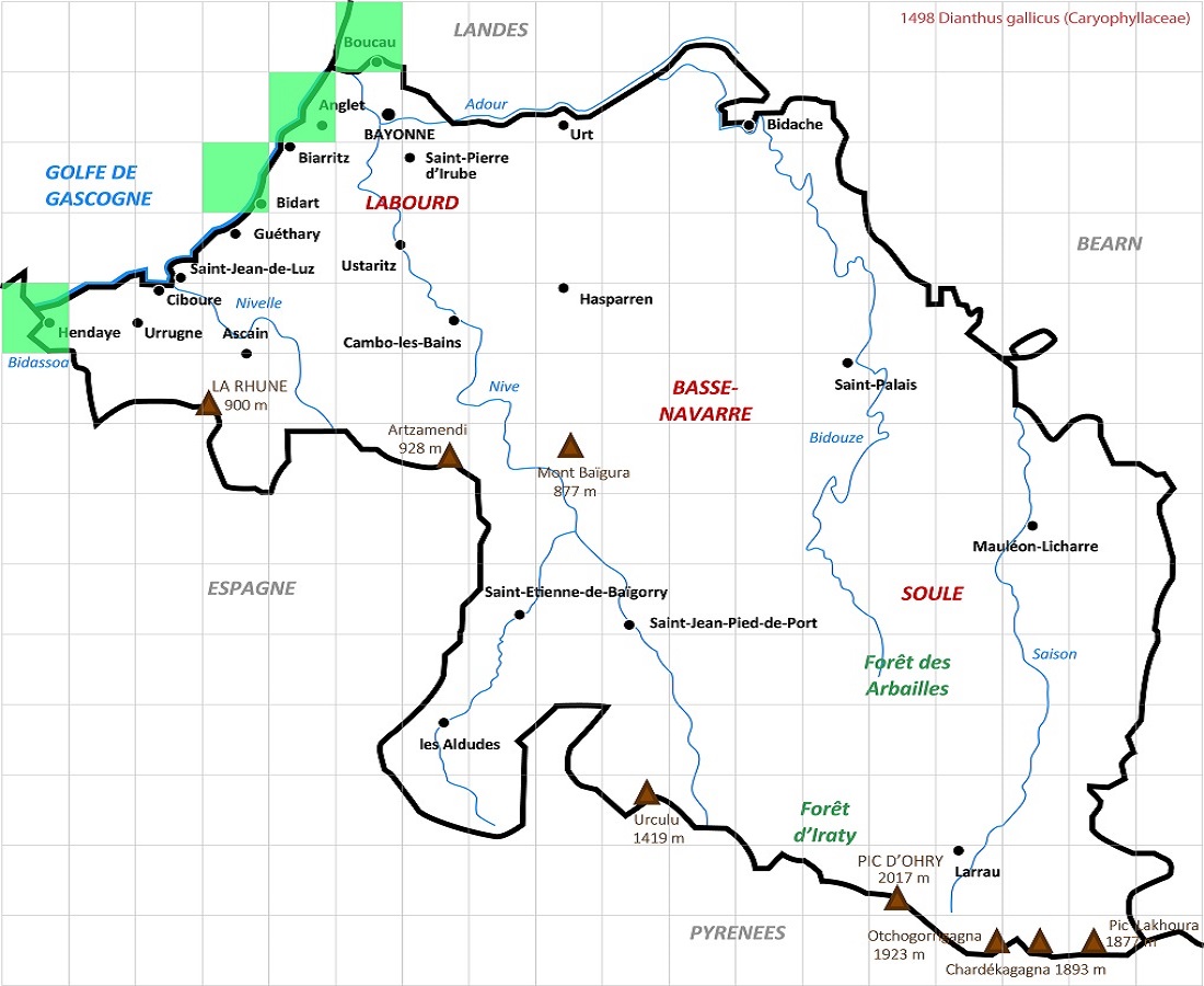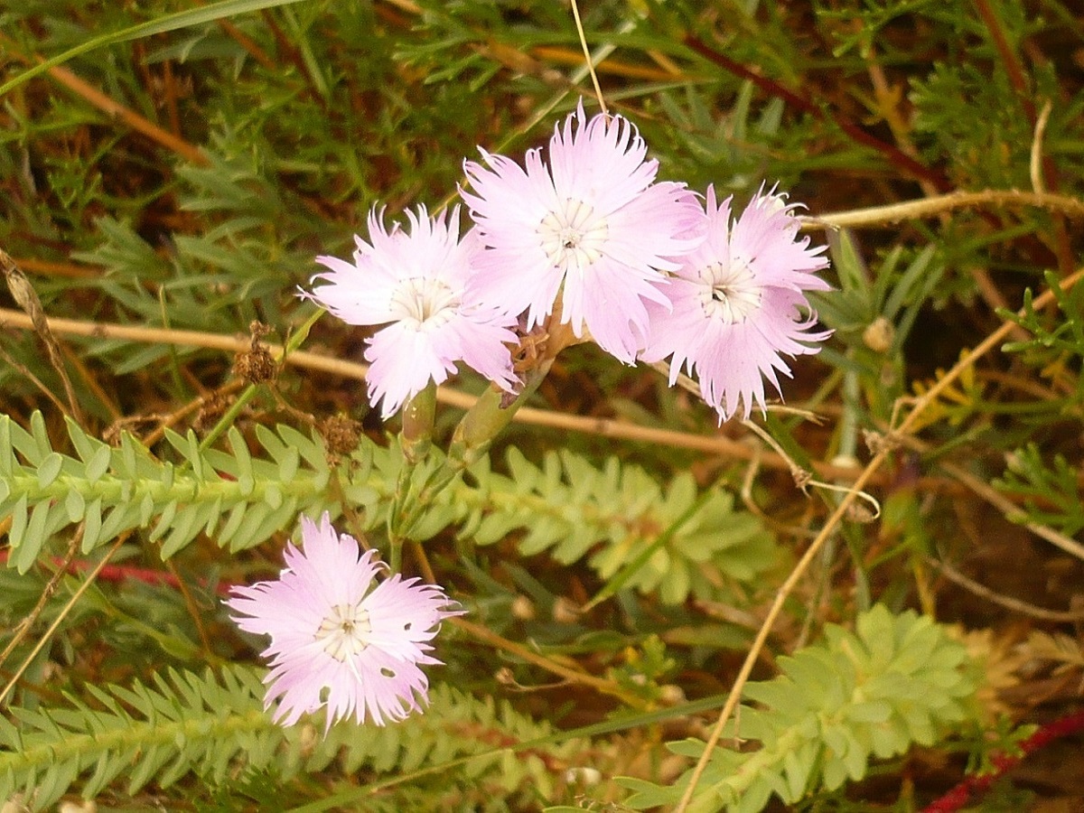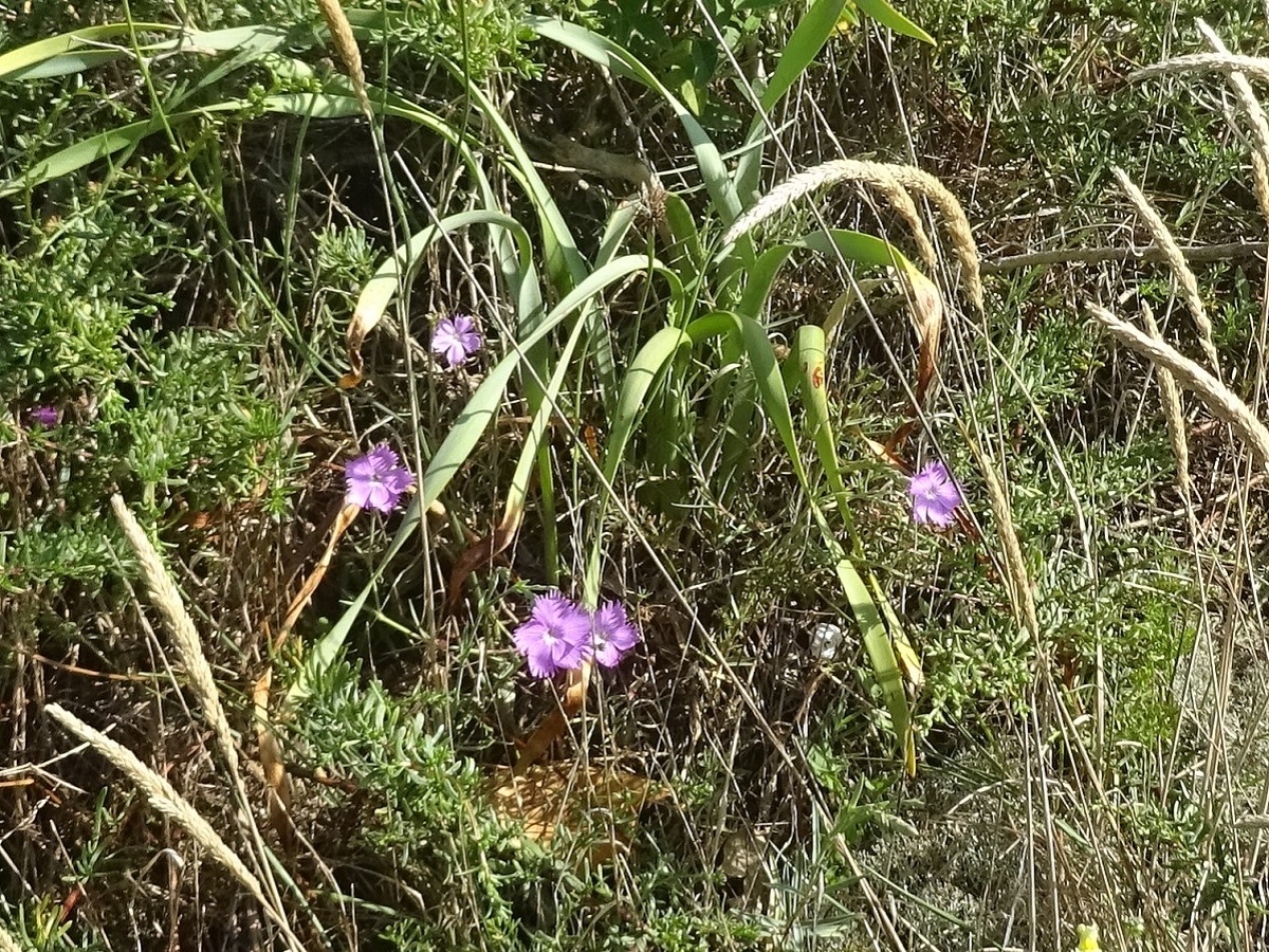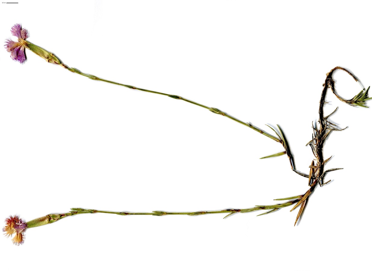 Hc – 1-3 dm – Feuilles opposées courtes, raides, glauques – Fleurs assez grandes à fin parfum d’oeillet, à 5 pétales roses peu profondément laciniés, calicule < à 1/3 du calice