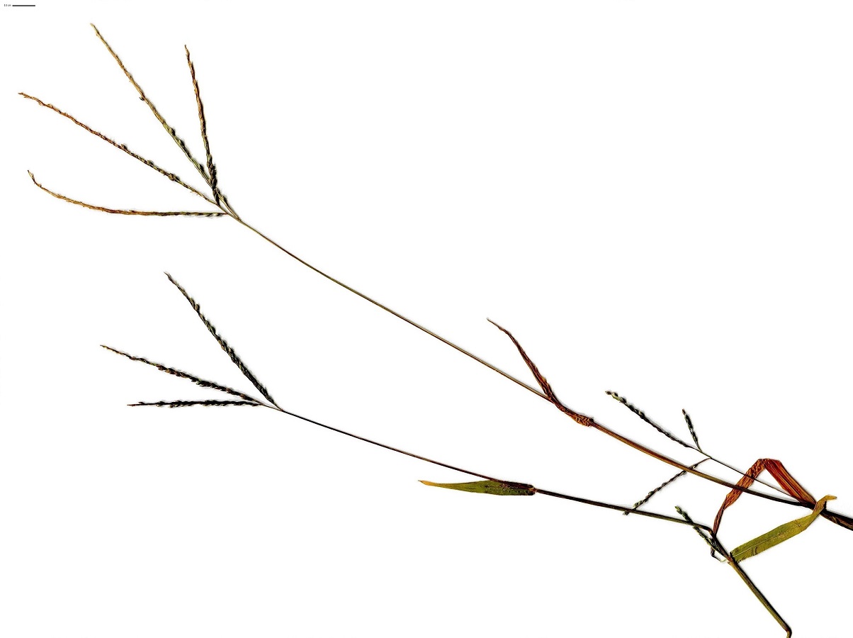 Th – 2-4 dm – Feuilles courtes et gaines glabres, ligule courte dentée – Inflorescence ramifiée en 2-4 épis longs et fins dressés à étalés, épillets petits oblongs, glume < nulle