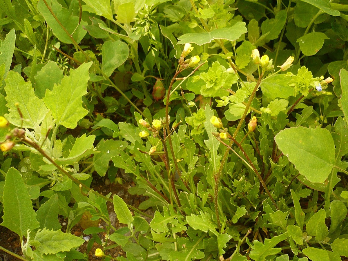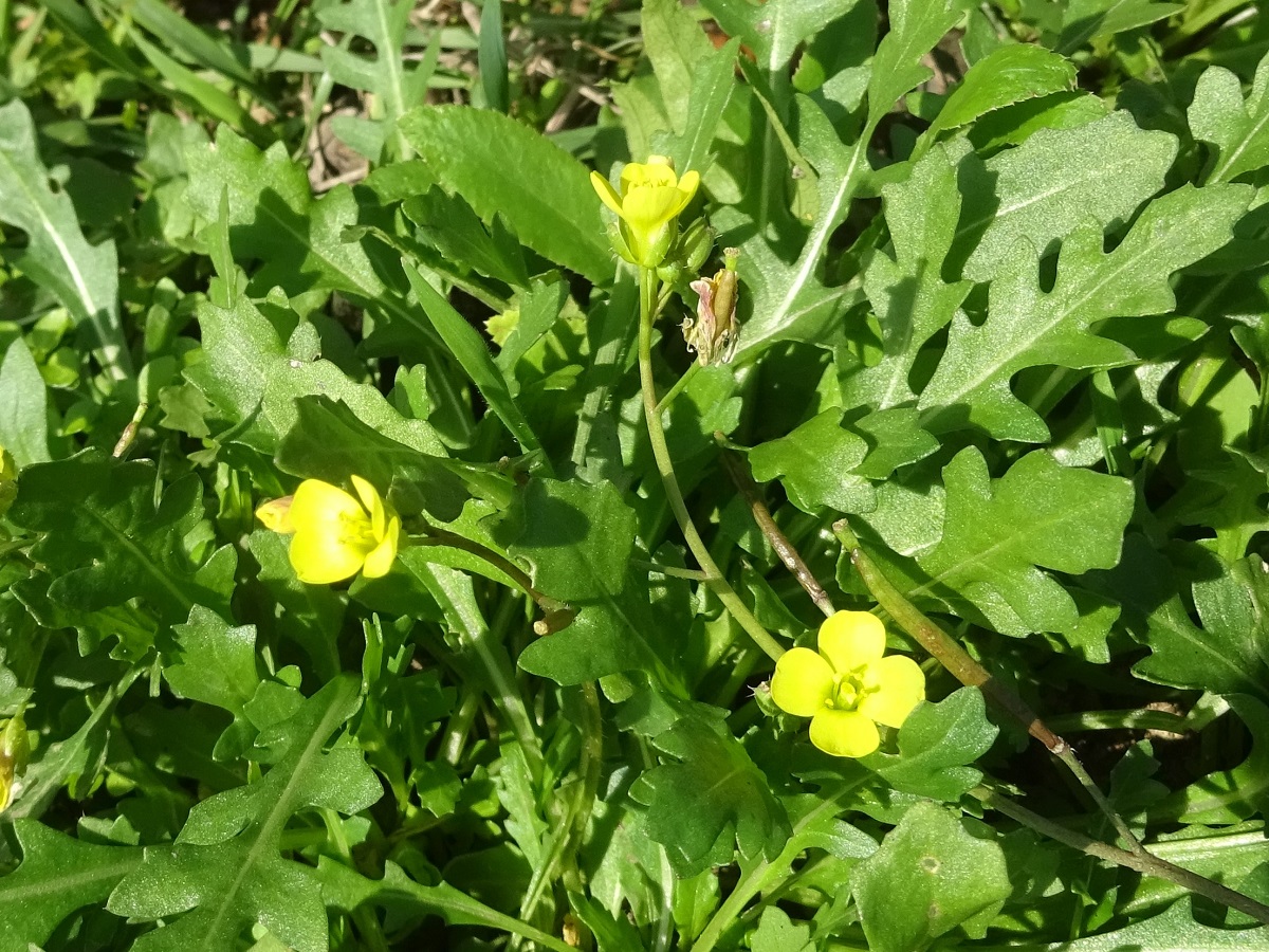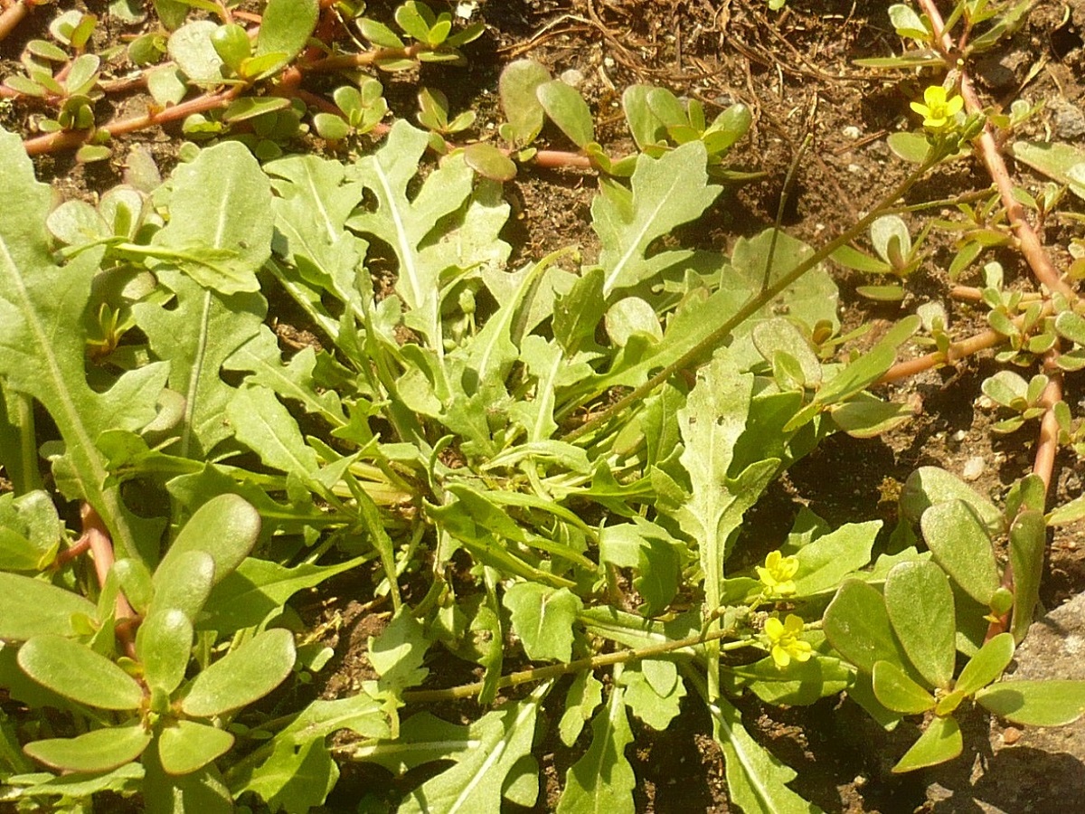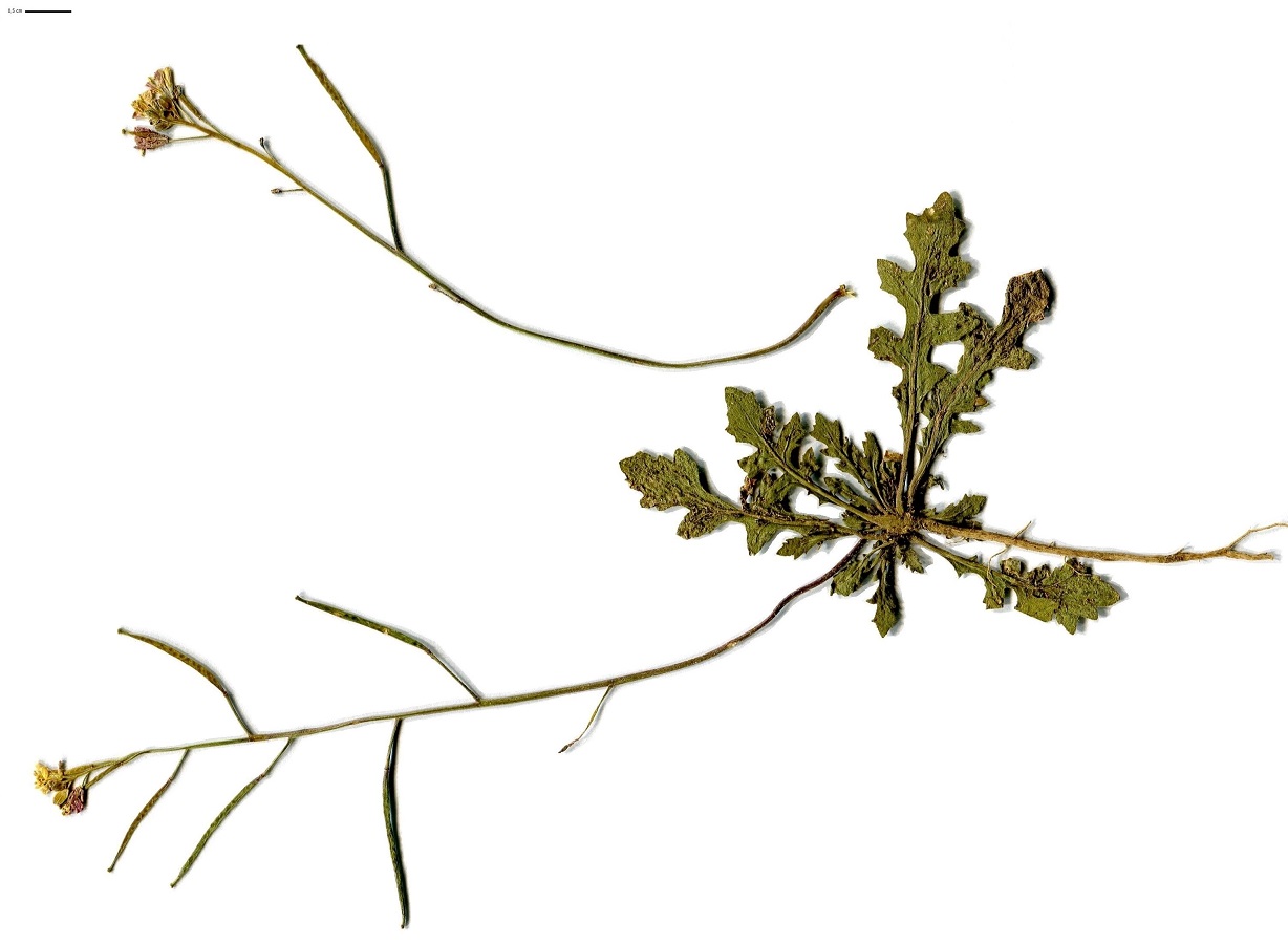 Th – 1,5-4 dm – Feuilles presque toutes en rosette basale, sinuées-dentées à pennatifides – Fleurs à 4 pétales jaunes de L 5-8 mm – Siliques étalées-dressées à bec court