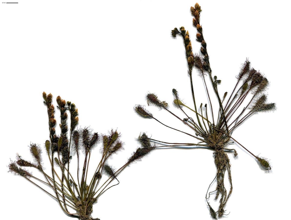 Hc – 0,5-1 dm – Rosette ± dressée de petites feuilles obovales à longs poils glanduleux rouges, pétiolées – Hampe courte de 3-7 petites fleurs blanches – Petite capsule piriforme