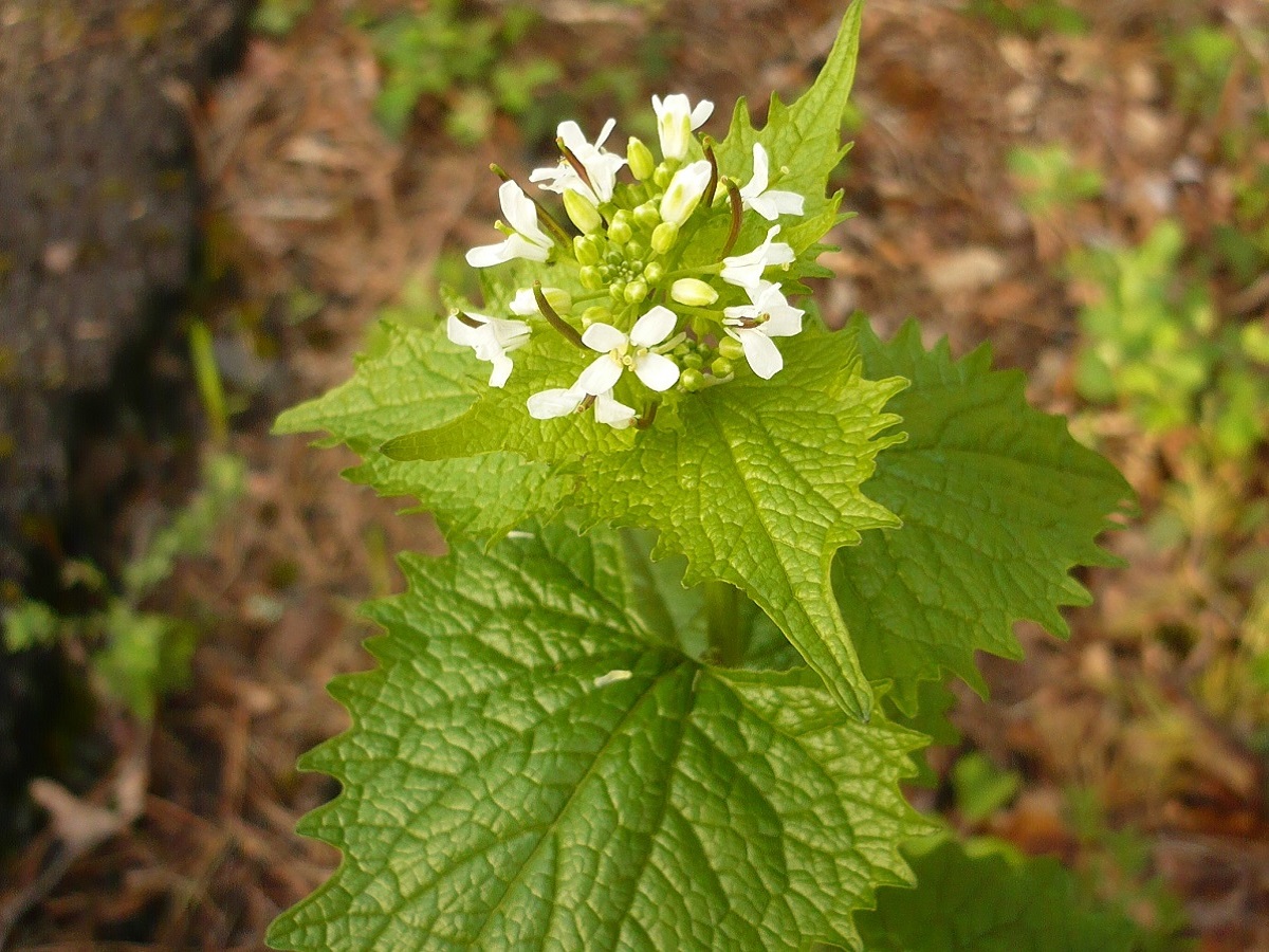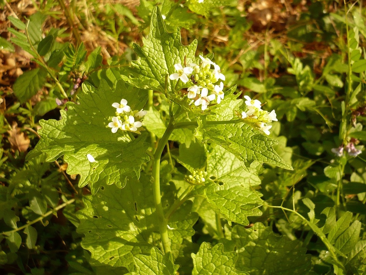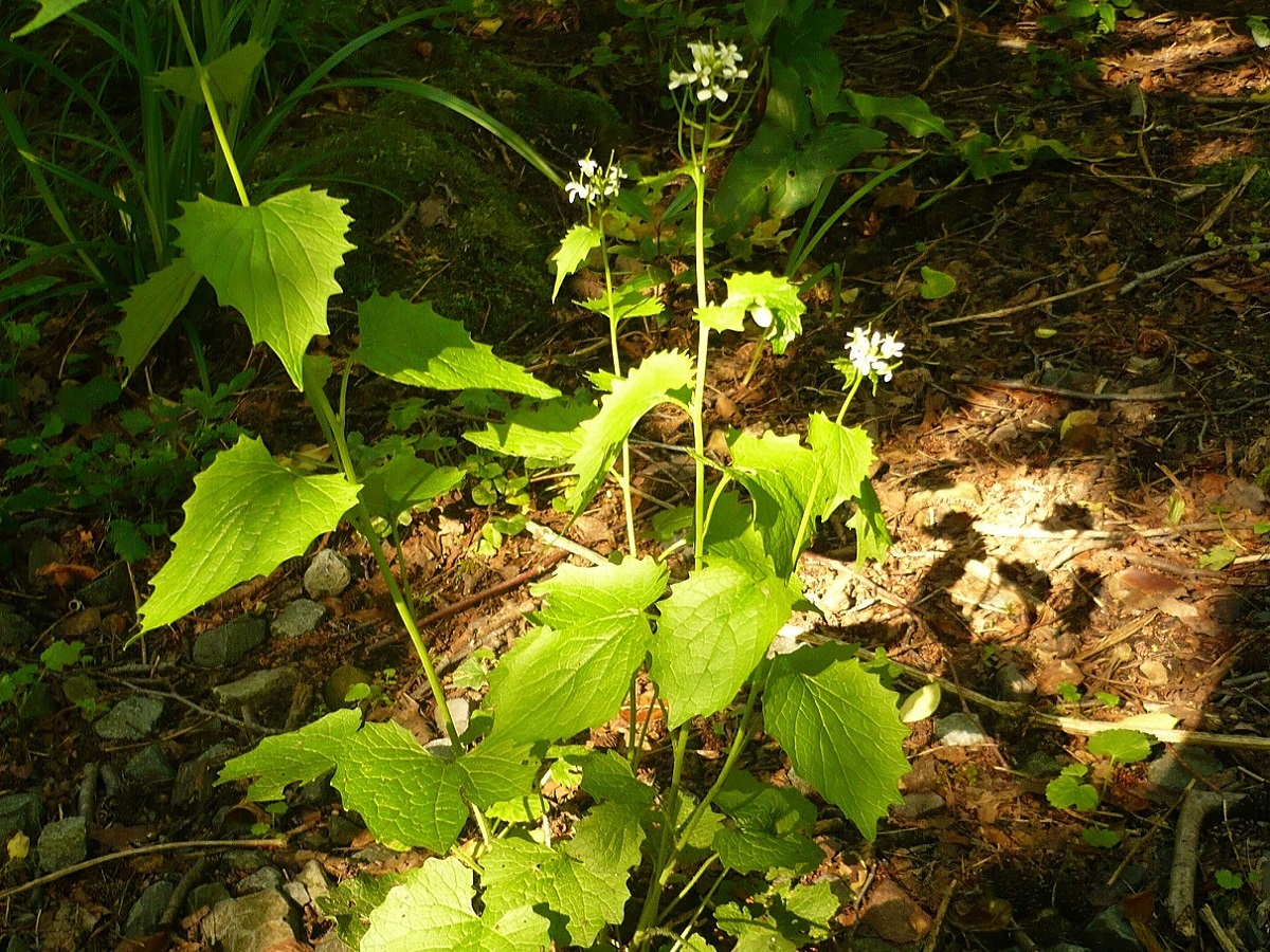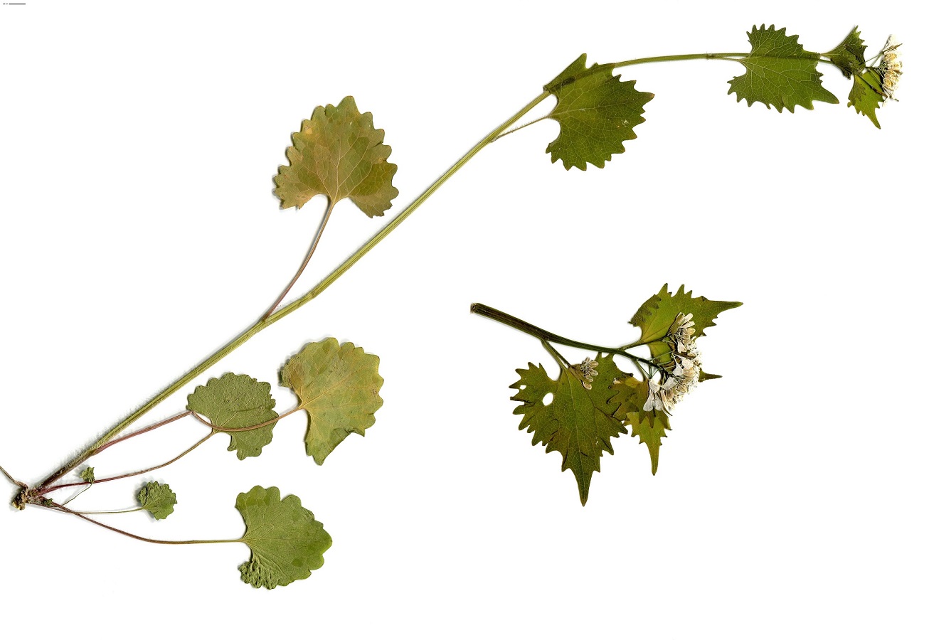 Th/Hc – 2-10 dm – Assez robuste, odeur d’ail, feuilles réniformes ou cordées en triangle, dentées, les < à long pétiole – Fleurs blanches à 4 pétales – Siliques cylindriques longues