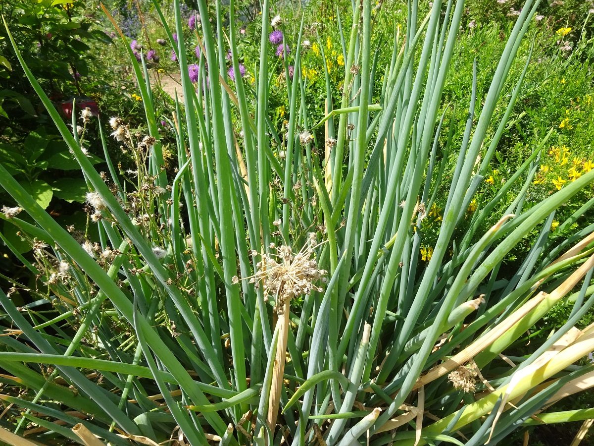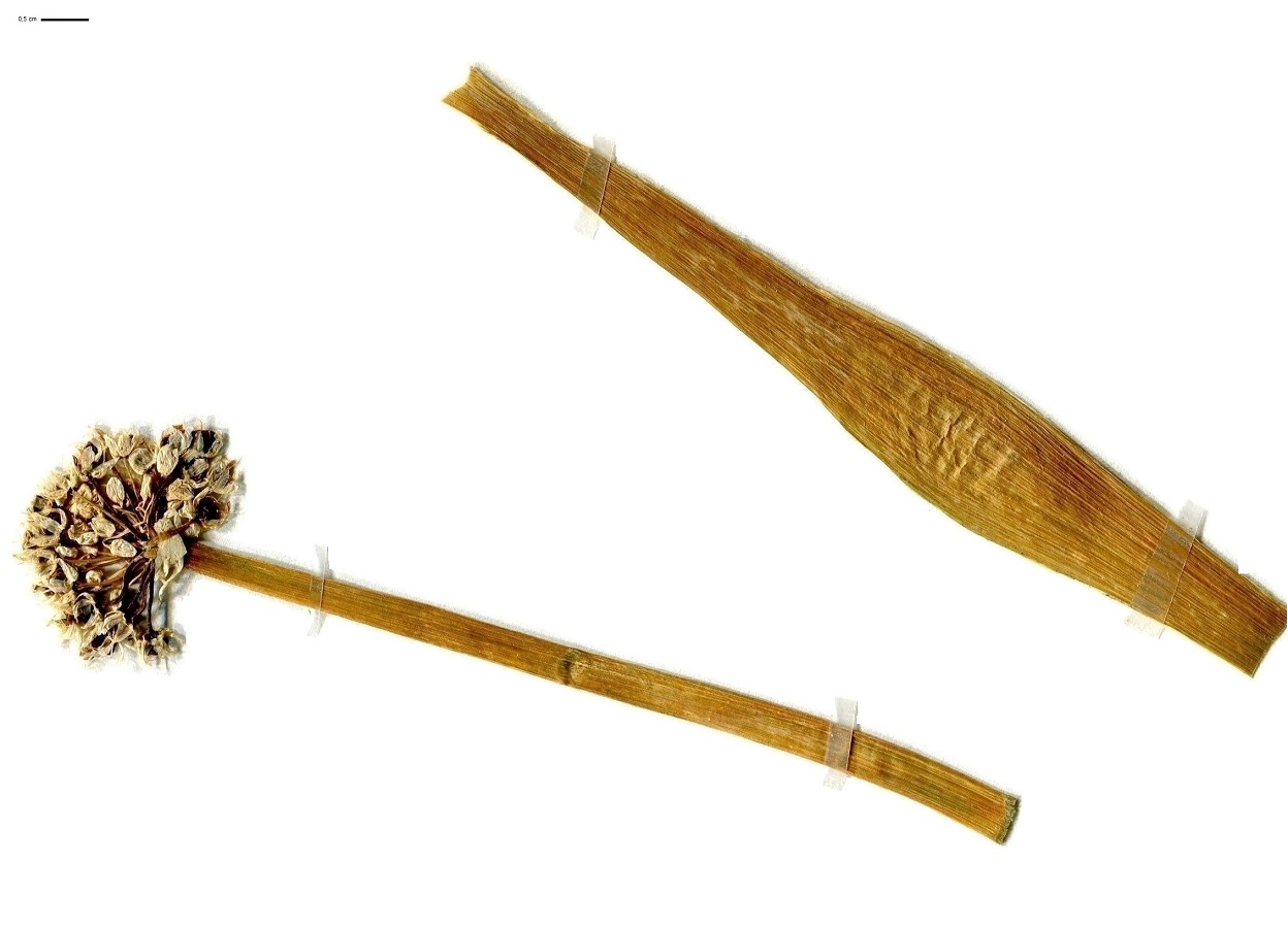 G à bulbe – 5-10 dm – Tige enflée, feuilles cylindriques creuses, à odeur forte – Fleurs en grosse tête globuleuse très dense, à 6 tépales blancs, étamines exsertes à 2 dents basales