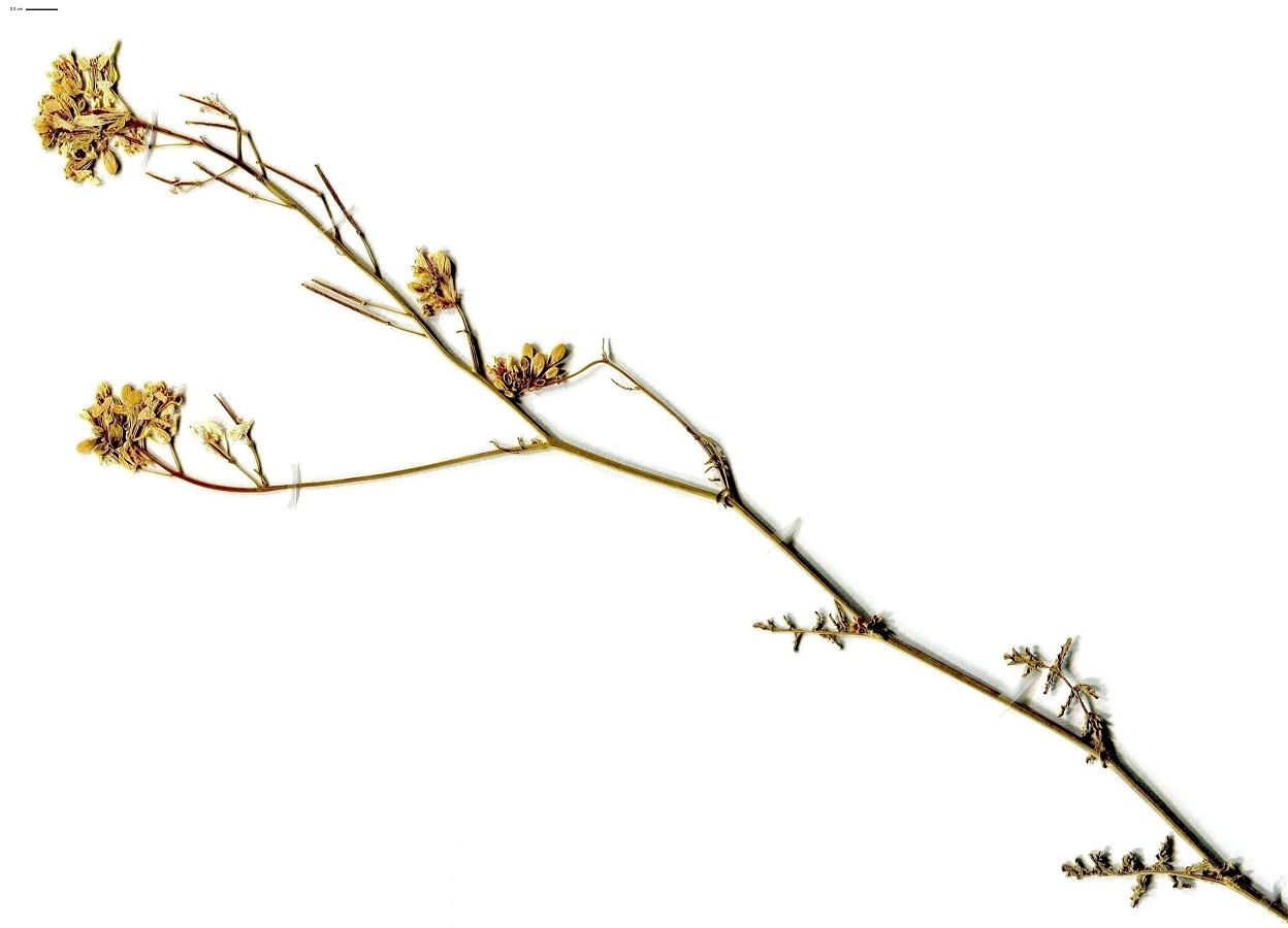 Th/Hc/Ch – 4-8 dm – Feuilles pennatiséquées à segments étroits – Fleurs jaunes à 4 pétales à long onglet et sépales écartés – Nombreuses siliques fines, écartées à dressées