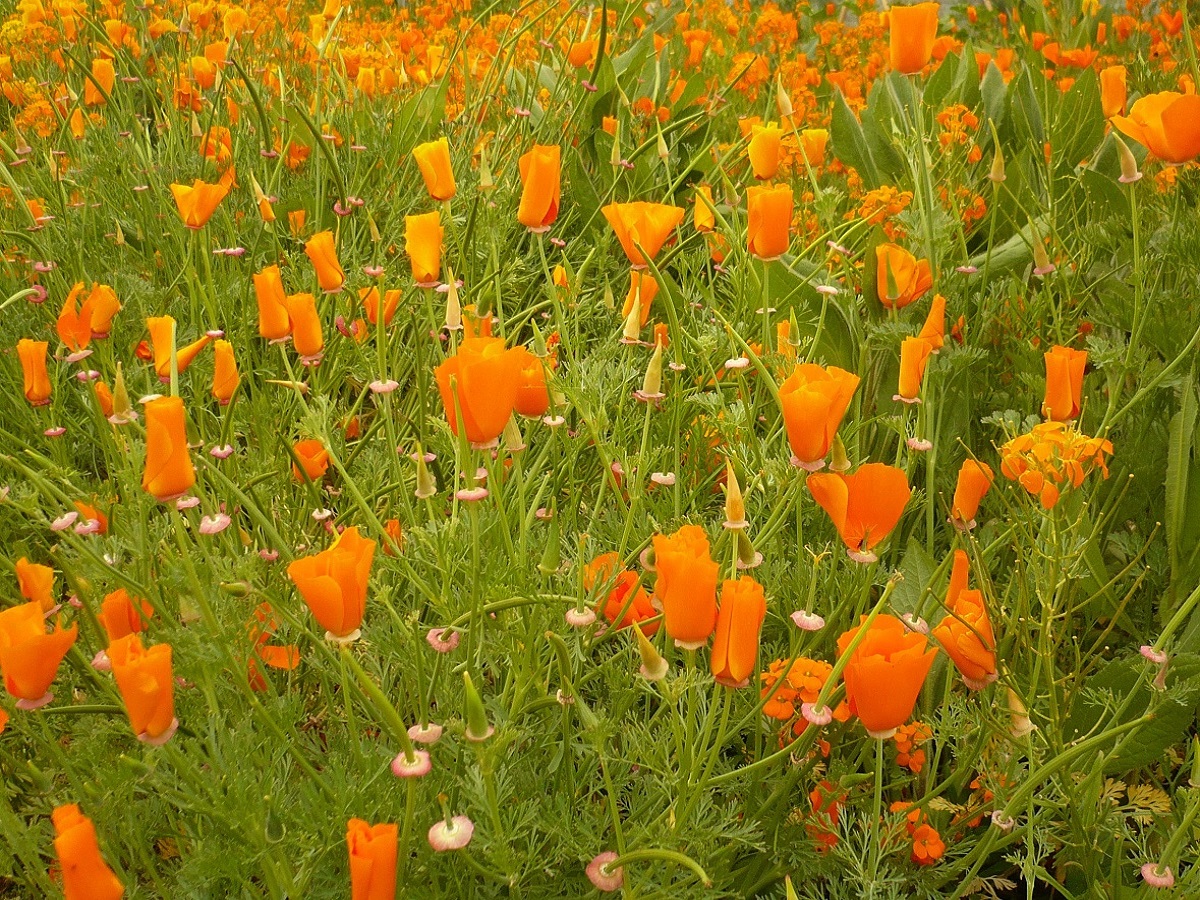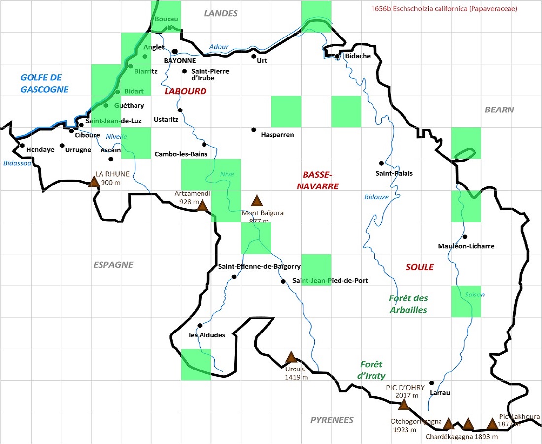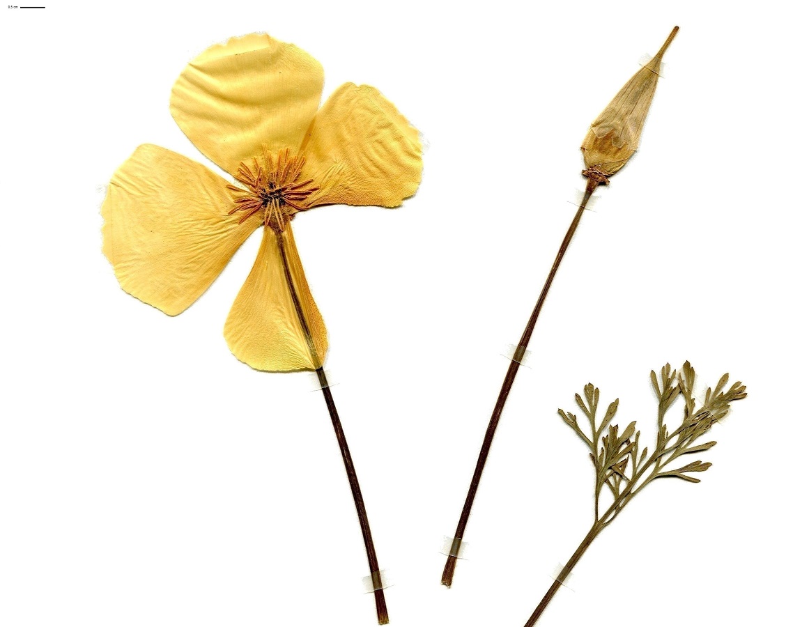 Th/Hc – 2-6 dm – Feuilles finement découpées, glauques – Grande fleur à 4 pétales orangés, sépales soudés en capuchon – Longue silique arquée striée, graines globuleuses