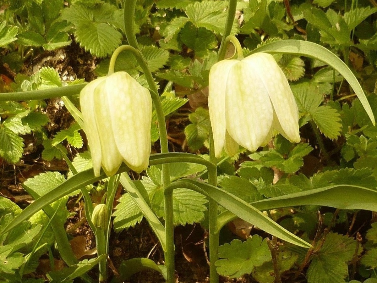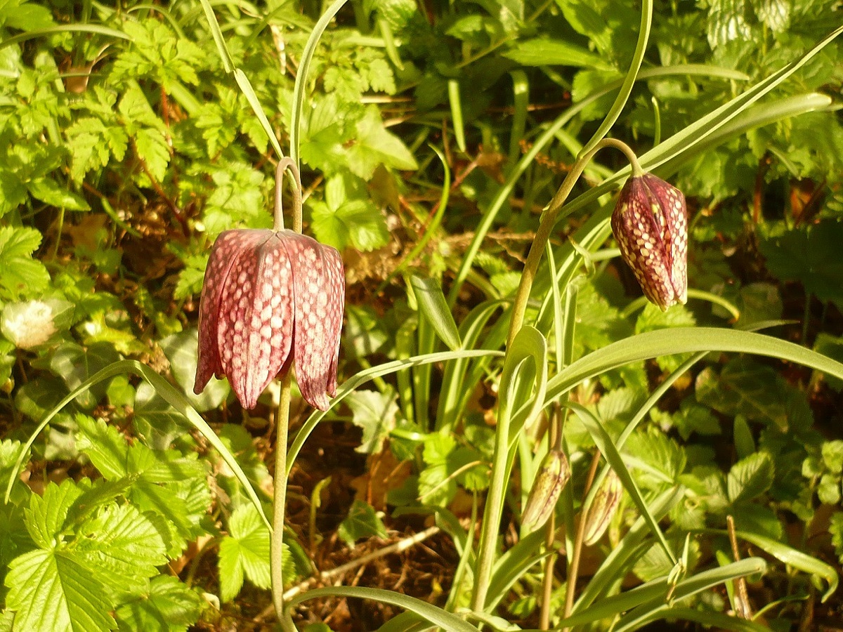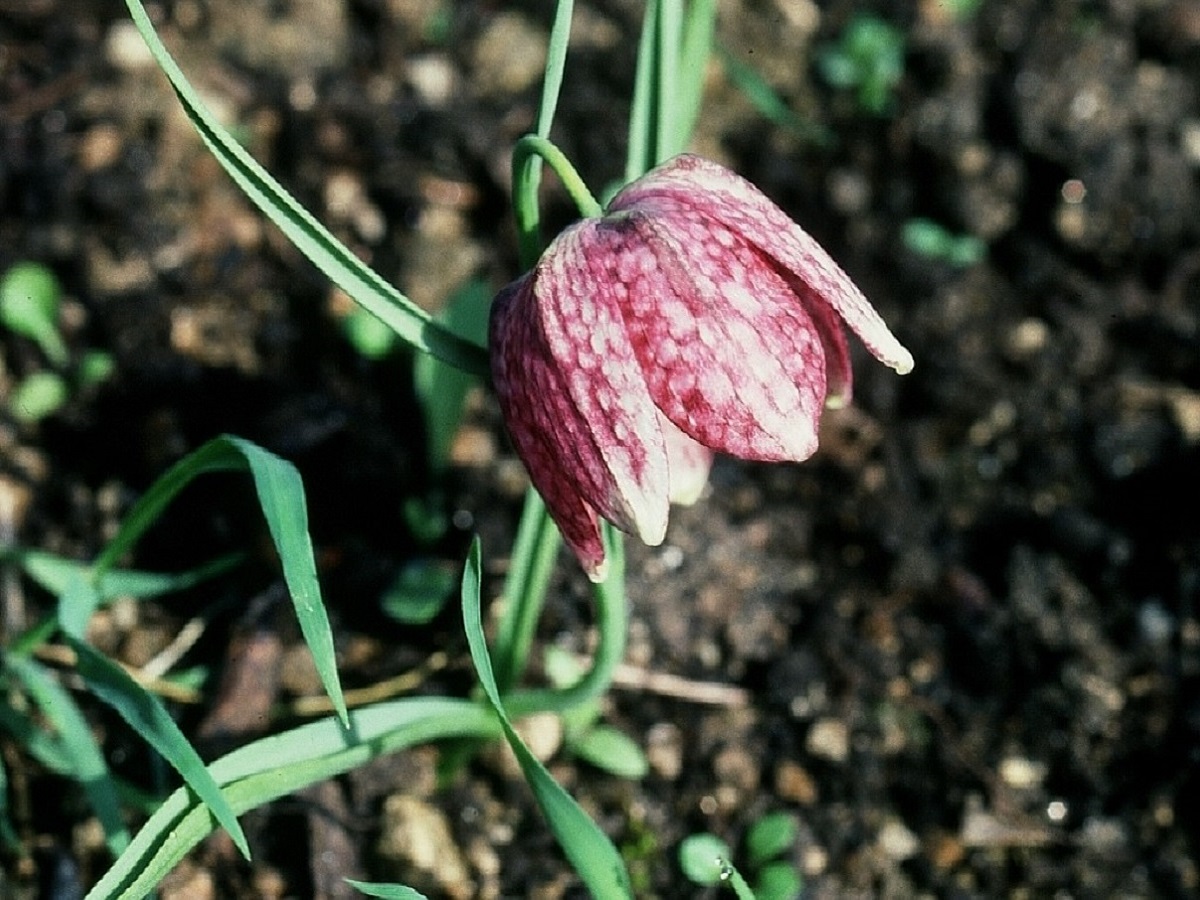 G à bulbe – 2-5 dm – 3-5 Feuilles en gouttière, espacées – Grande fleur penchée en cloche à 6 tépales, réticulés en damier pourpre et blanc – Capsule obovoïde dressée