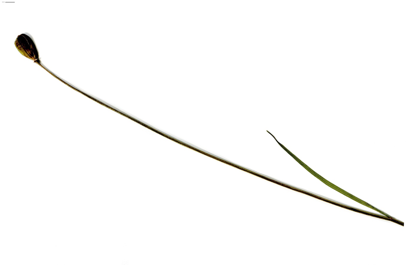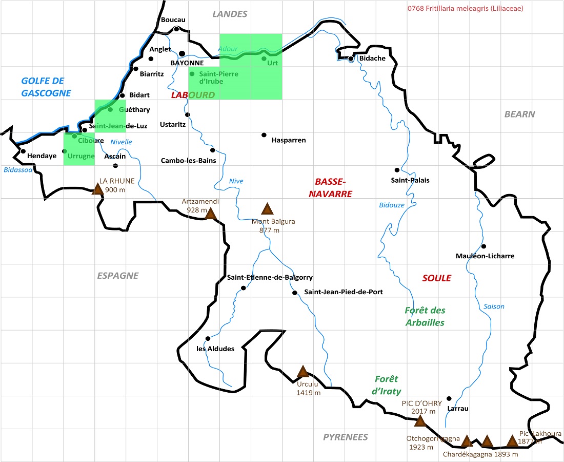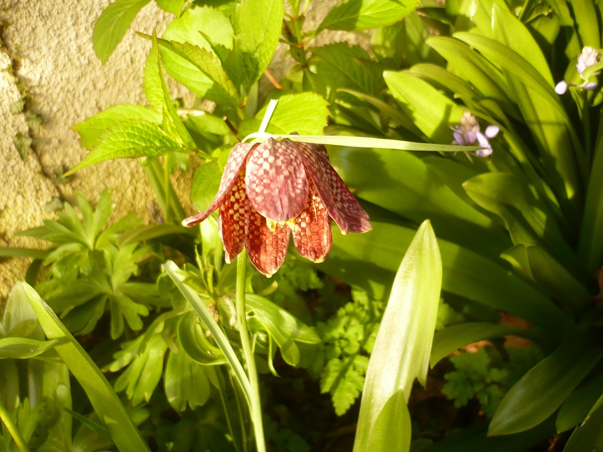 G à bulbe – 2-5 dm – 3-5 Feuilles en gouttière, espacées – Grande fleur penchée en cloche à 6 tépales, réticulés en damier pourpre et blanc – Capsule obovoïde dressée