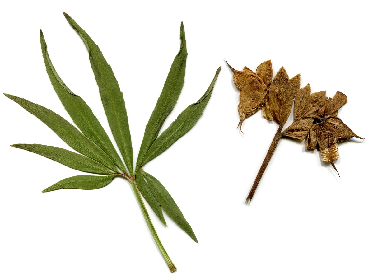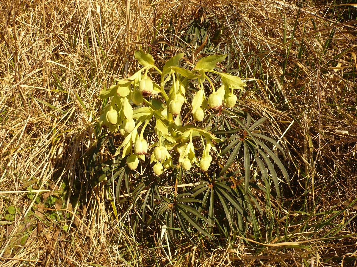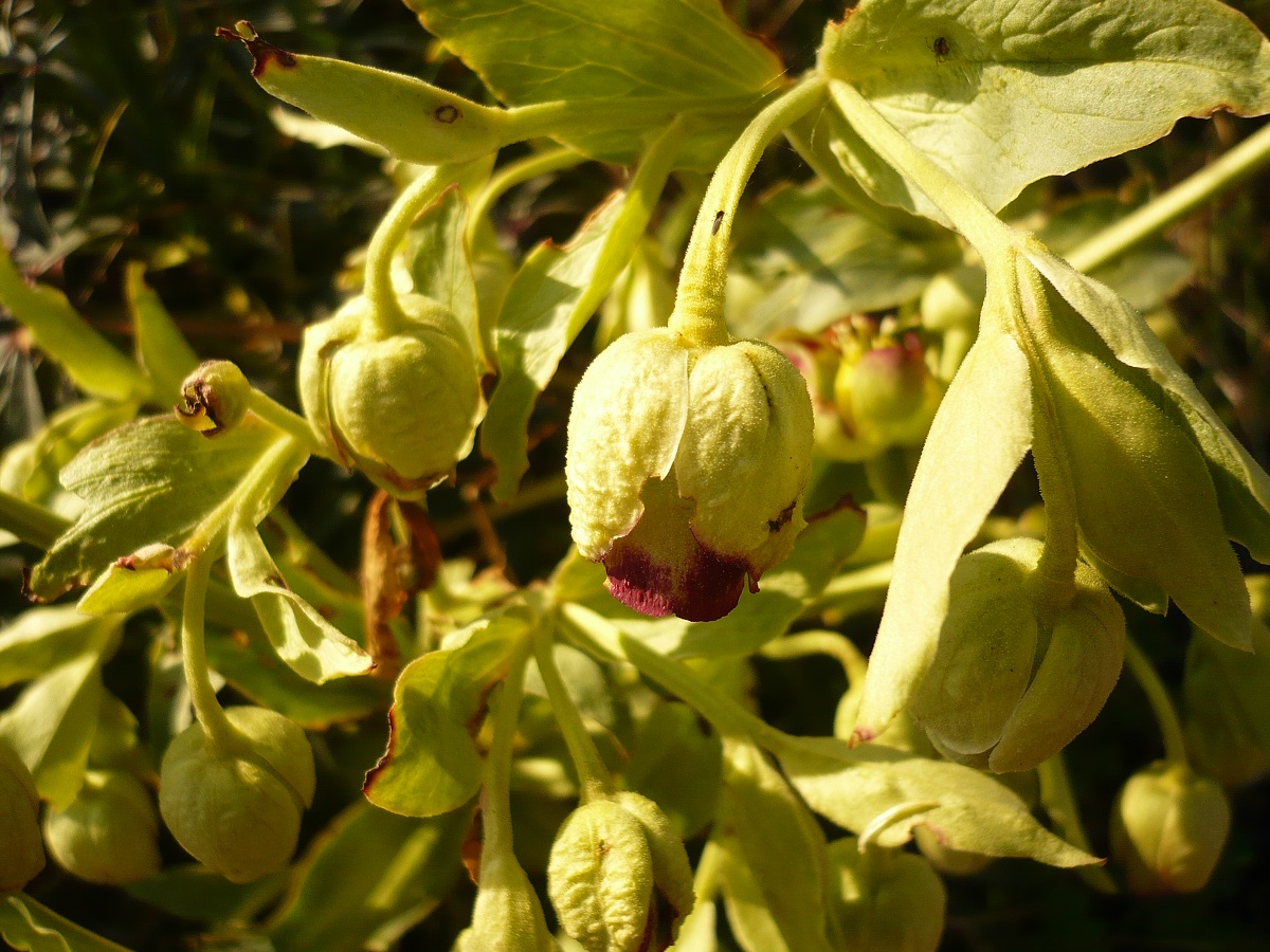 Ch – 3-8 dm – Feuilles pédalées à 7-11 lobes étroitement lancéolés dentés – Fleurs de Ø ≃ 2 cm campanulées à 5 tépales vert-jaunâtre à marge ± pourpre – Follicules à long bec
