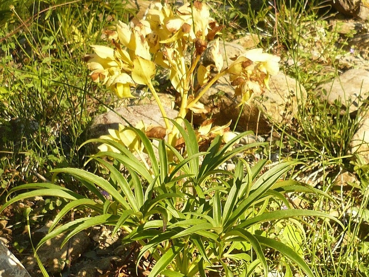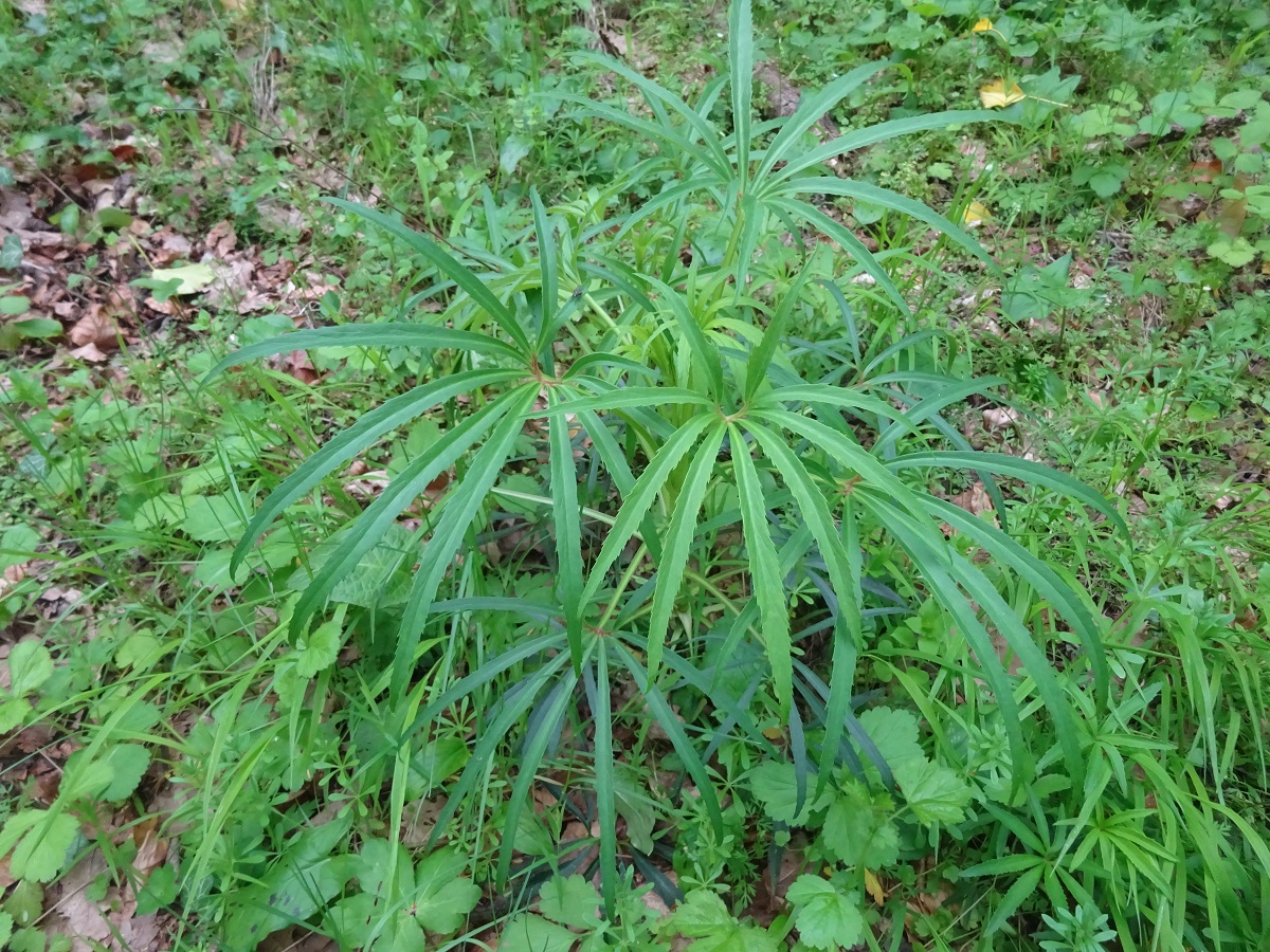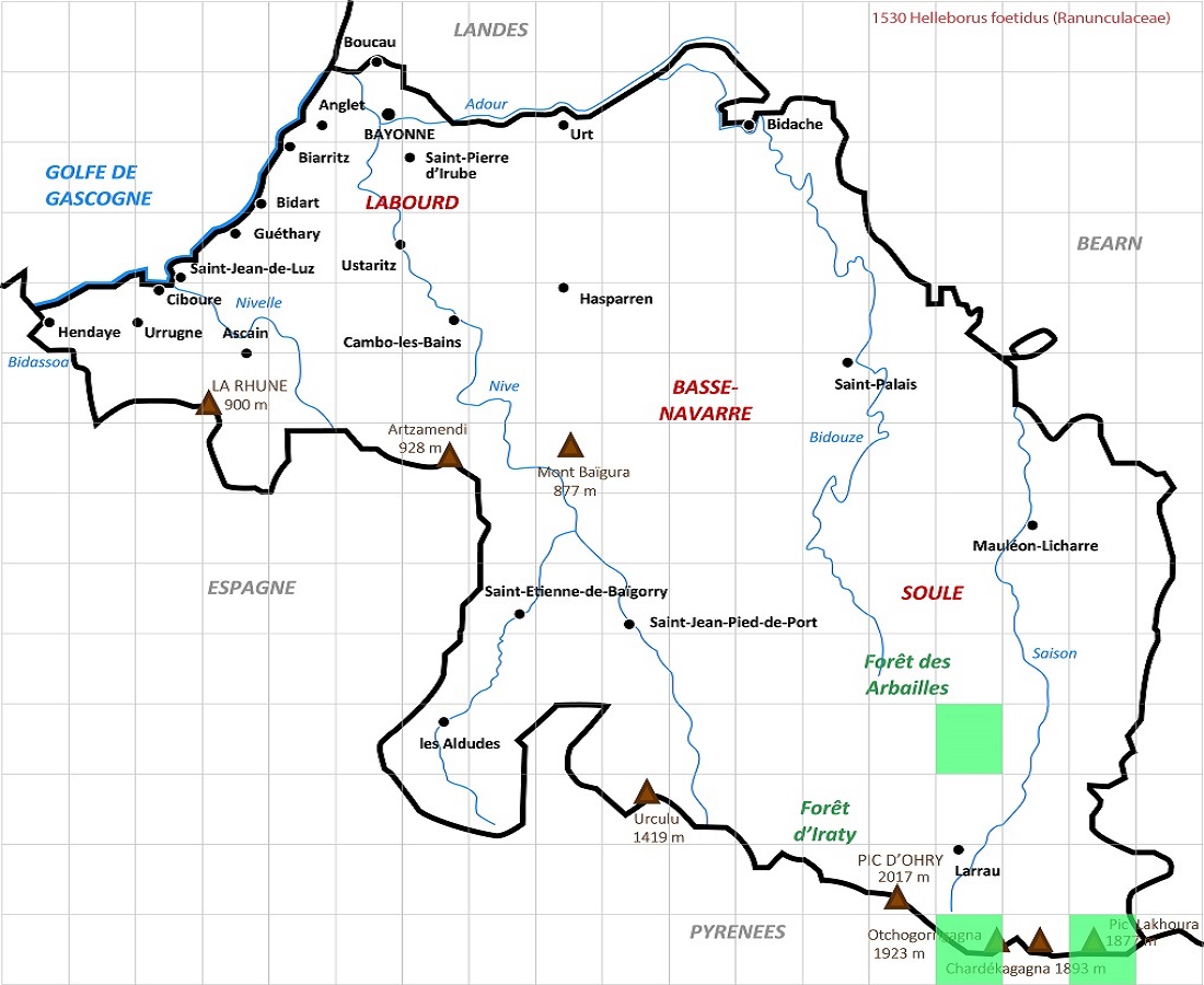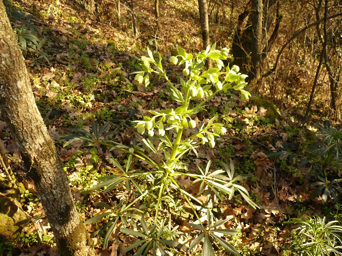 Ch – 3-8 dm – Feuilles pédalées à 7-11 lobes étroitement lancéolés dentés – Fleurs de Ø ≃ 2 cm campanulées à 5 tépales vert-jaunâtre à marge ± pourpre – Follicules à long bec