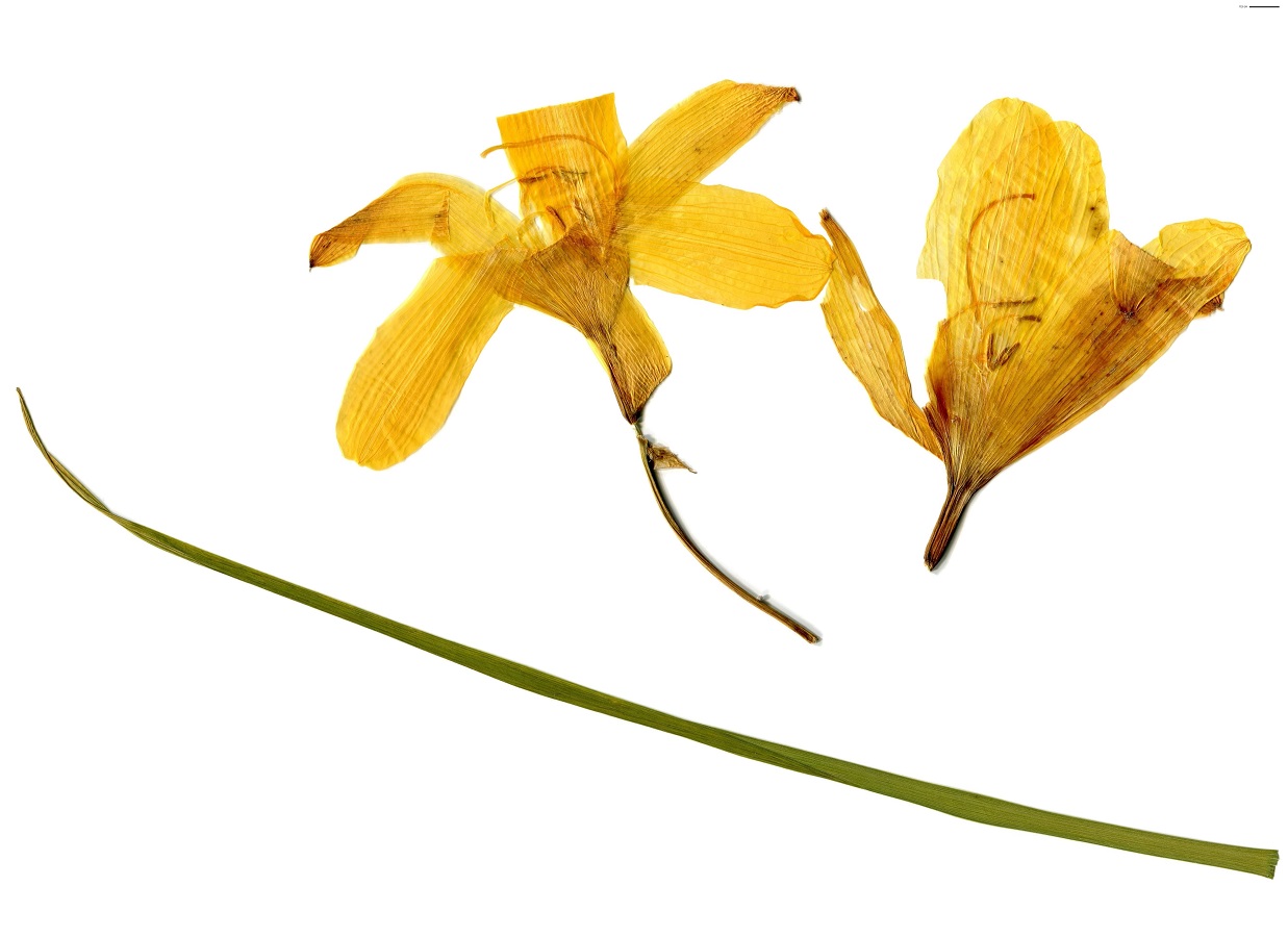 G à rhizome – 4-8 dm – Feuilles basales longues – Grandes fleurs en trompette jaune citron, odorantes, à 6 tépales récurvés, à marge plane – Capsule ovoïde triloculaire