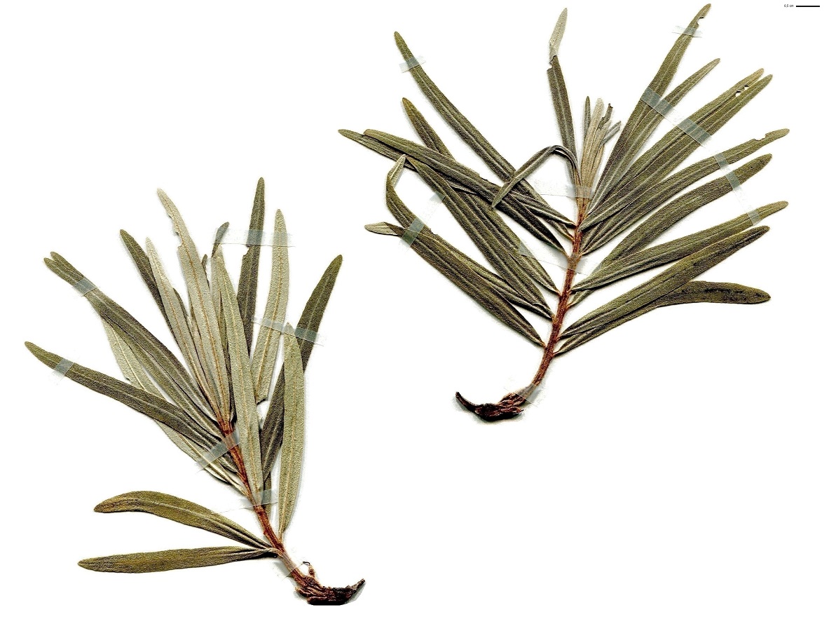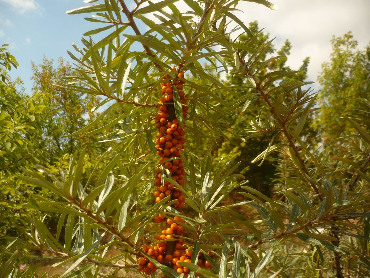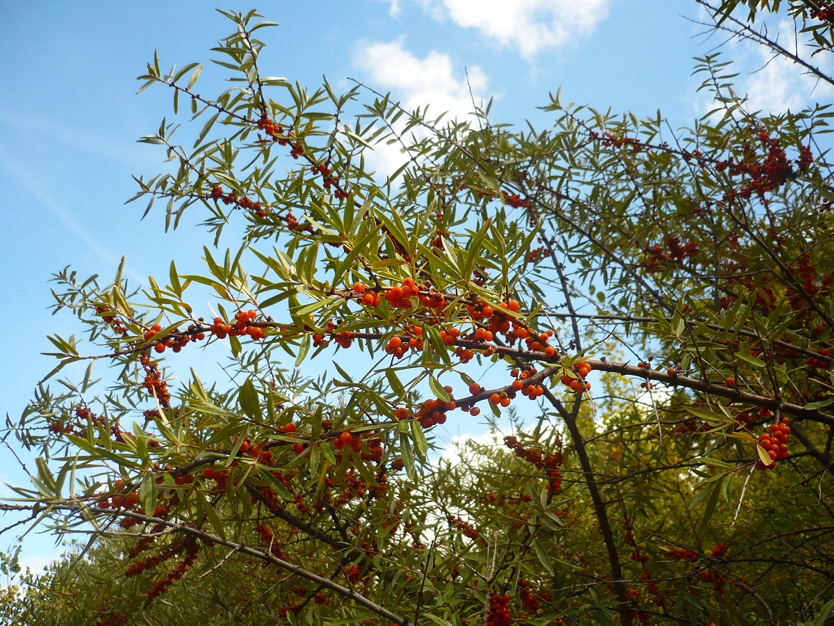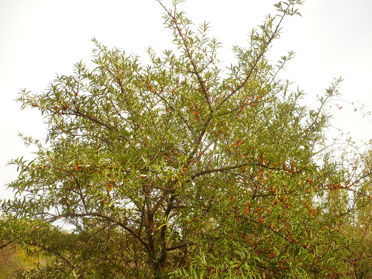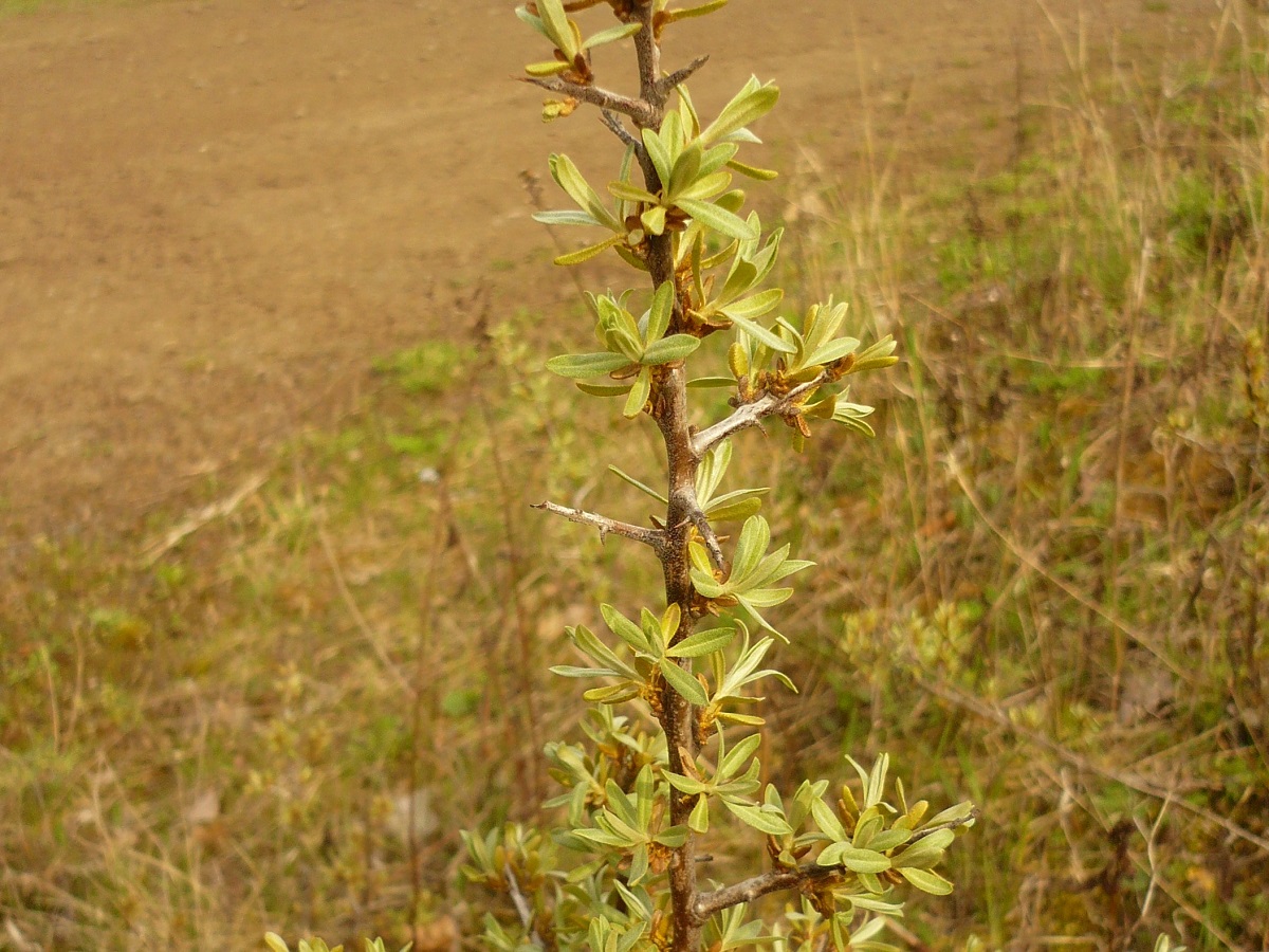 NPh – 1-3 m – Entrenoeuds longs épineux, feuilles linéaires-lancéolées argentées dessous – Petites fleurs axillaires ♀ et ♂, précoces – Fruit ± globuleux rouge-orangé